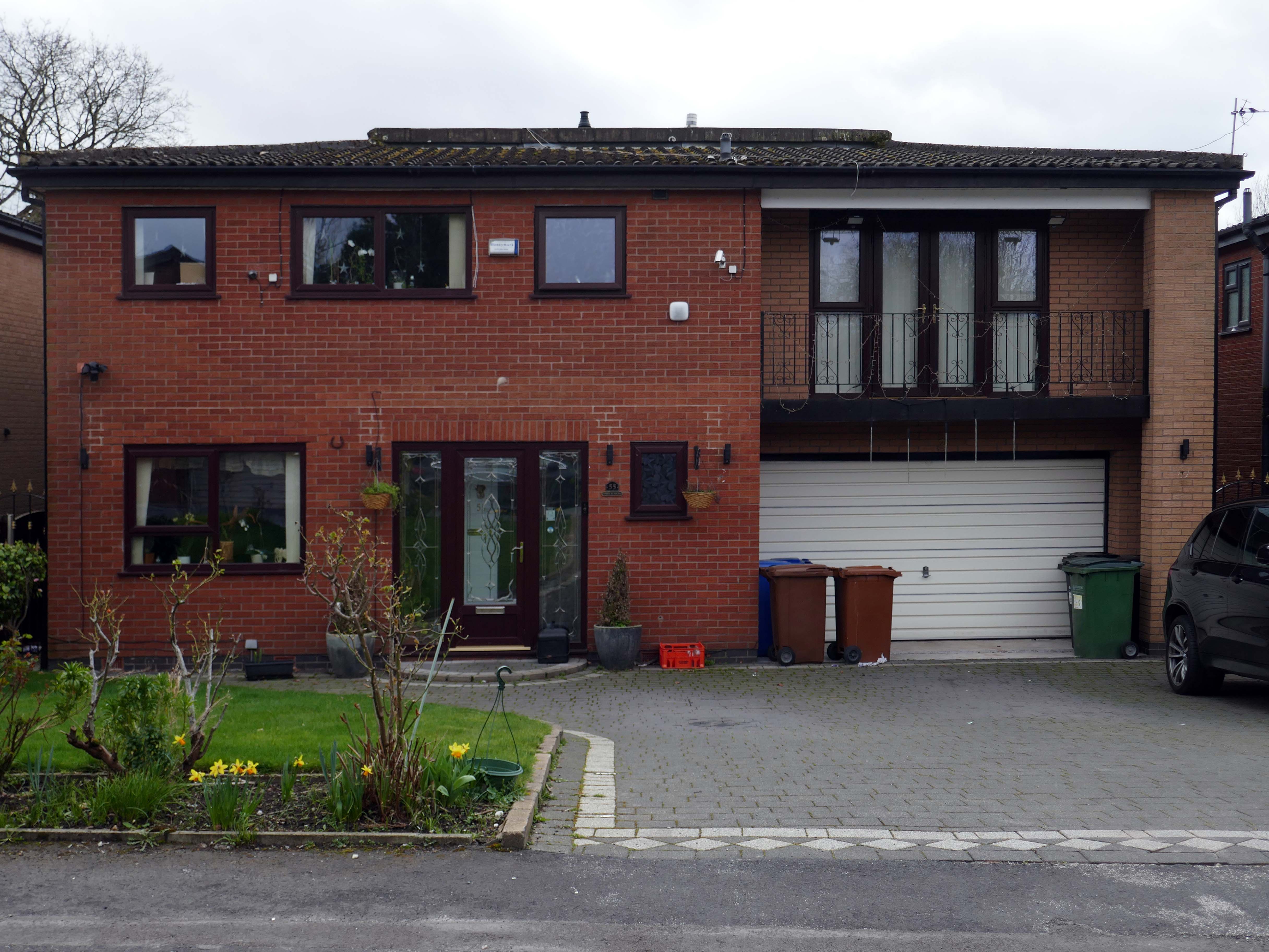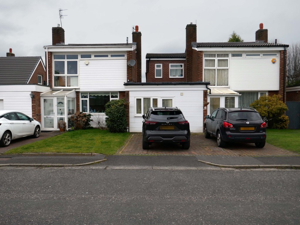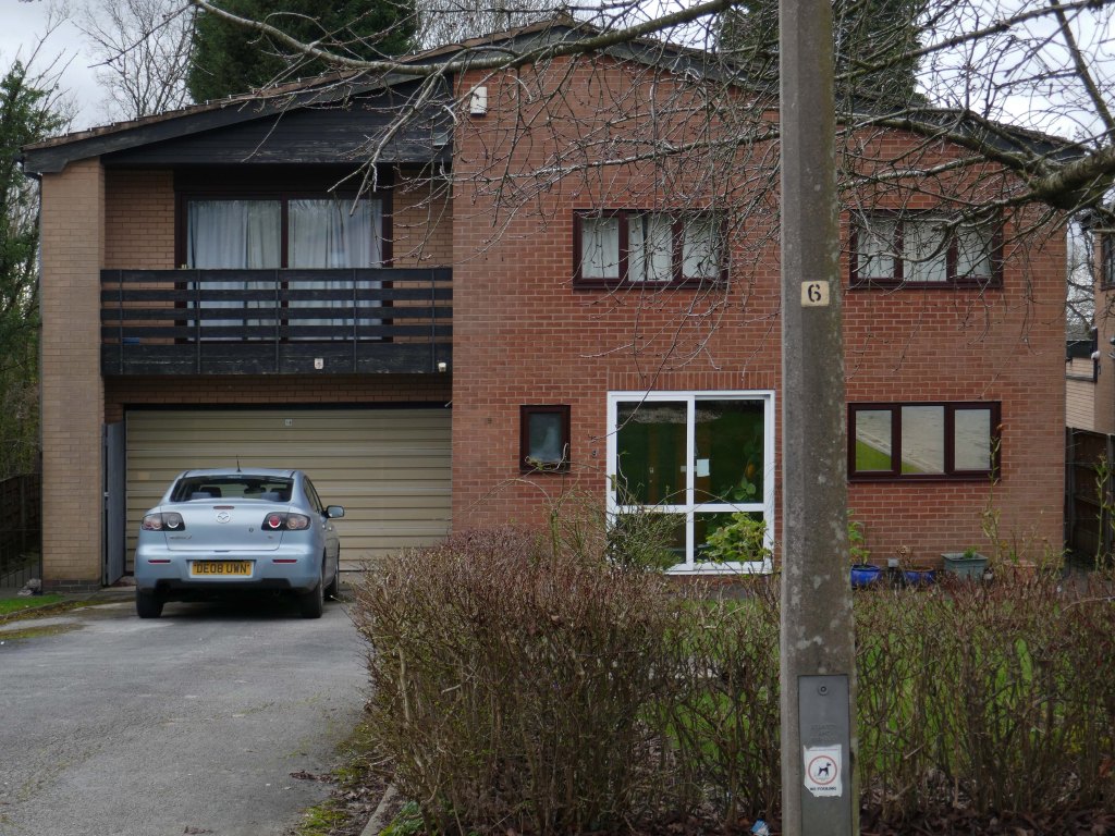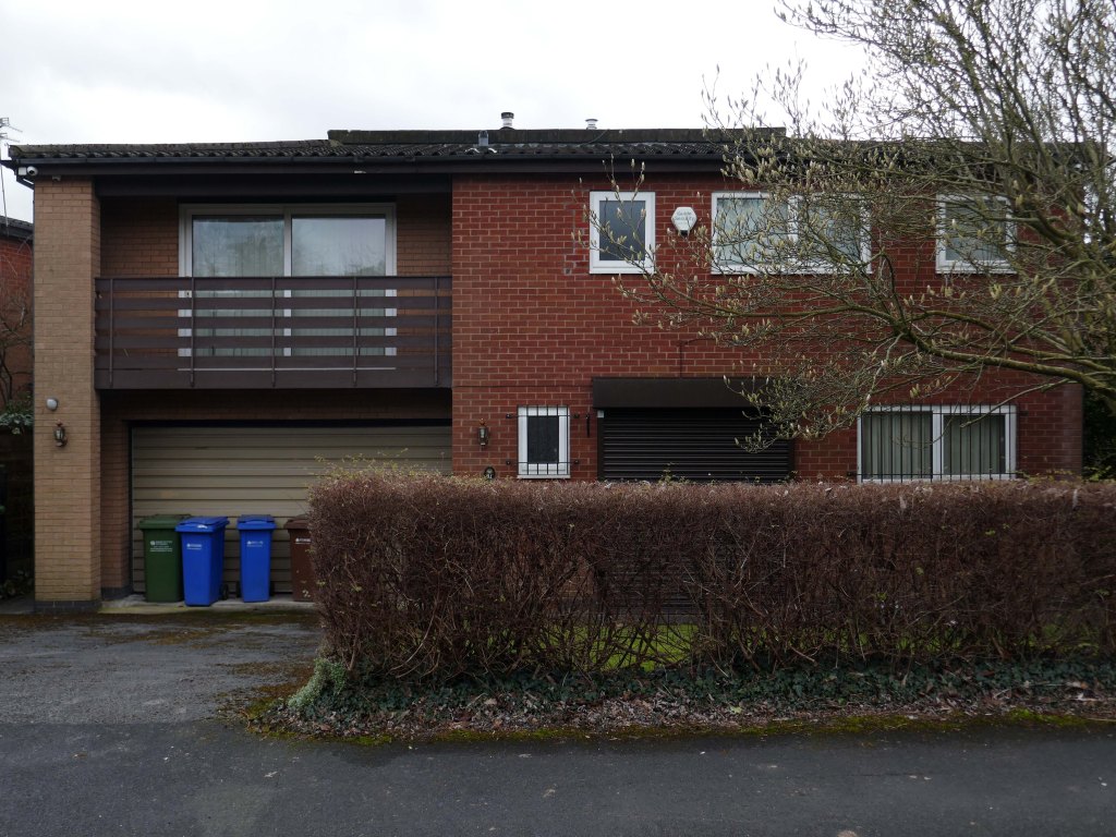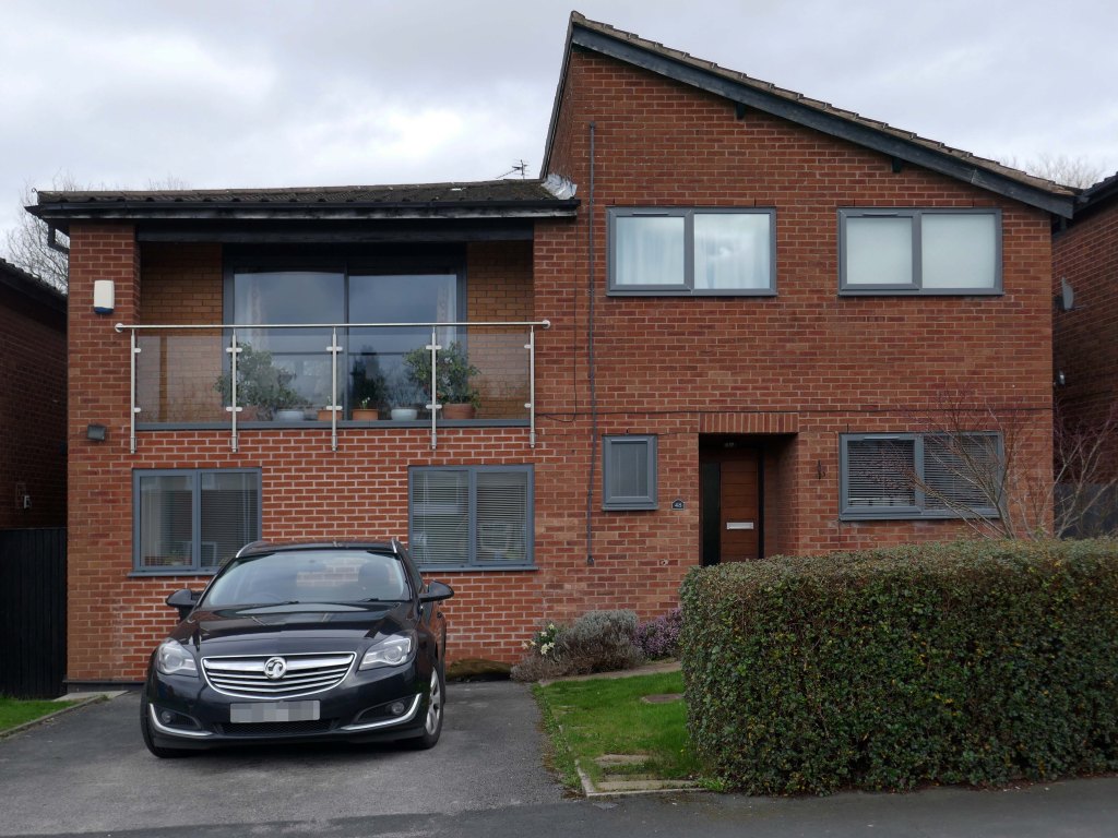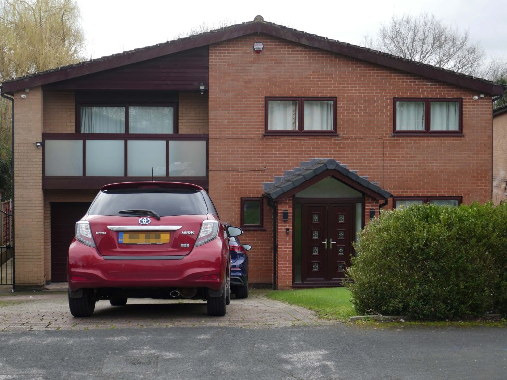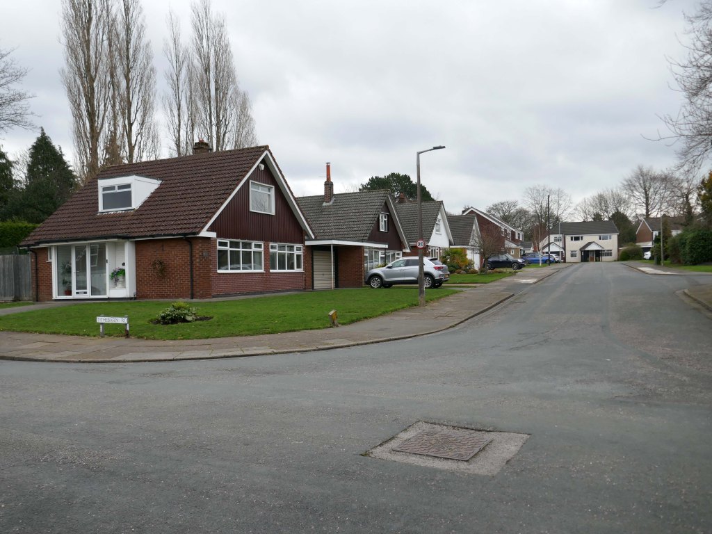 High above the streets of Stockport – zooming in to a cluster of cul de sacs branching out from Tithe Barn Road.