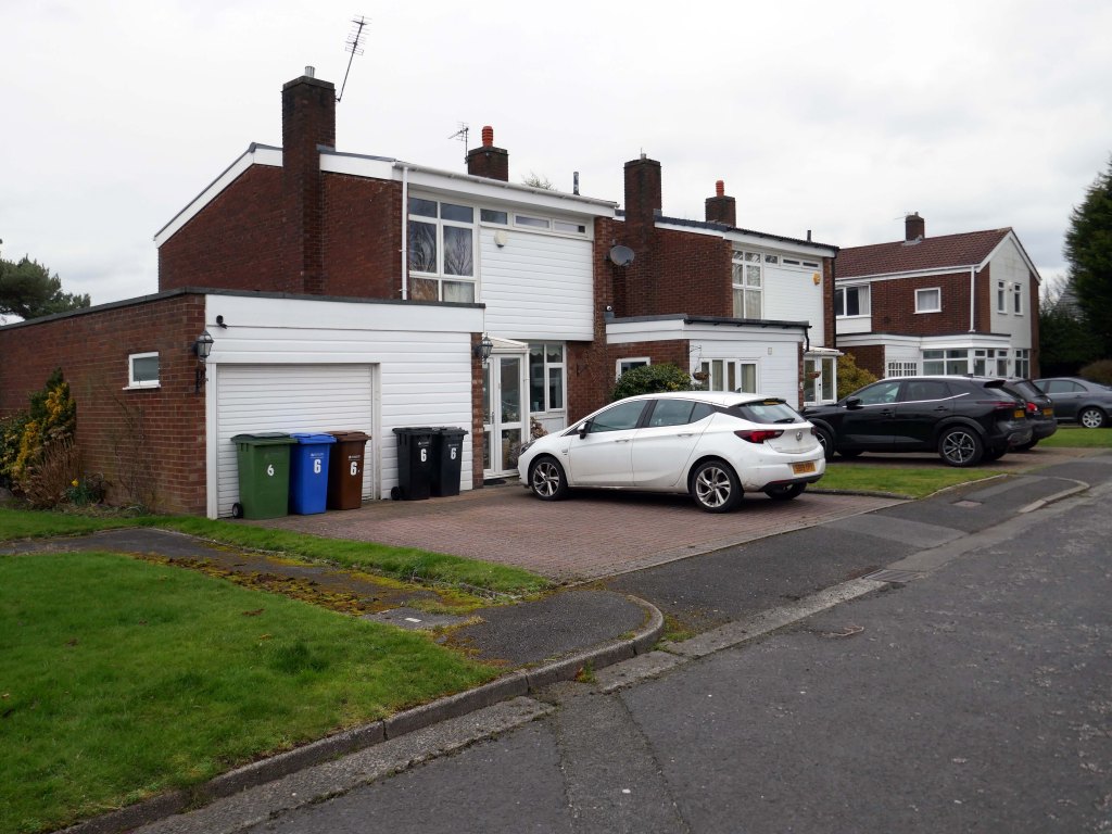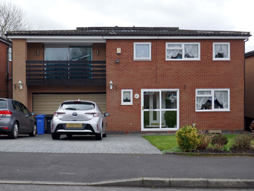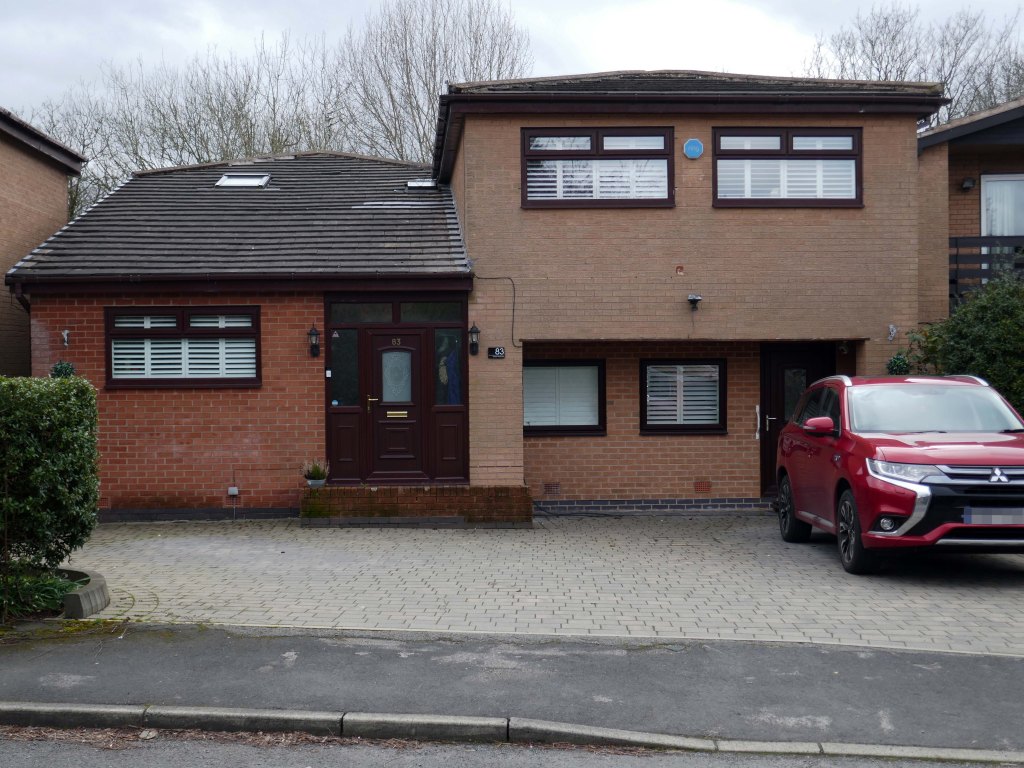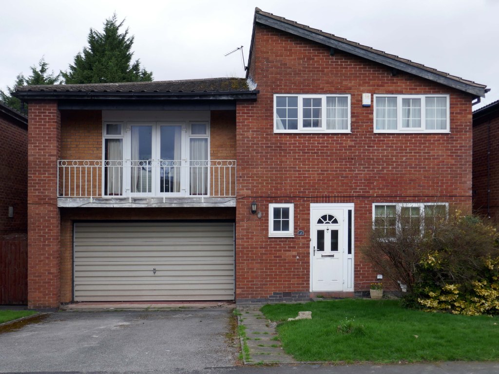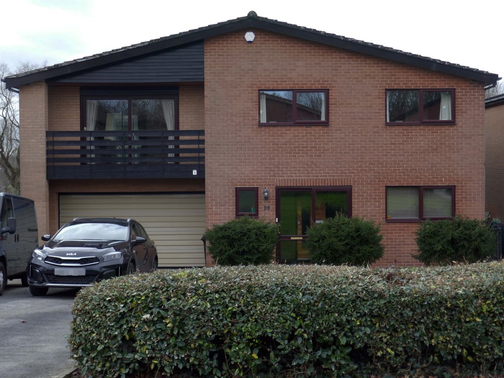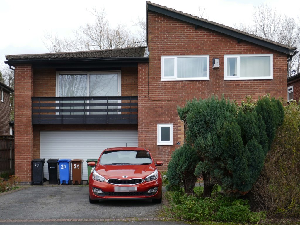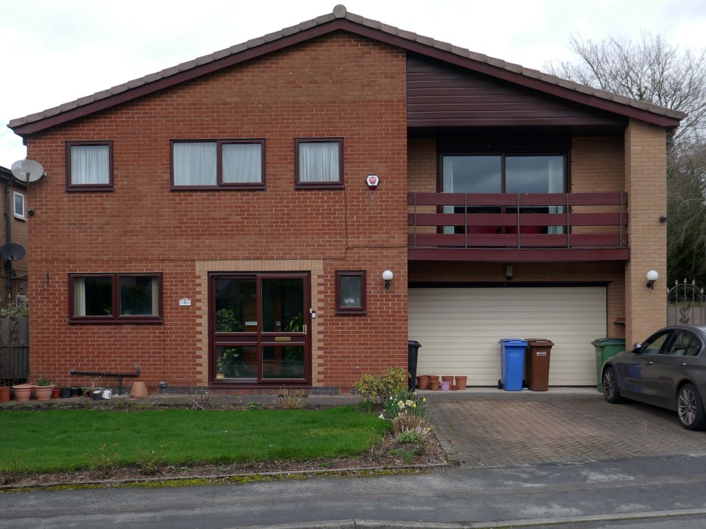 High above the streets of Stockport – zooming in to a cluster of cul de sacs branching out from Tithe Barn Road.