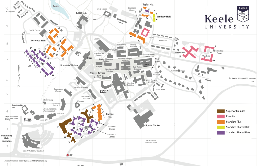 Keele University occupies a six hundred and twenty acre rural campus close to the village of Keele and comprises extensive woodlands, small lakes and Keele Hall in the historic Staffordshire Potteries heartland.