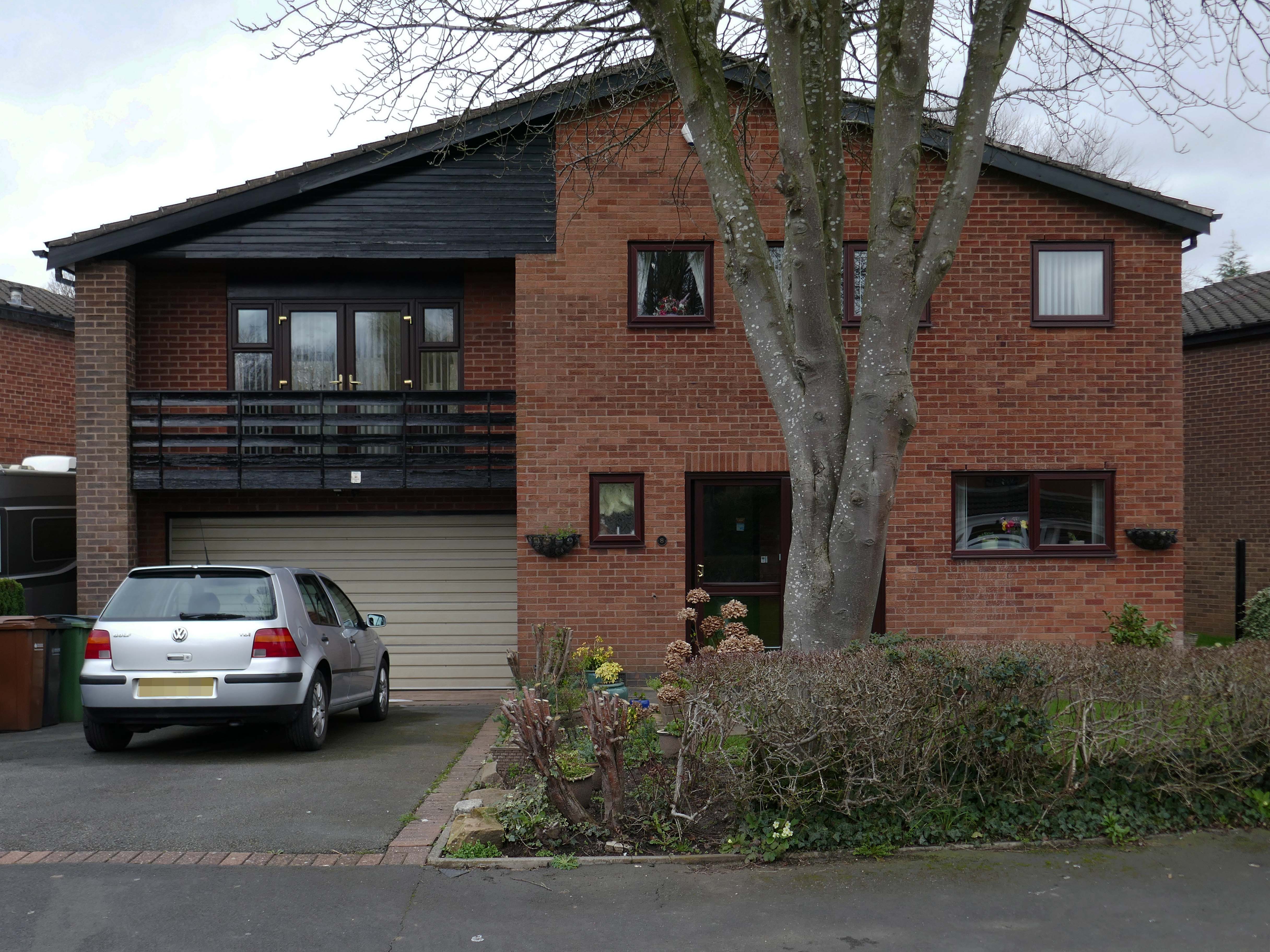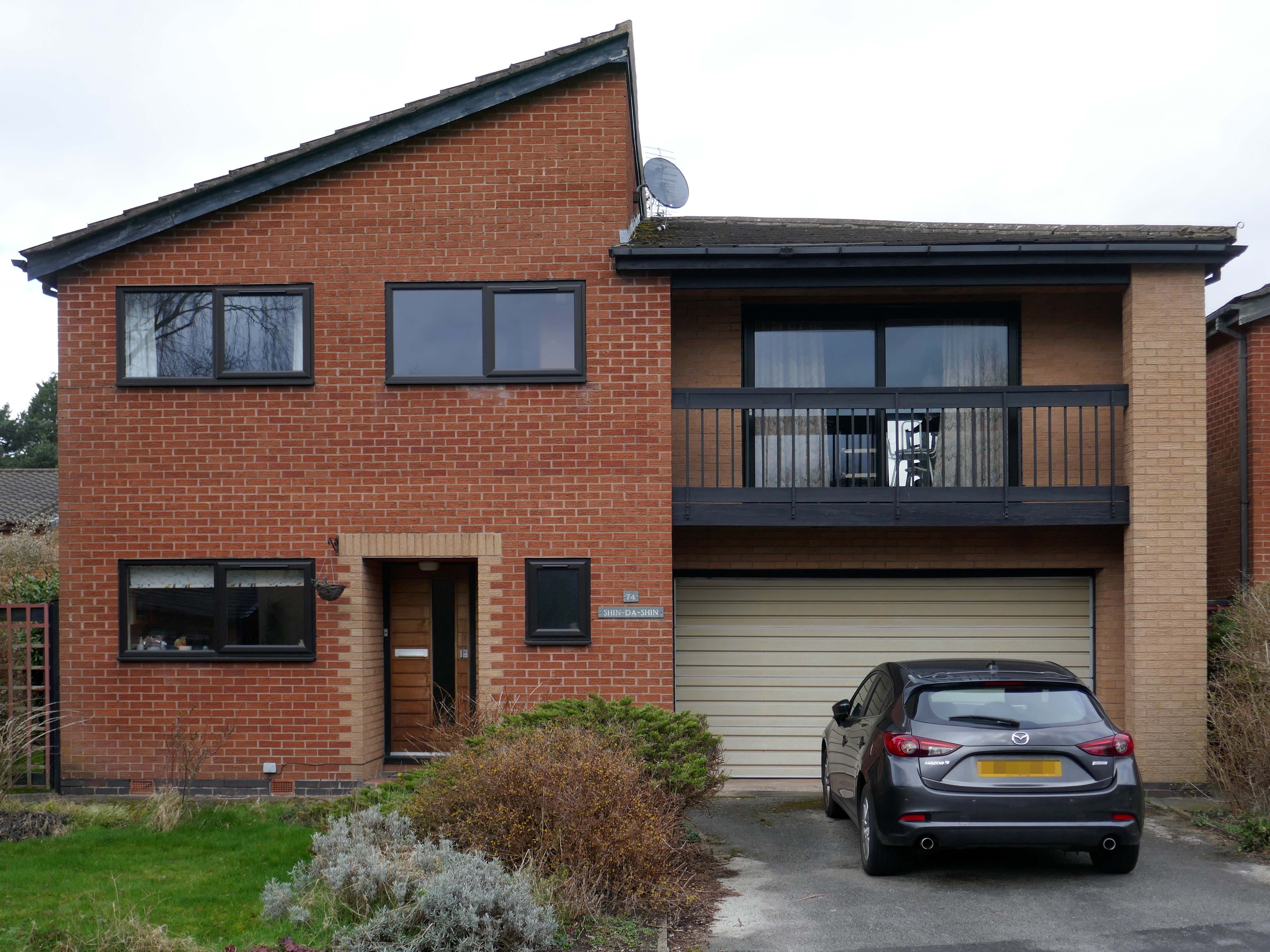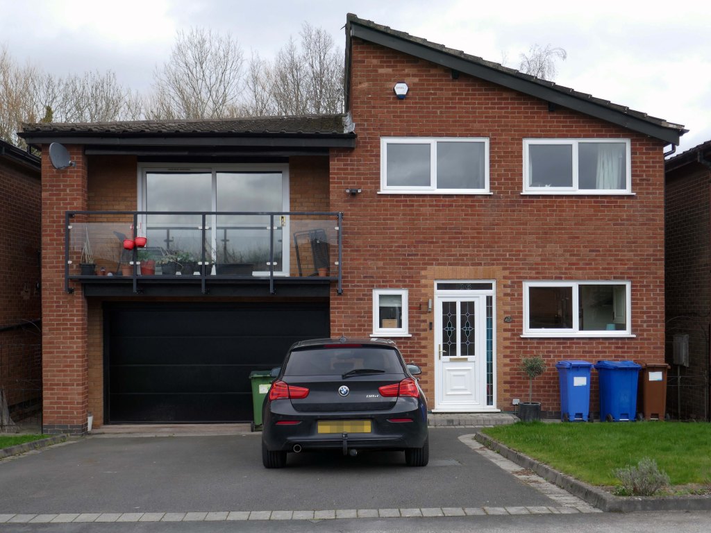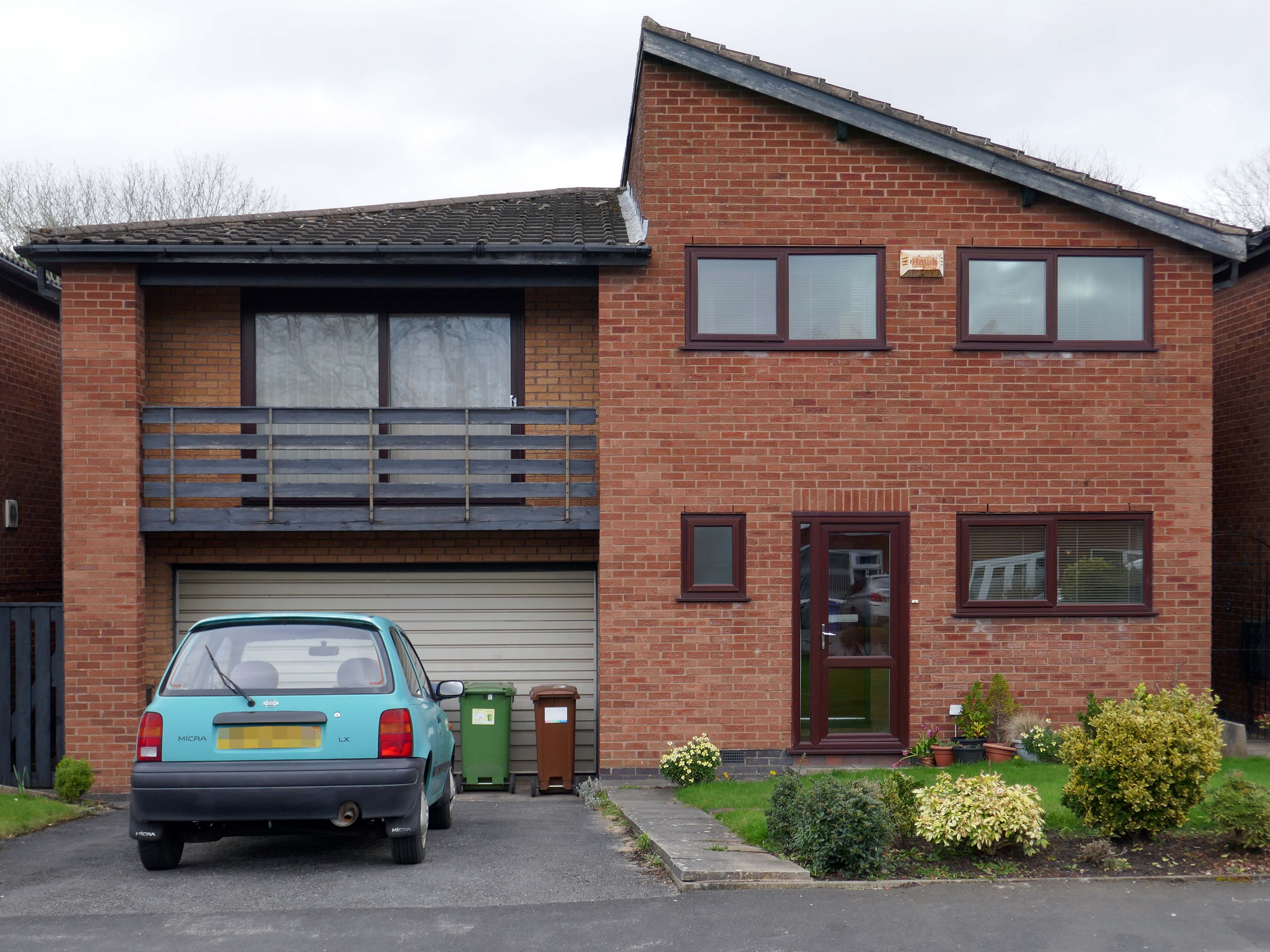 Asymmetric roof, bedroom balcony with optional infill, ever more pointless integrated garage, as the inflated automobile refuses to fit in.