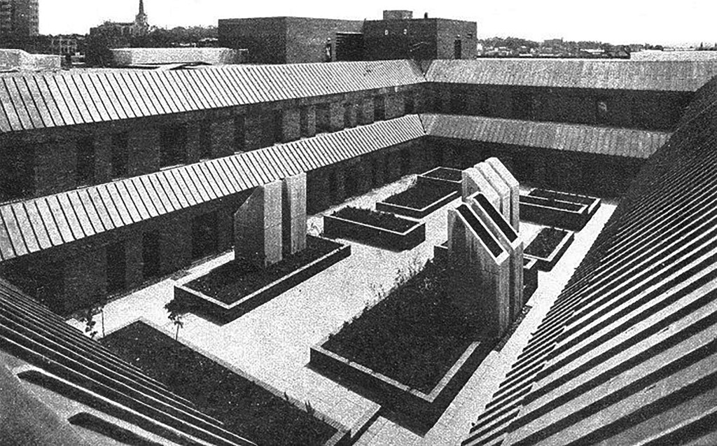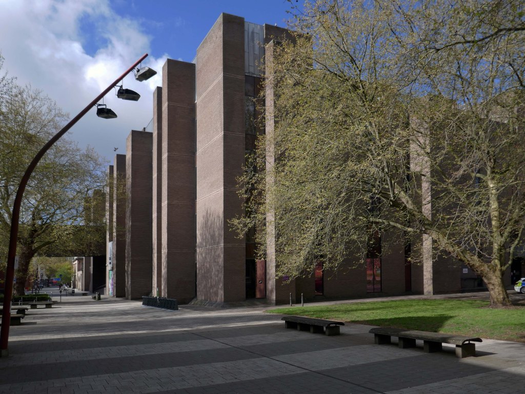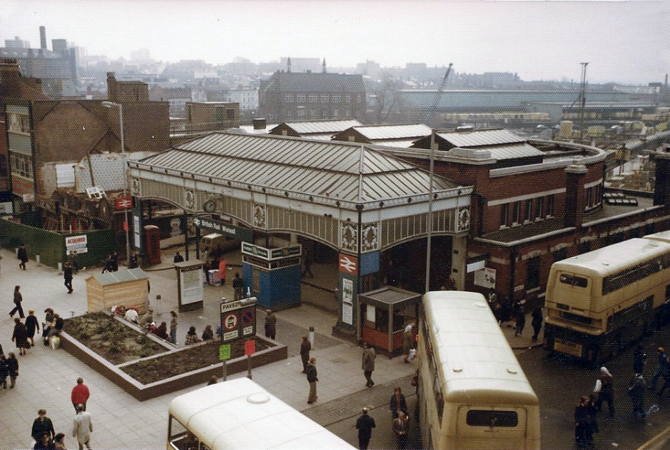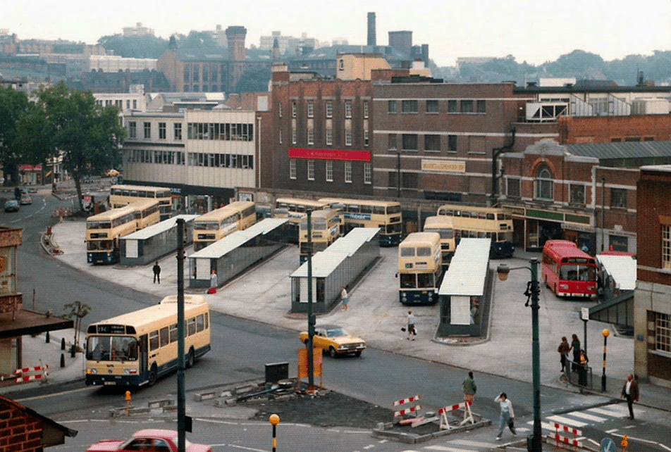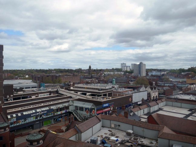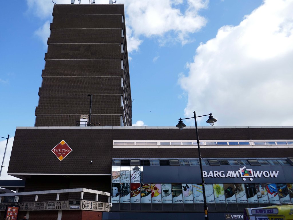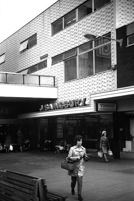To the right can the brutalist Market Hall can be seen, and in the centre the former Woolworths