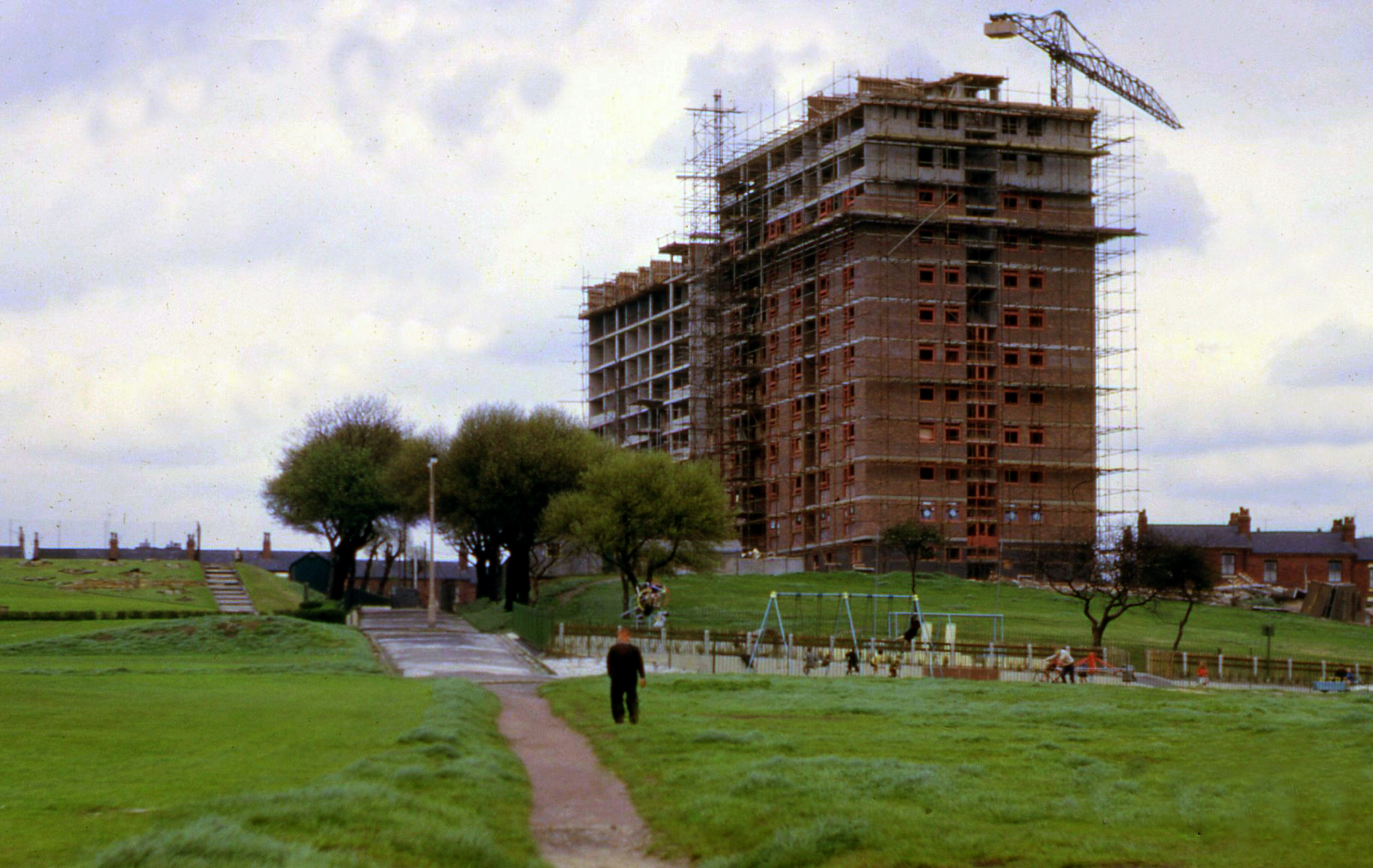 In 1968 the construction of two twelve storey Stockport County Borough Council residential blocks begins, alongside the recreation grounds, Heaton and Norris Towers, creating 136 new homes.