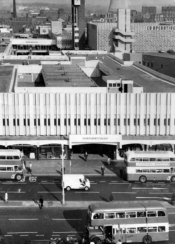 Opened in 1965, and extensively refurbished in the 1990s, it is a large pedestrianised area built on stilts over the River Mersey with two levels of walkways giving access to the retail units.