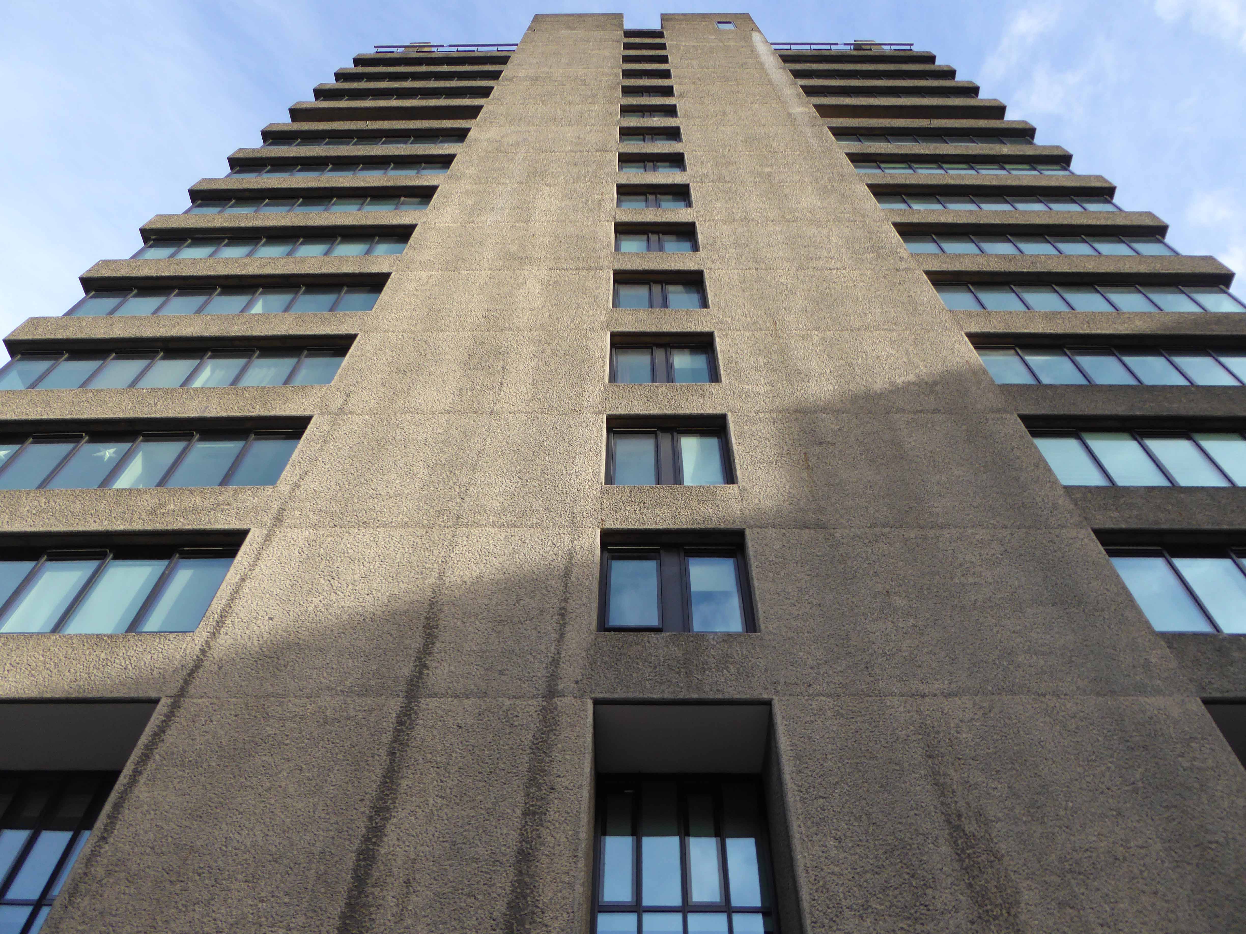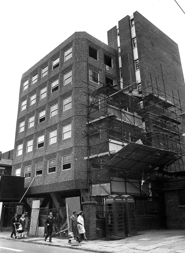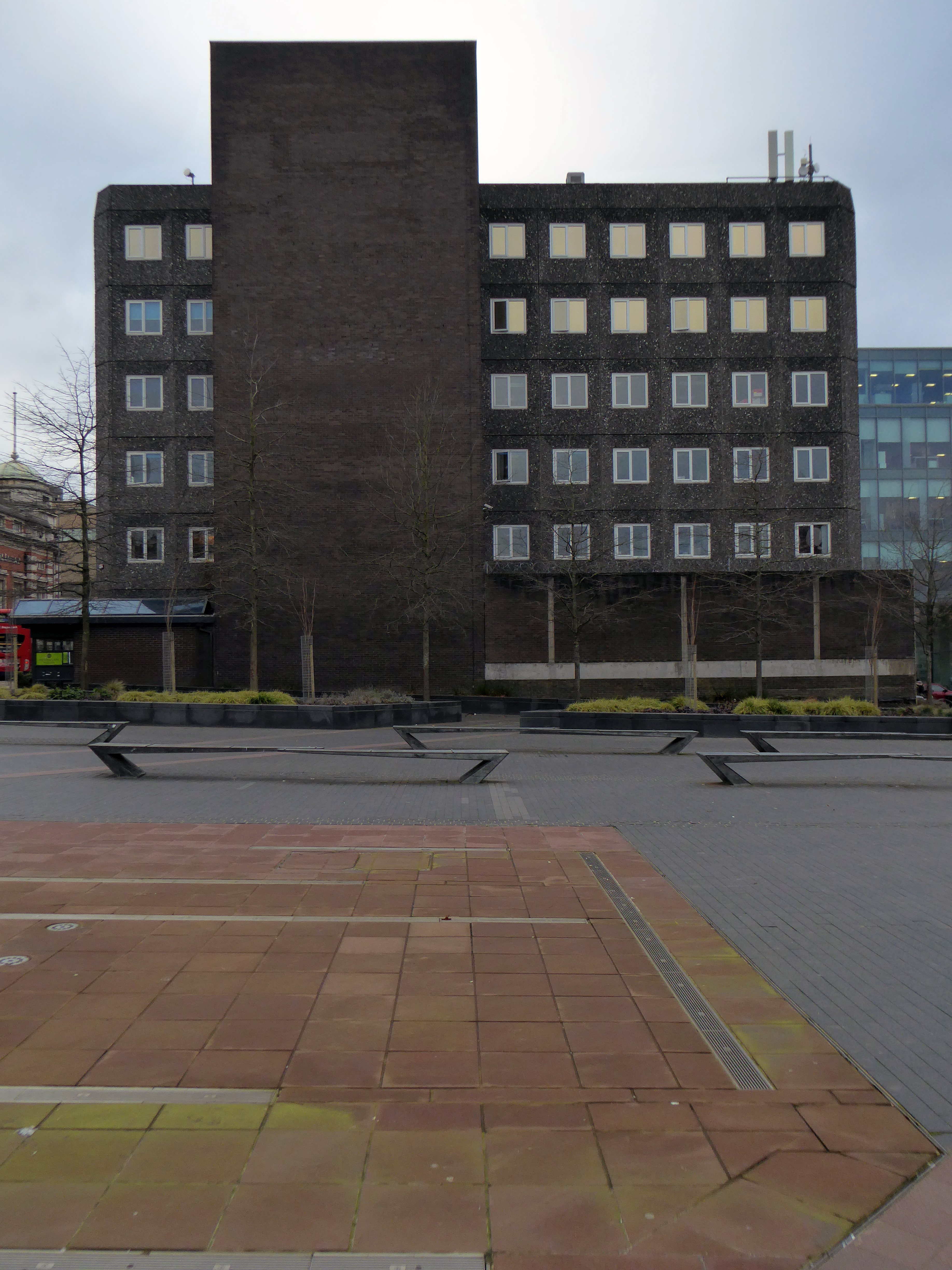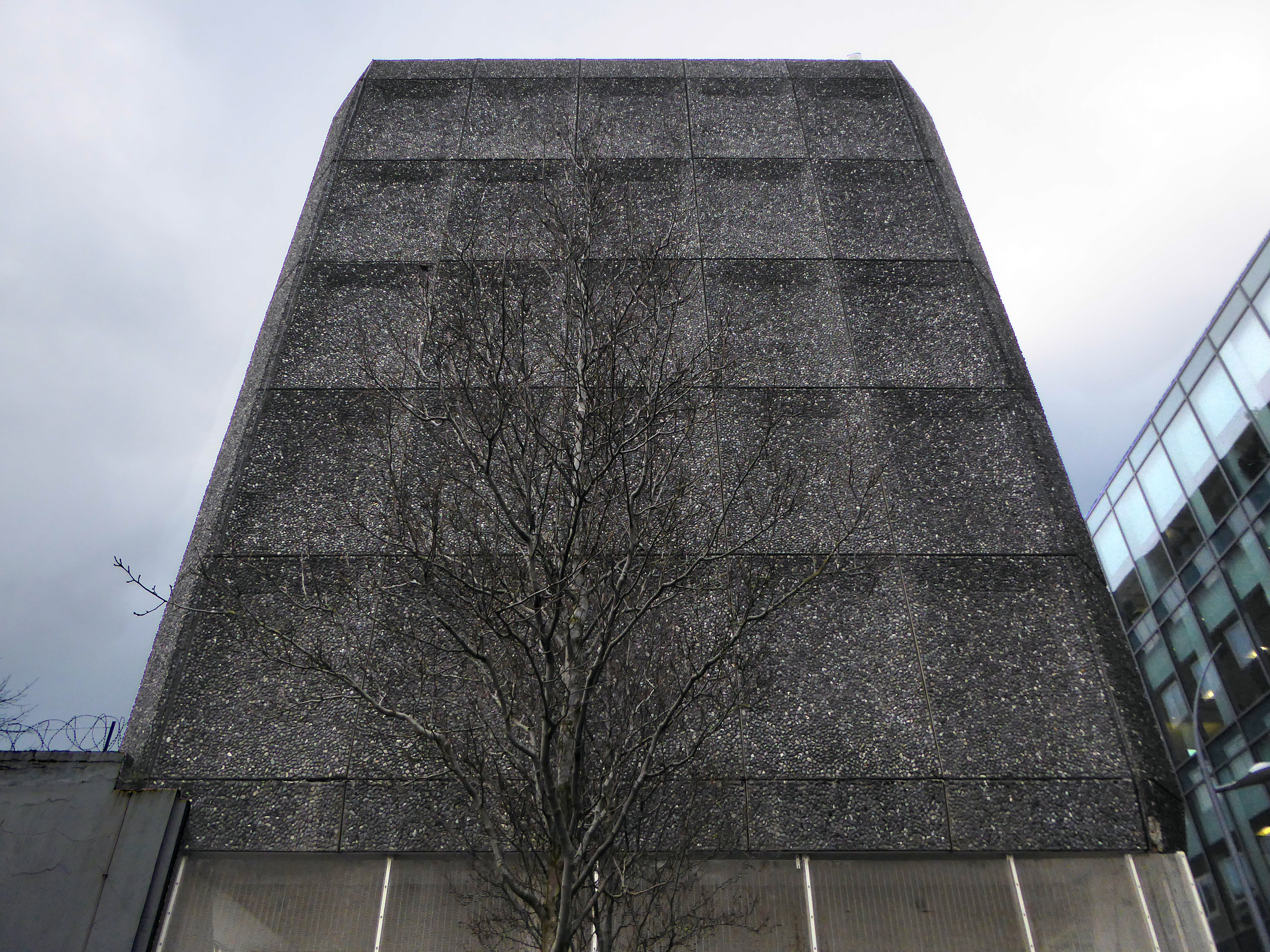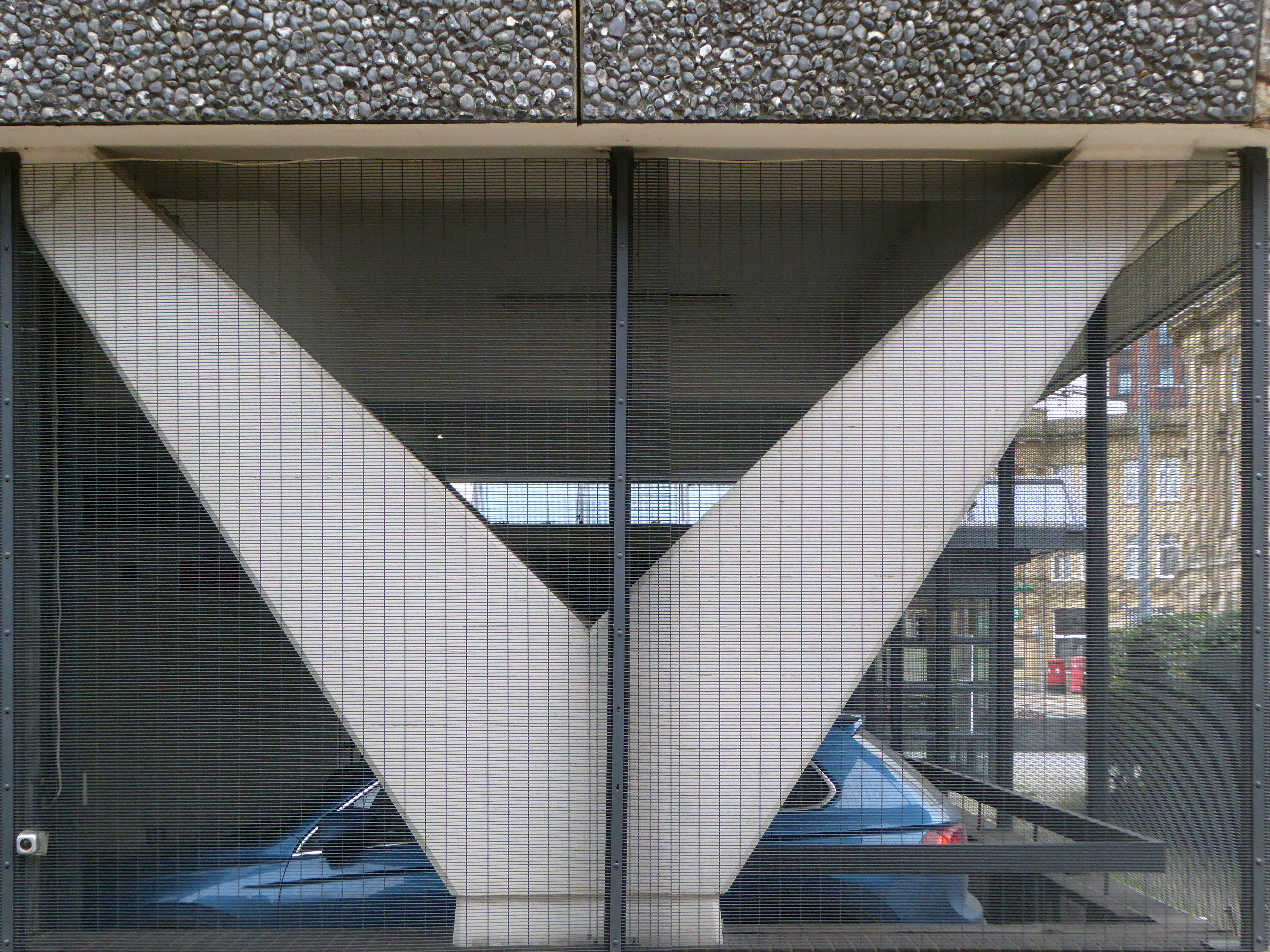 A compact 70s block, that combines the roughest of precast panels, with the smoothest of *V* shaped supports, housing the car park below. The north face is a solid block of rough mid-toned aggregated recessed concrete, the remaining elevations pierced with windows and to the east a brick service tower.