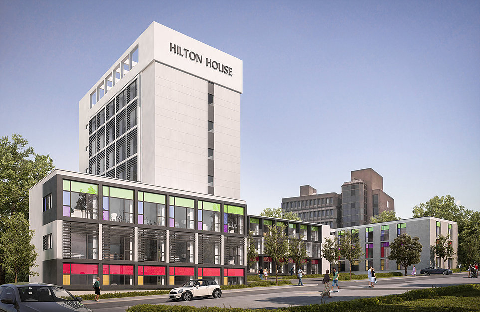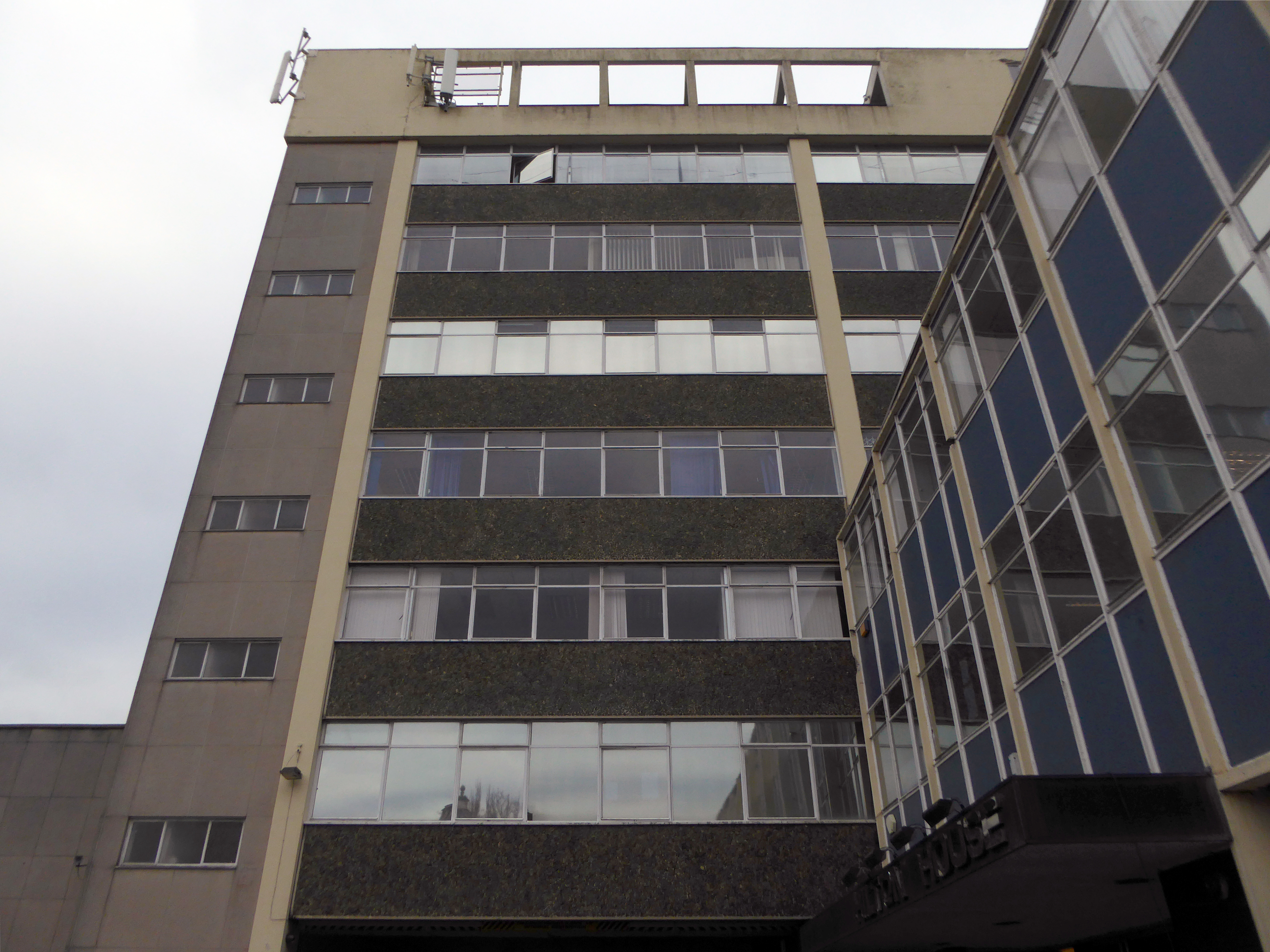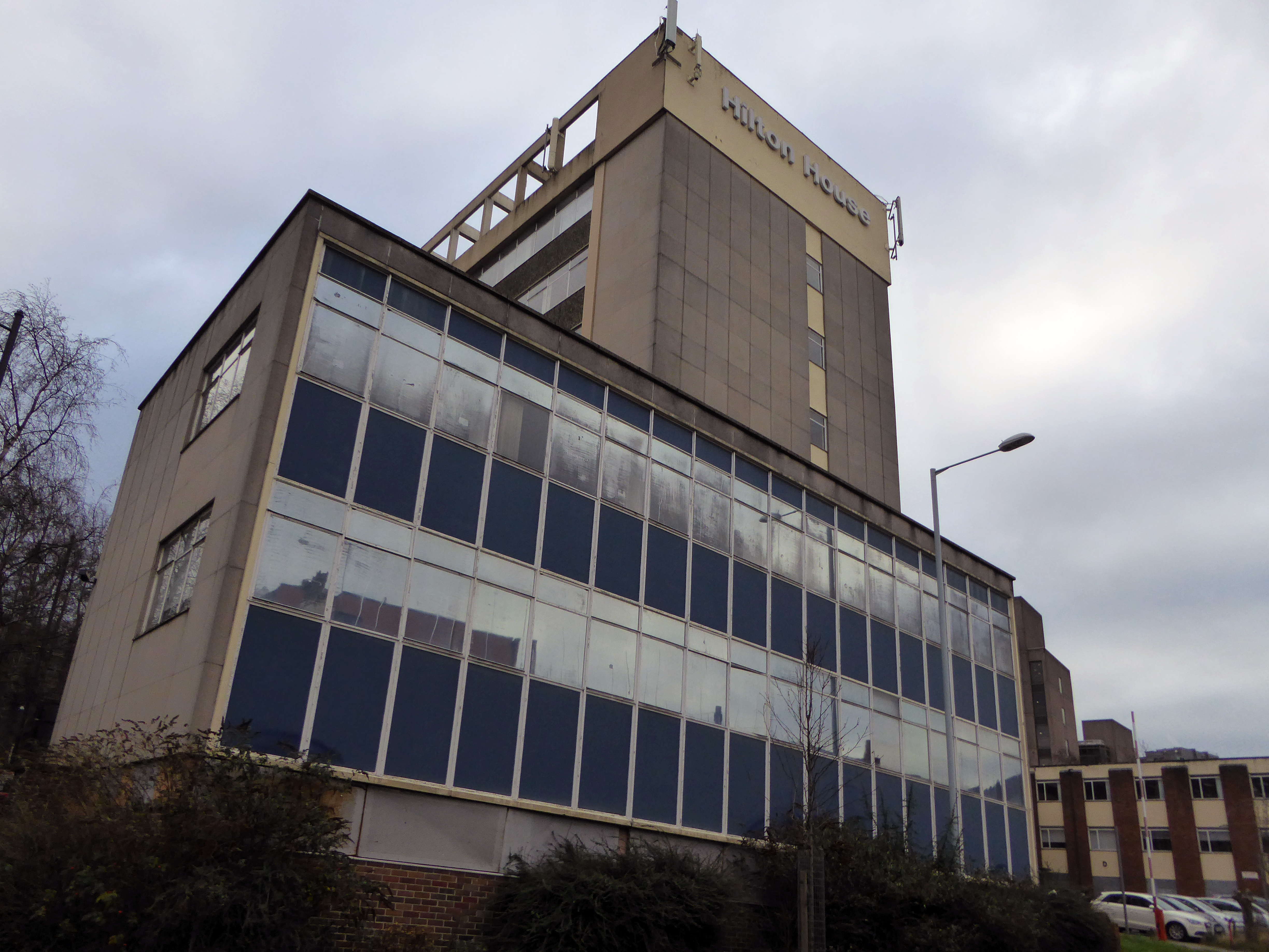 Sixties built Hilton House is the former home of local furniture manufacturers New Day. It continues to impress, more or less unaltered, with its dramatic interlocking volumes confidently occupying the topography of the site. A commanding block of some ten storeys, with well proportioned bands of windows and mixed stone and concrete cladding. Linked to two further horizontal blocks, which are finished in contrasting styles.