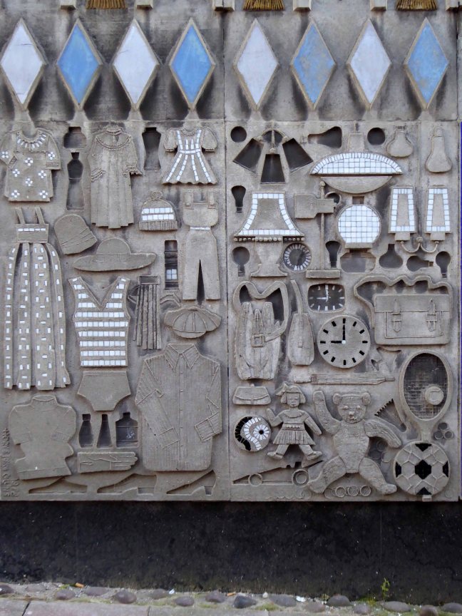 At the side of the BHS store in Merseyway are five concrete panels depicting local people, events and symbols. Commissioned by BHS in 1978 – To fill space on the blank wall at the side of the shop. They are the work of Joyce Pallot 1912-2004 and Henry Collins, 1910-1994 – two artist/designers, who along with John Nash, establishedthe Colchester Arts Group, during the 1930s. Their work was featured in the Festival of Britain, GPO Tower and Expo 70, along with other retail outlets in Bexhill, Cwmbran, Southhampton, Newcastle and Colchester.
