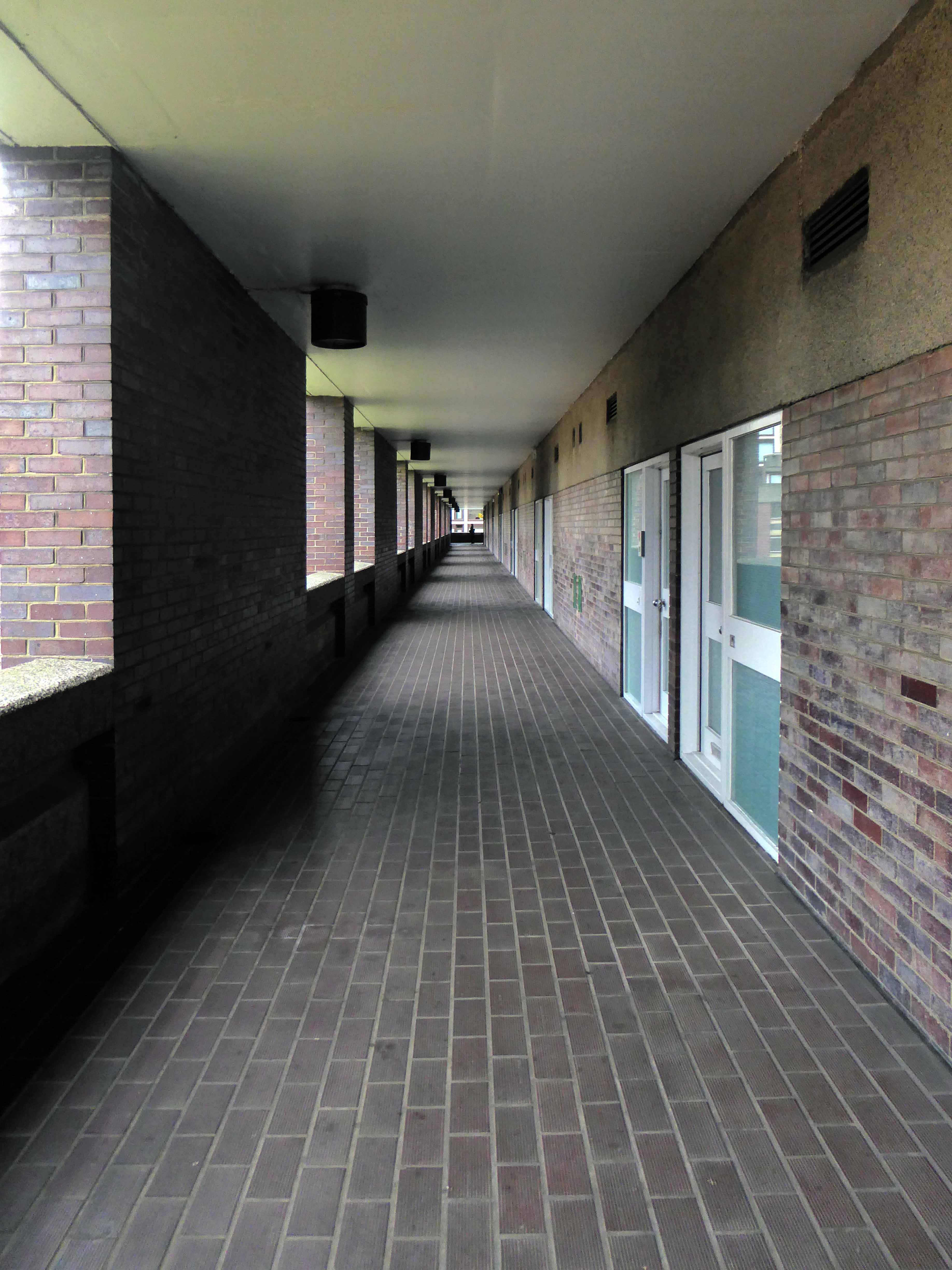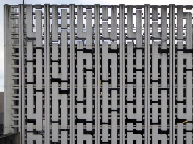 Notable is the pierced concrete car park screen by Alan Boyson.