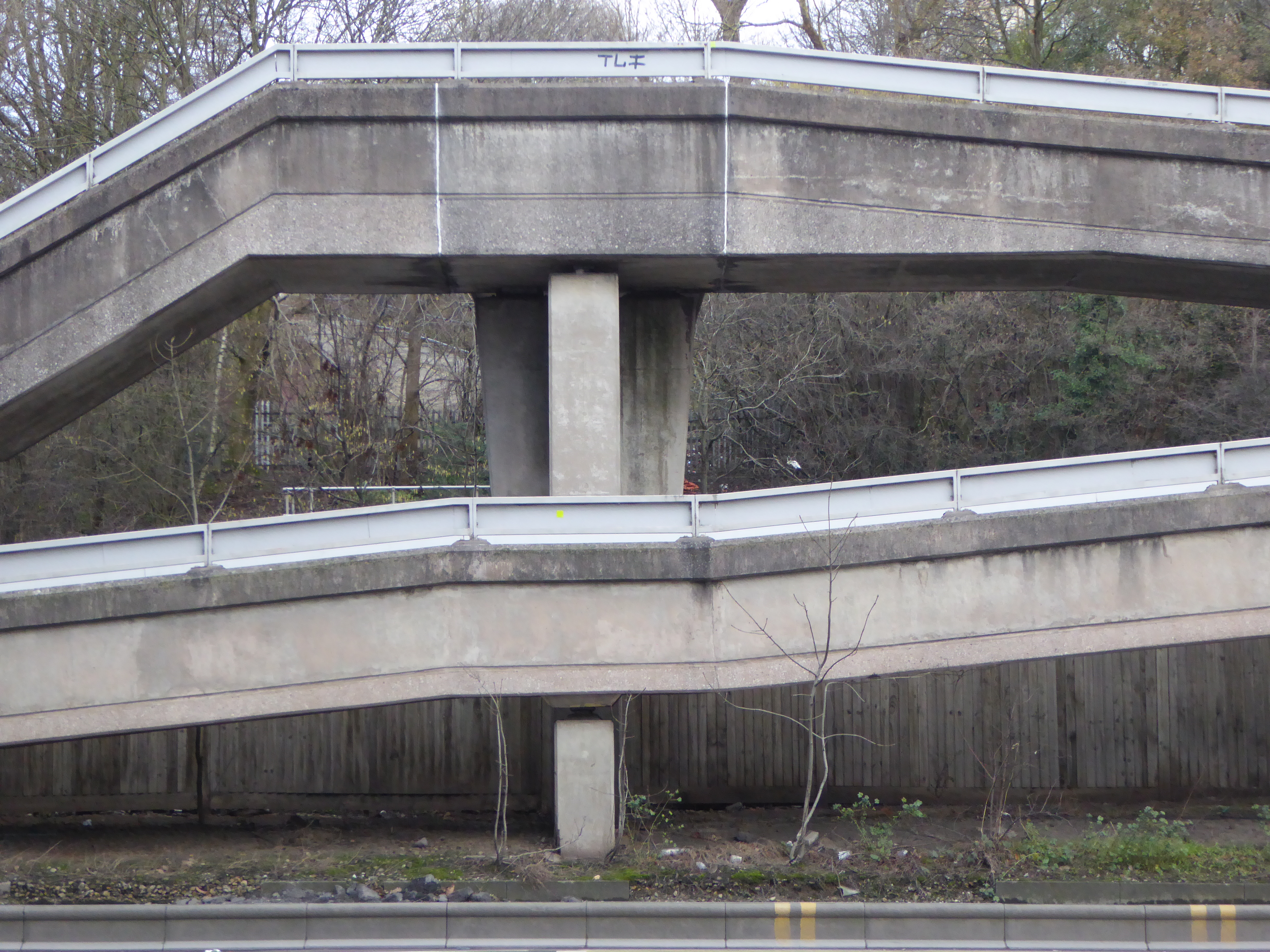 The Hatton Street footbridge has two spans of in-situ u-section deck, is at ground level on the north side, but is reached by steps or ramp from Great Egerton Street on the south.