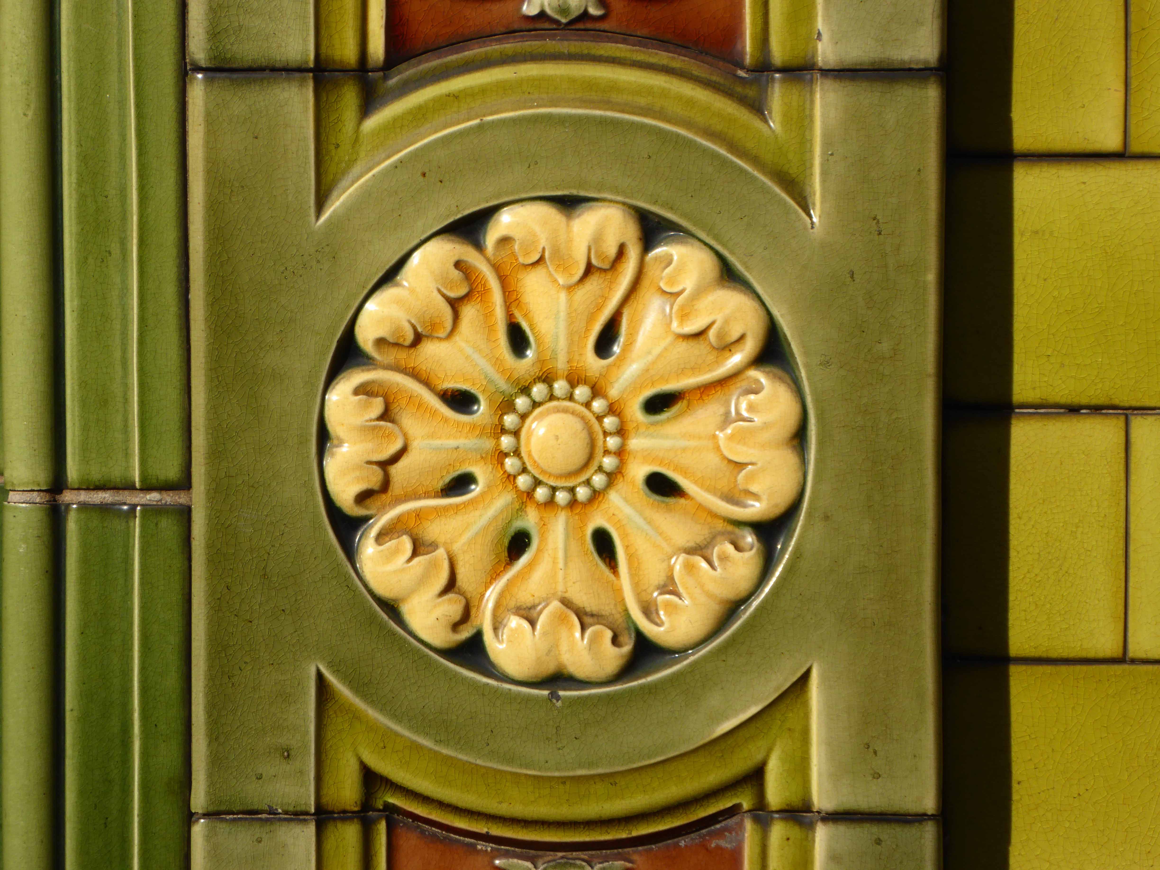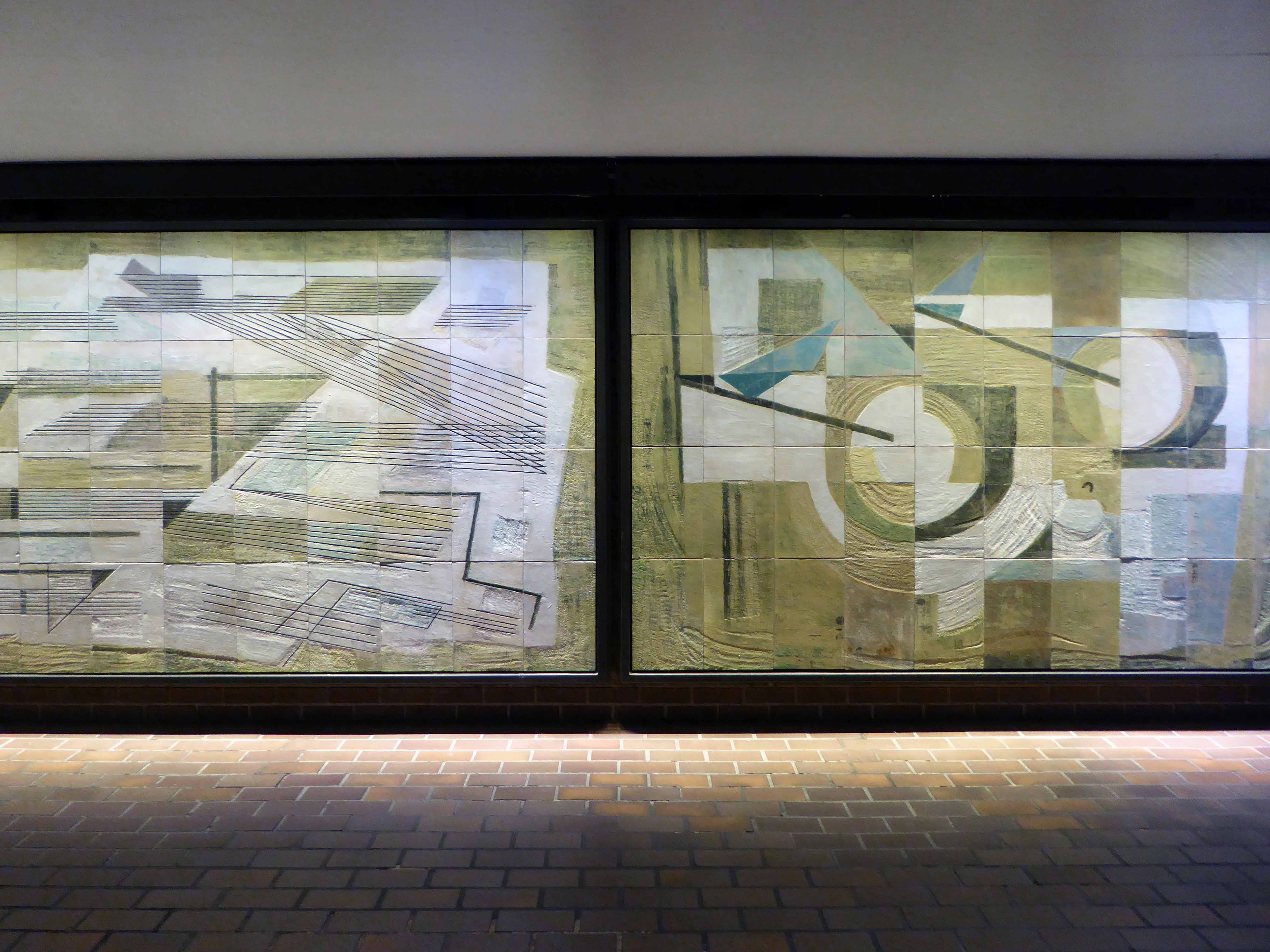 The murals were commissioned at a cost of £300 per panel in 1960. Annan visited the Hathernware Pottery in Loughborough and hand-scored her designs onto each wet clay tile, her brush marks can also be seen in the fired panels.
