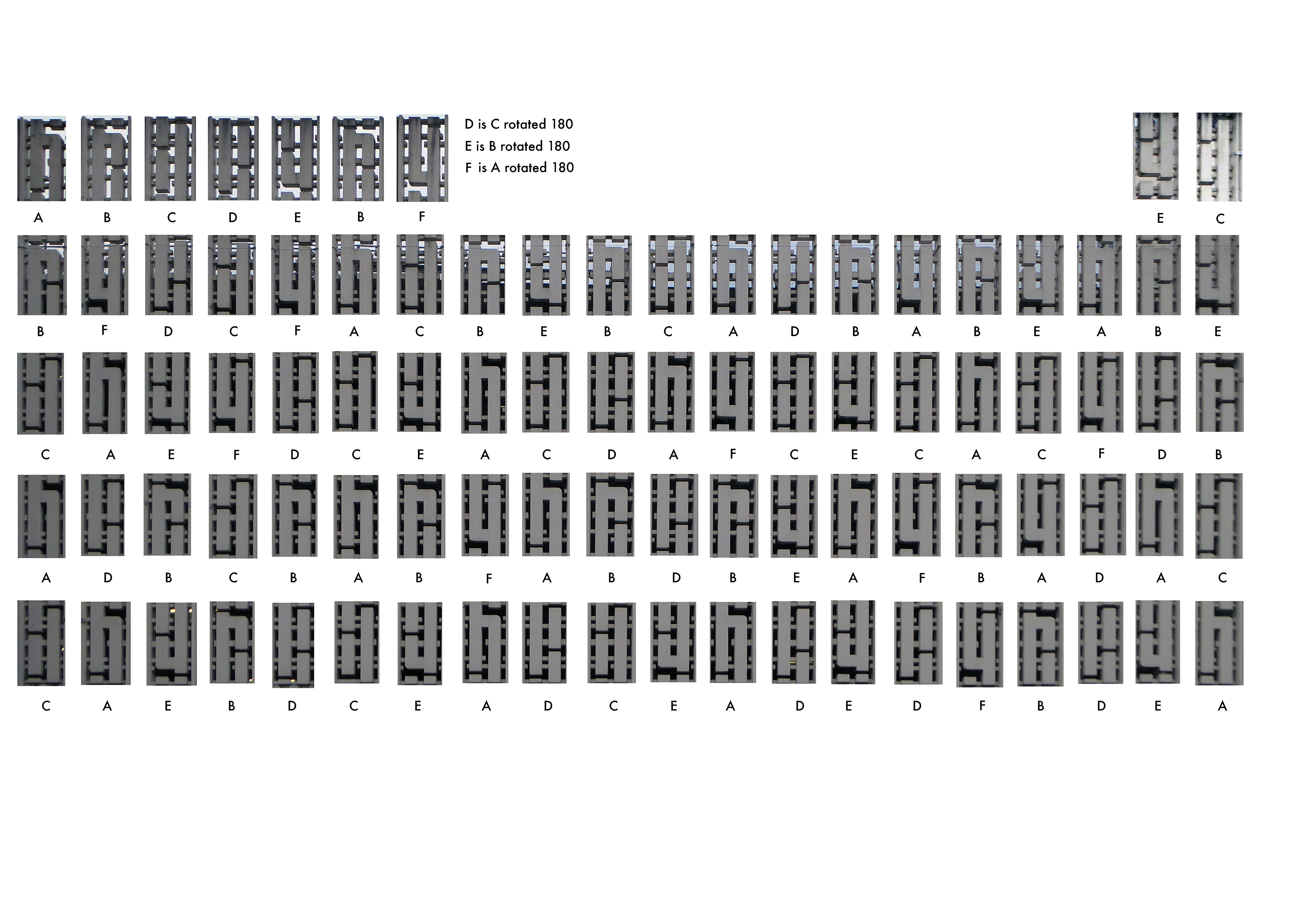 Constructed from three basic modules, each one being rotated to form six options in a seemingly random order.