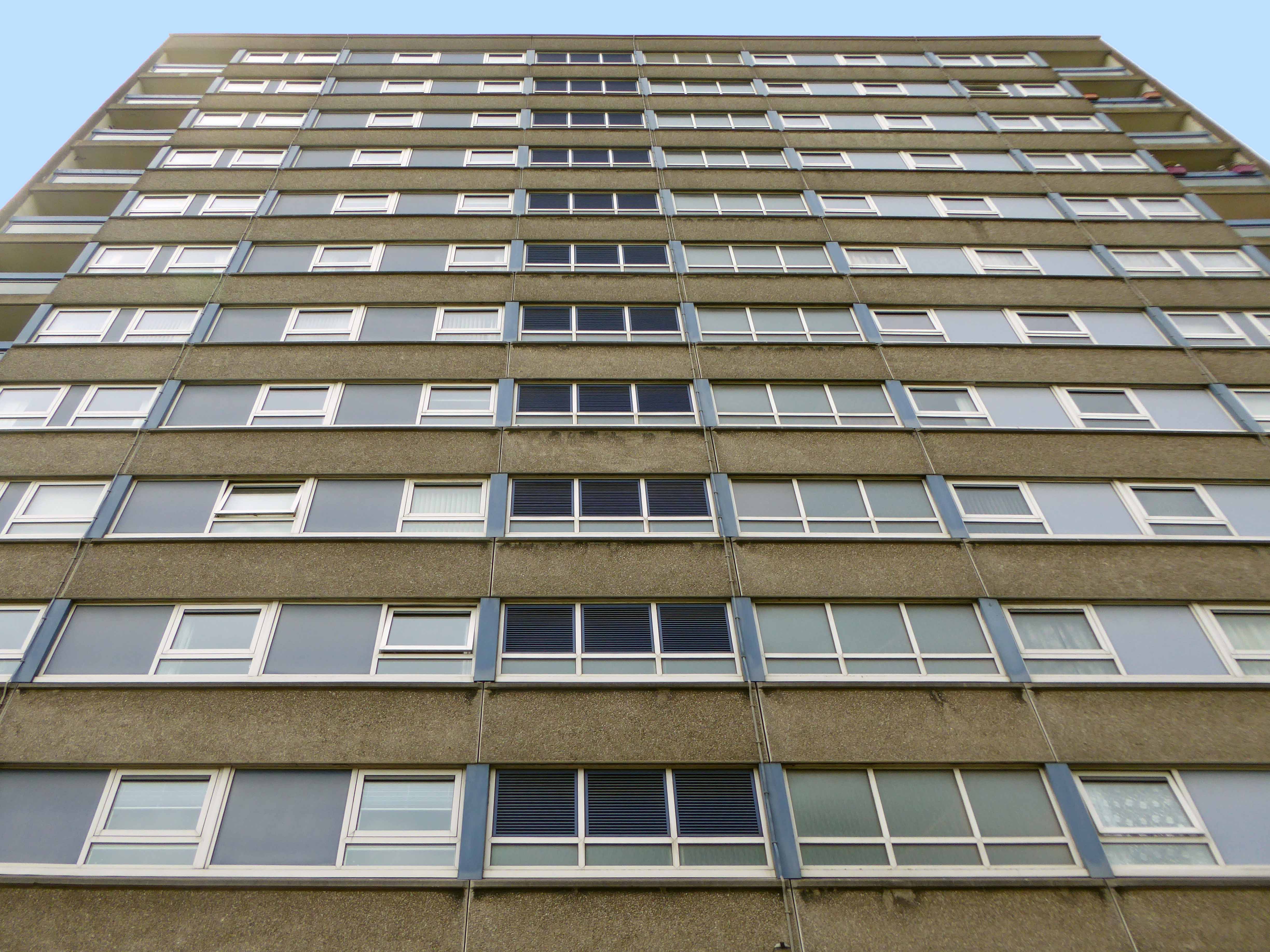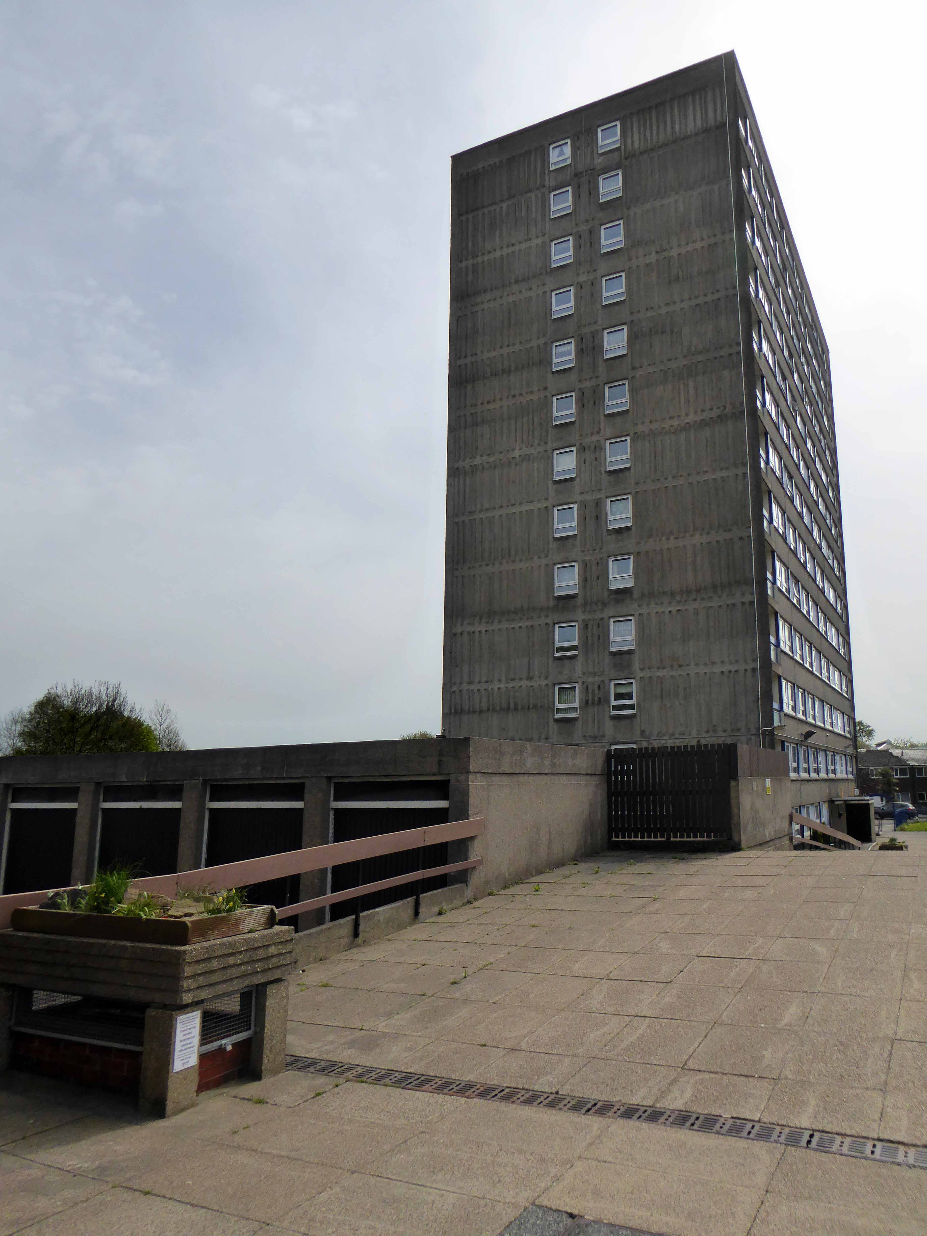 Three thirteen-storey slab blocks built as public housing using the Sectra industrialised building system. The blocks contain 183 dwellings in total, consisting of 72 one-bedroom flats and 111 two-bedroom flats. The blocks are of storiform construction clad with precast concrete panels. The panels are faced with exposed white Cornish aggregate. Spandrel panels set with black Shap granite aggregate are used under the gable kitchen windows. The blocks were designed by the Borough architect in association with Sydney Greenwood. Construction was approved by committee in 1966.