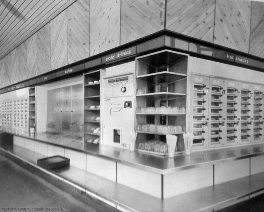 The southbound amenity building had a lowered section with a Quick Snacks machine and the toilets. Above it was the transport café which had only an Autosnacks machine, where staff loaded hot meals into the back and customers paid to release them. These were the motorway network’s first catering vending machines, and the Ministry of Transport were won round by the idea, but Rank weren’t – they removed them due to low demand.
