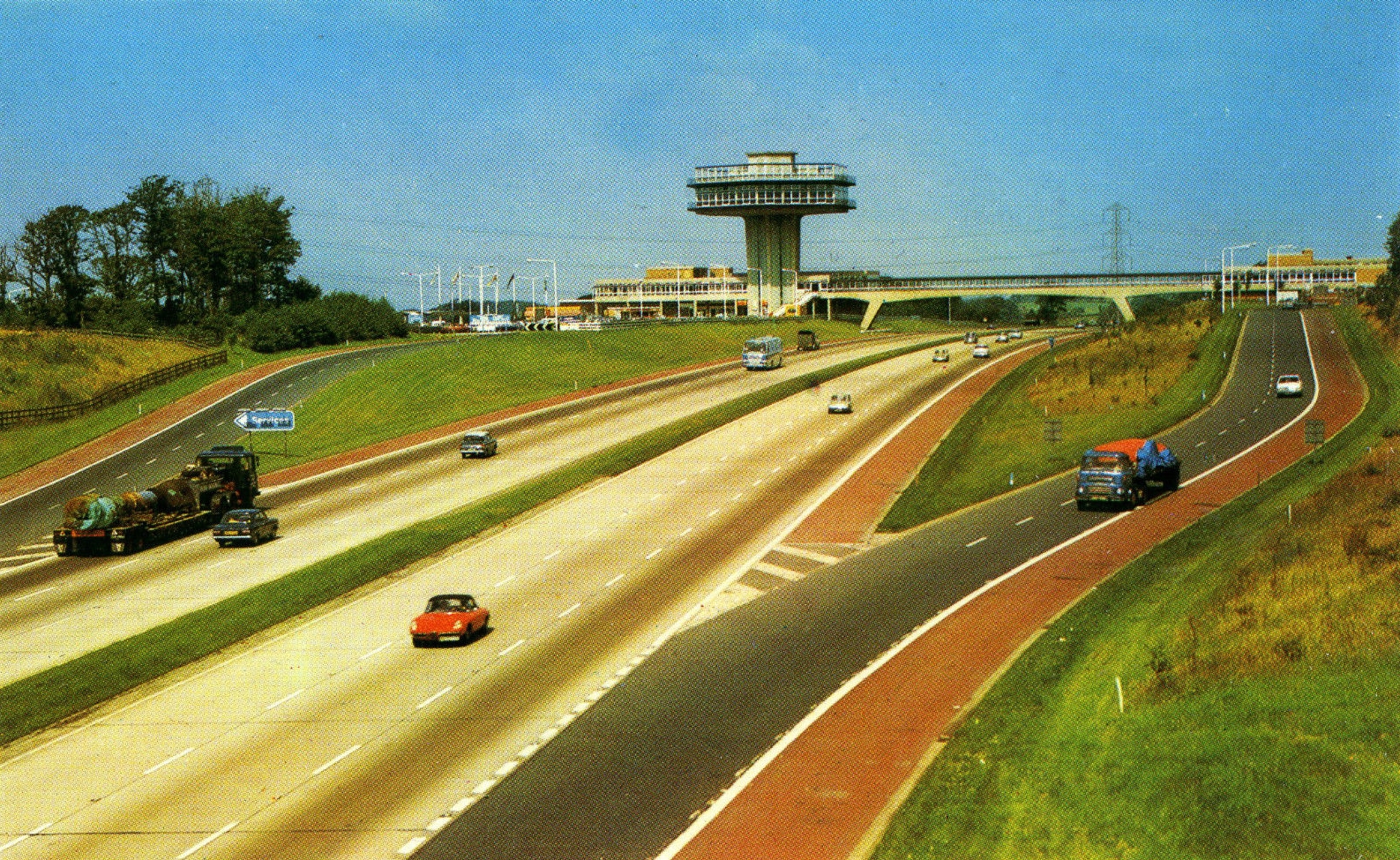 The Pennine Tower was designed to make the services clearly visible – the ban on advertising had always been an issue, and the previous technique of having a restaurant on a bridge, like down the road at Charnock Richard, was proving expensive and impractical. Rank commissioned architects T P Bennett & Sons to capitalise on the benefits of exciting design while trialling something different. The tower resembles that used by air traffic control, summarising the dreams of the ’60s.