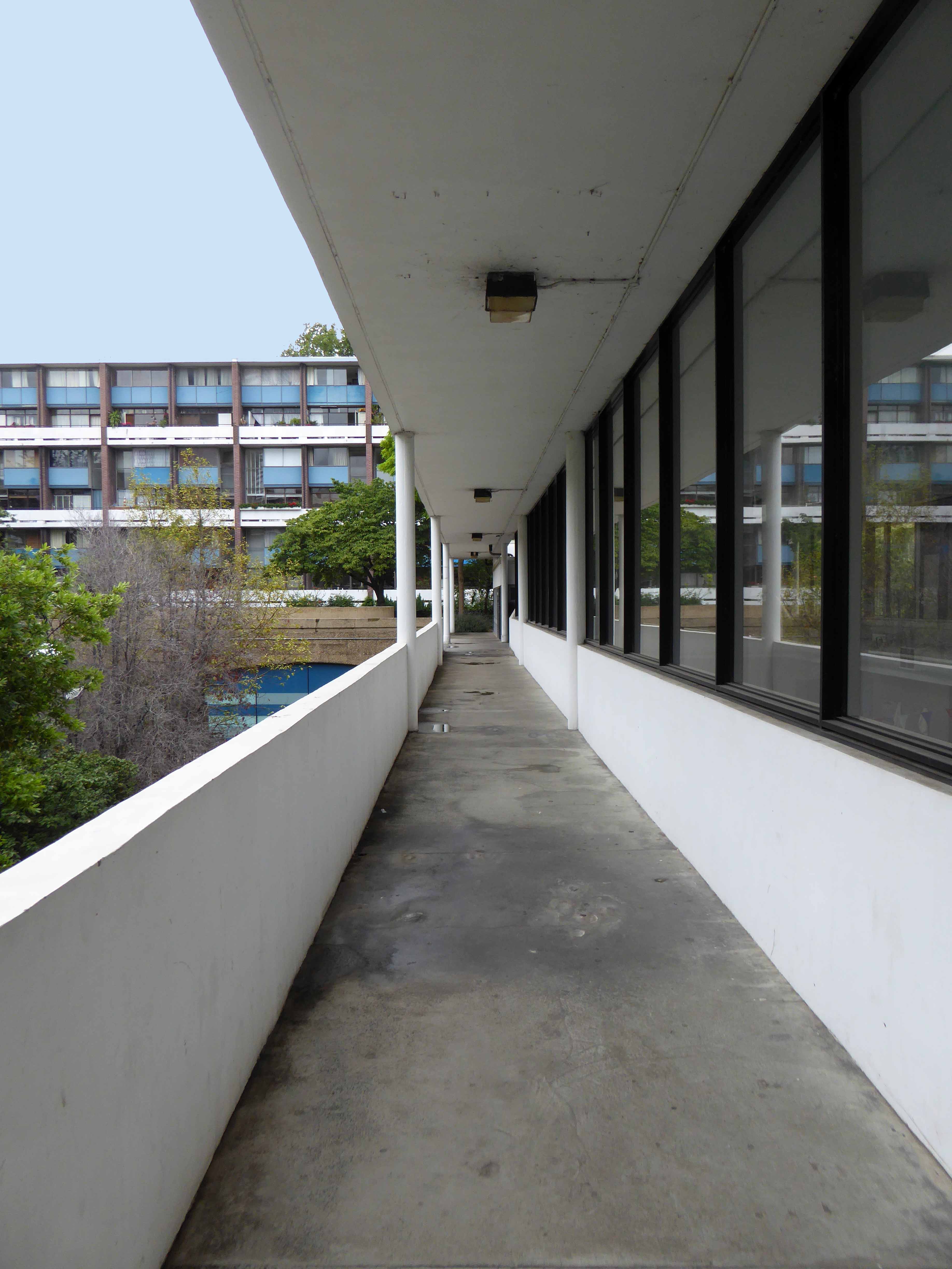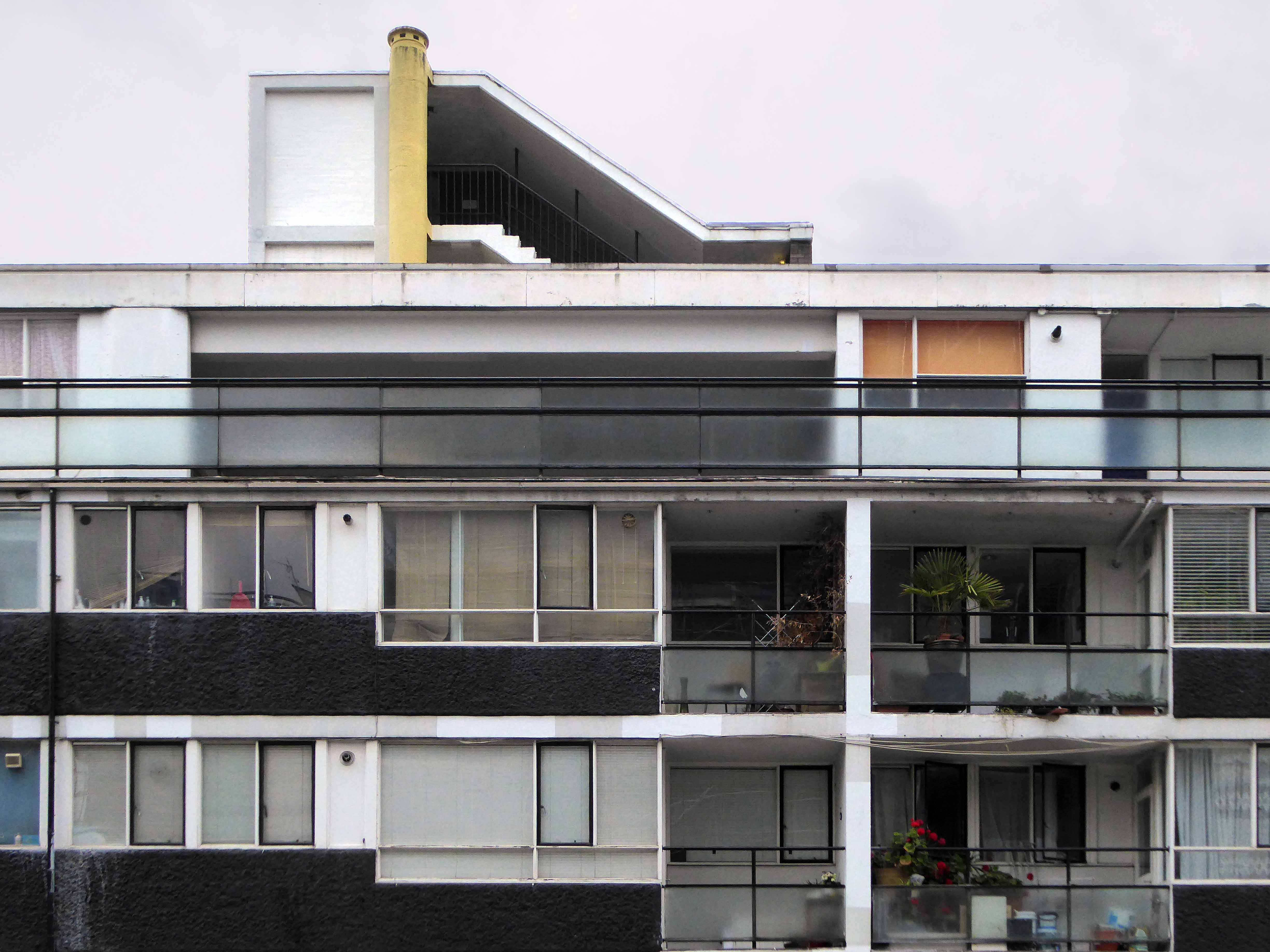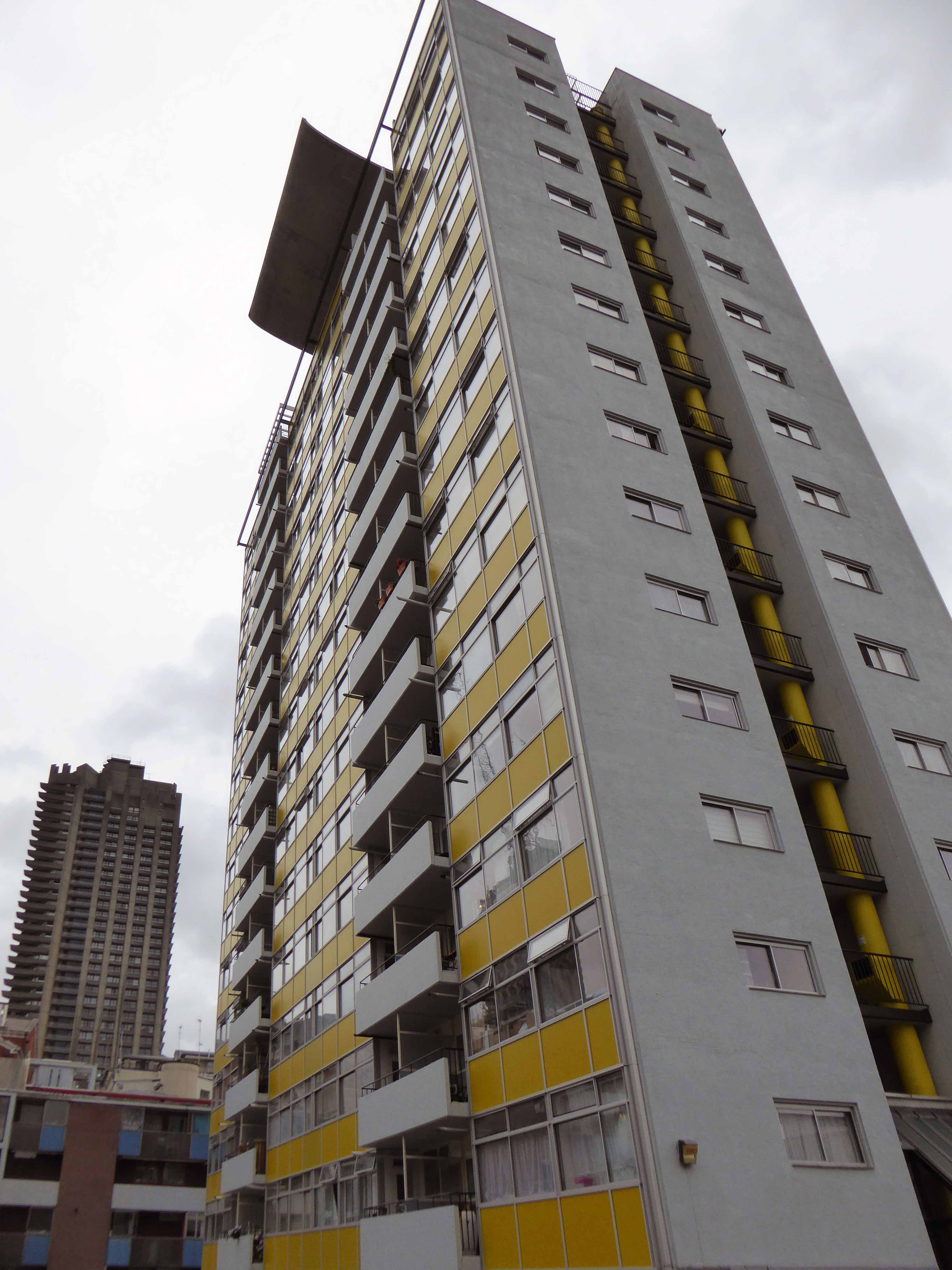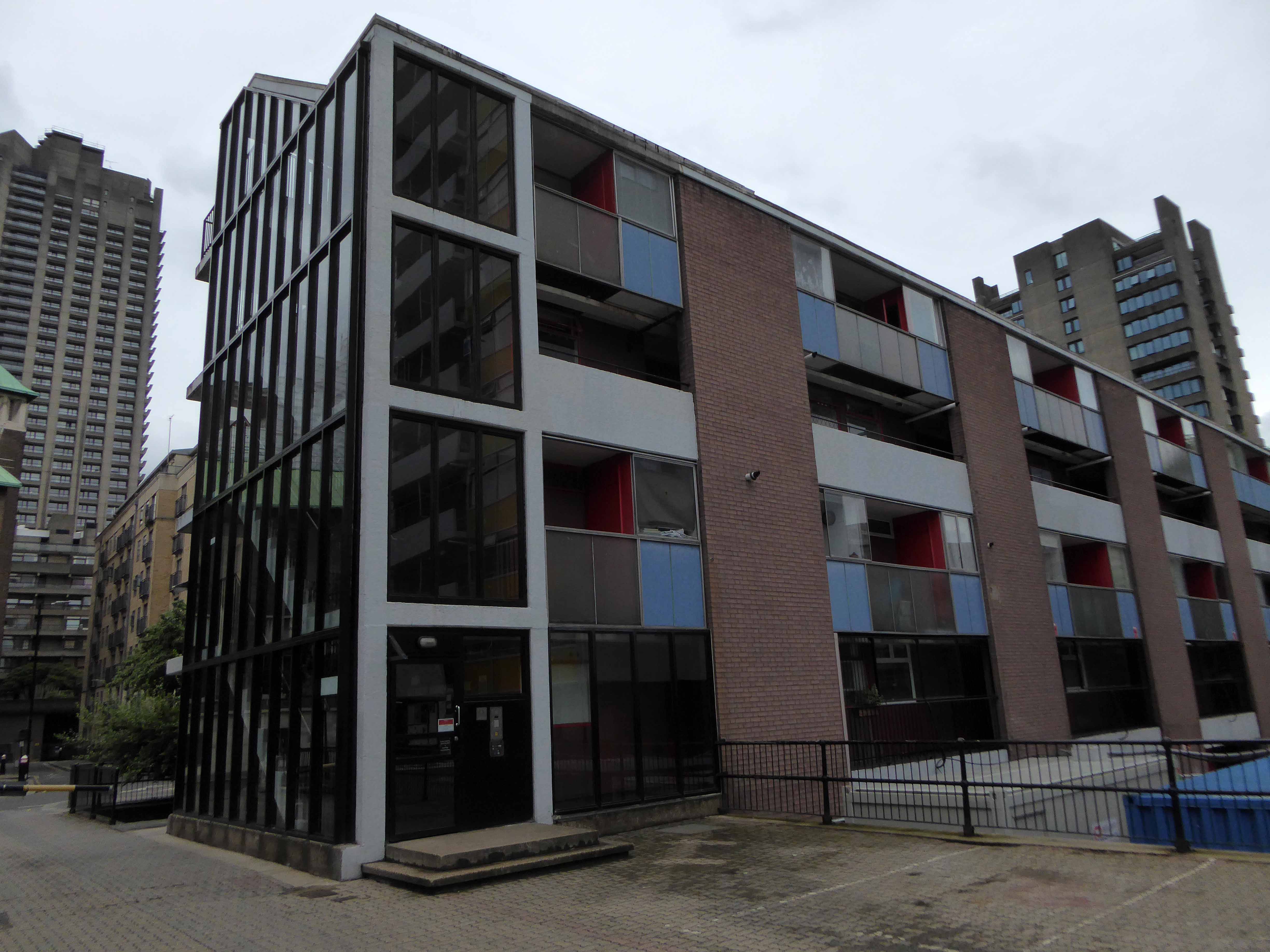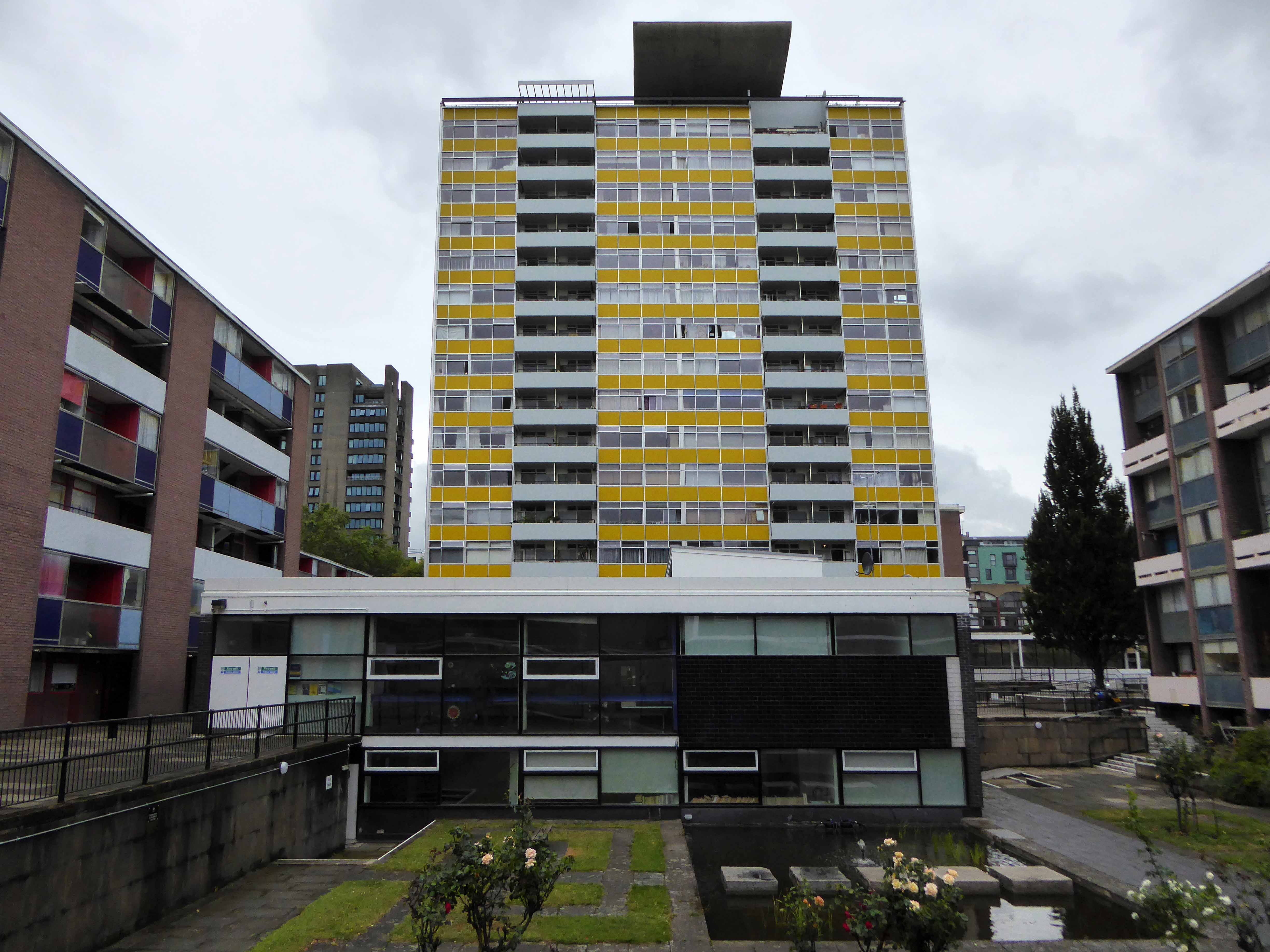 Golden Lane was commissioned from architects Chamberlin, Powell and Bon by the City of London Corporation (which still manages it) and built on bombed sites previously occupied by small businesses and industries. Some of the basement areas of the former buildings were retained as sunken areas of landscaping. Building took place over a 10-year period between 1952 and 1962 when Crescent House on Goswell Road was completed. Golden Lane was listed Grade II in 1997 (Crescent House is Grade II*). When built, Great Arthur House was the tallest residential building in London and its Le Corbusier inspired design included a resident’s roof garden. The estate also included a leisure centre with a swimming pool and tennis courts. It is now run by a private operator and is open to both residents and the general public.