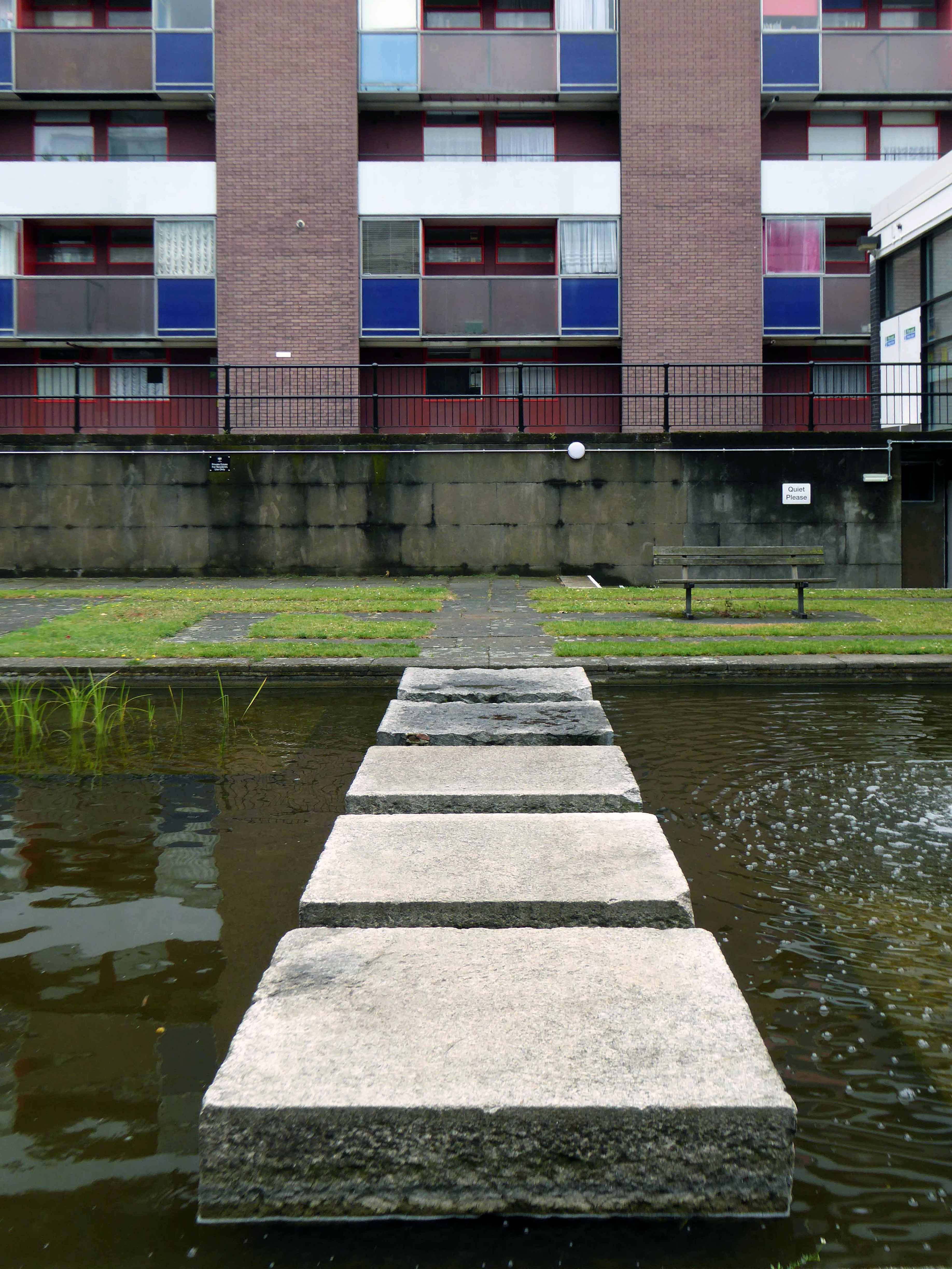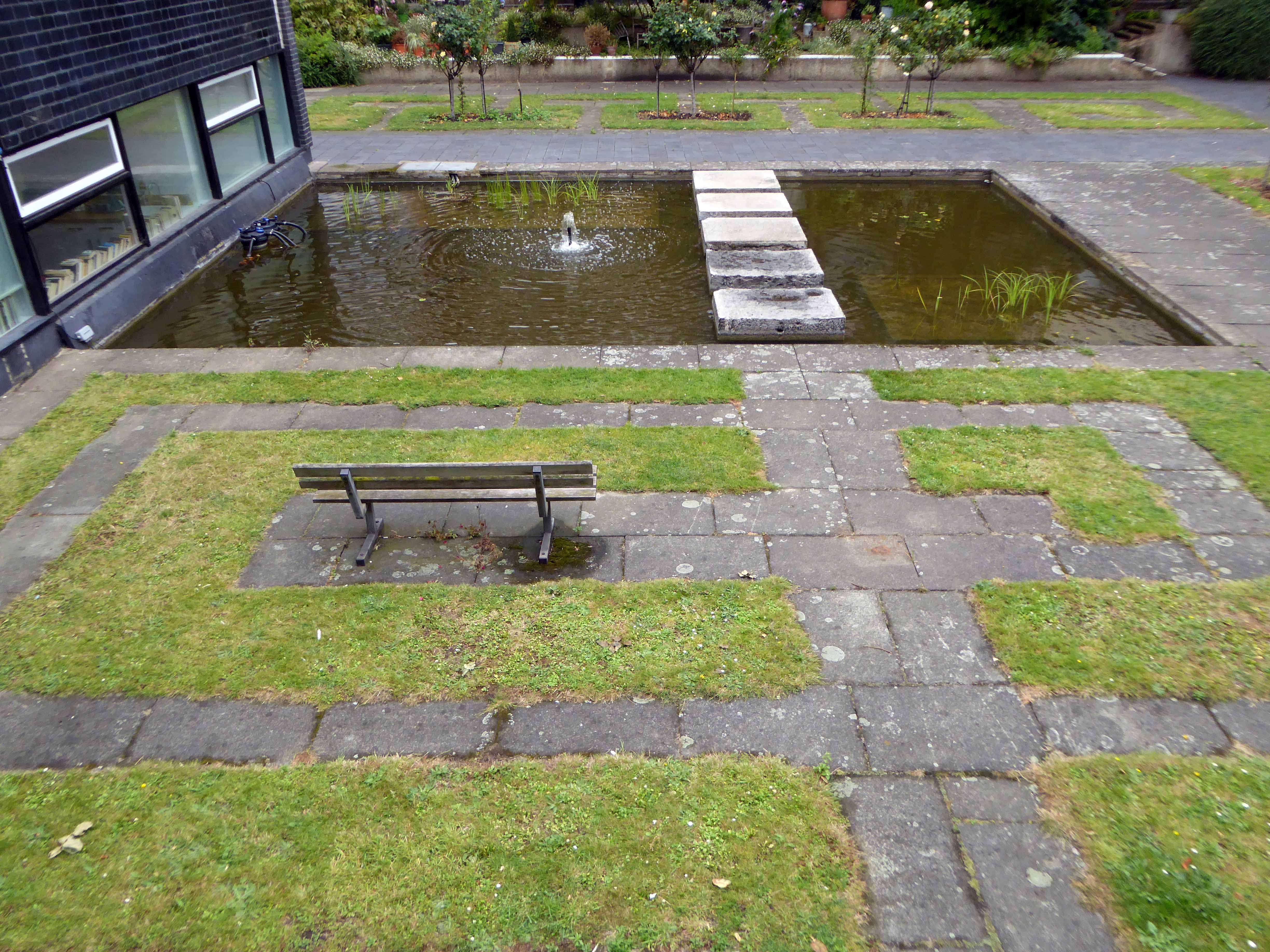 I stuck around too take a look, struck by the variety of scale, detail and space within a relatively tight integrated development. Mature greenery abounds along with a delightful water feature.