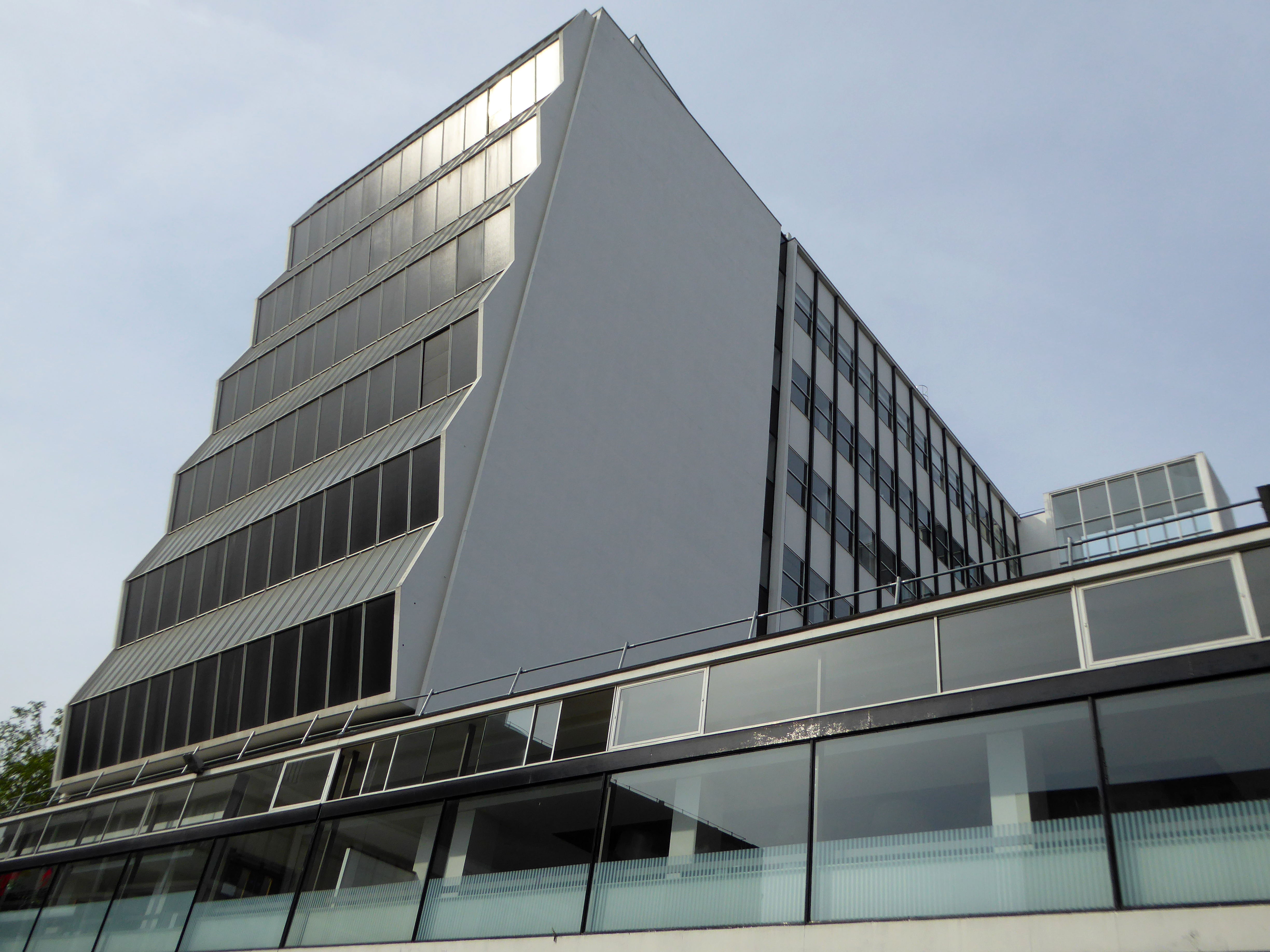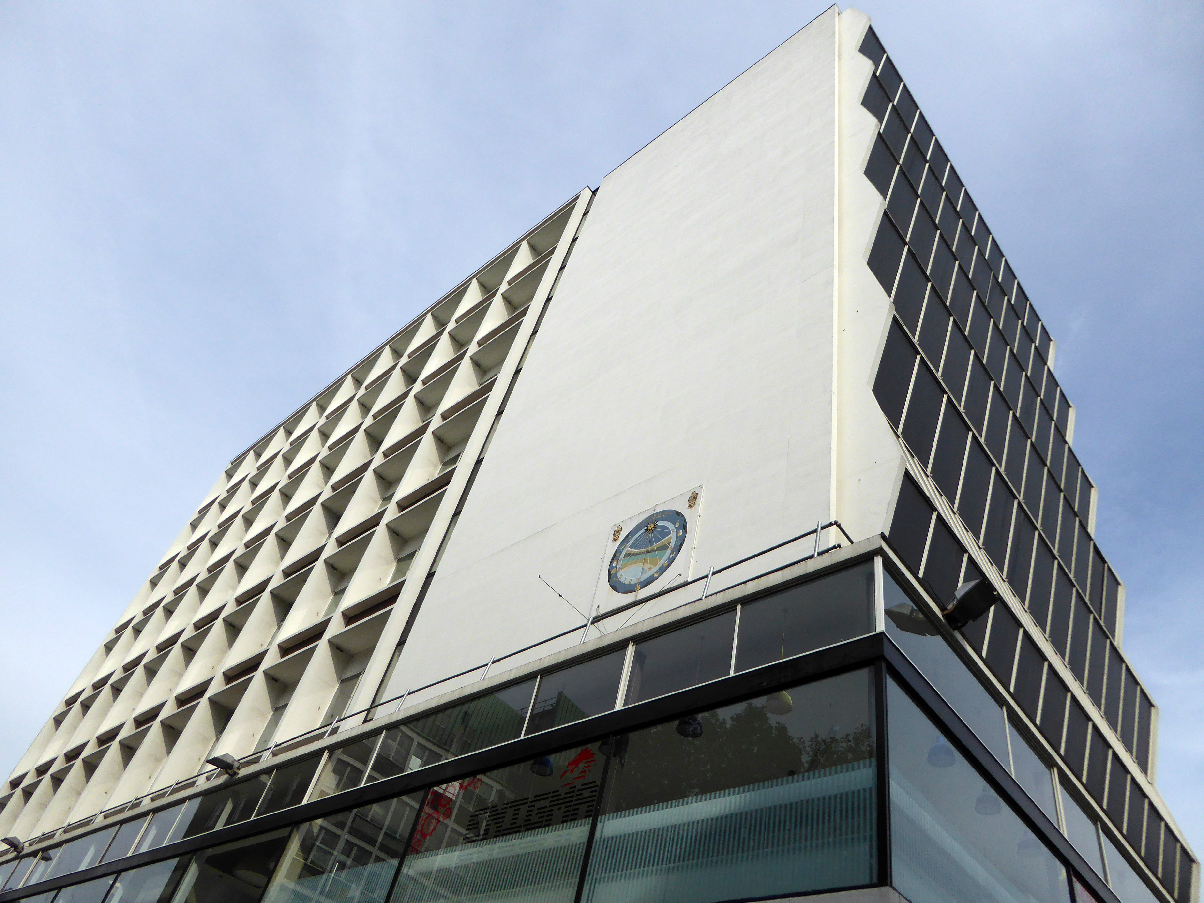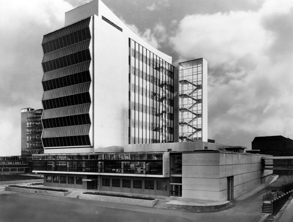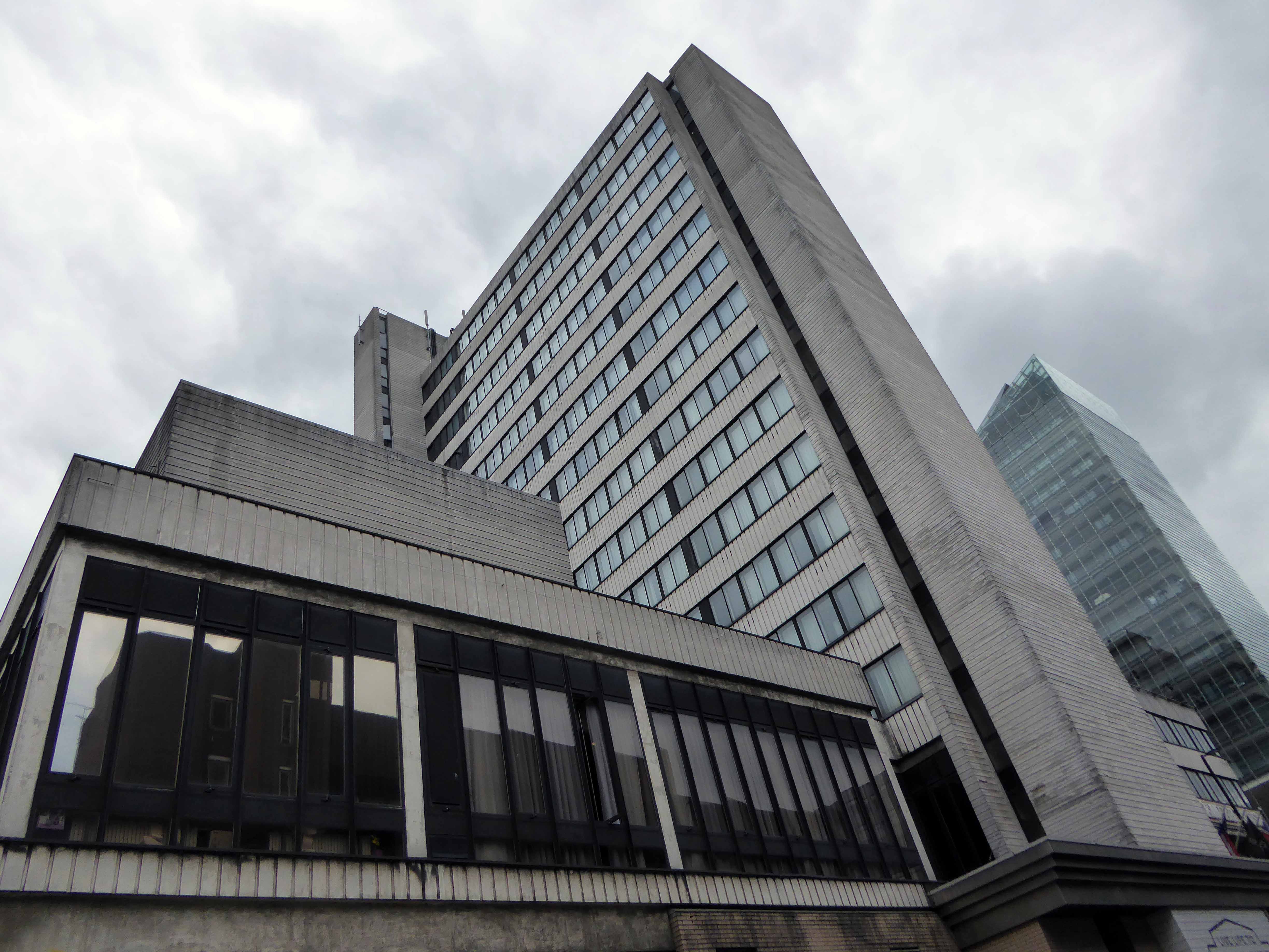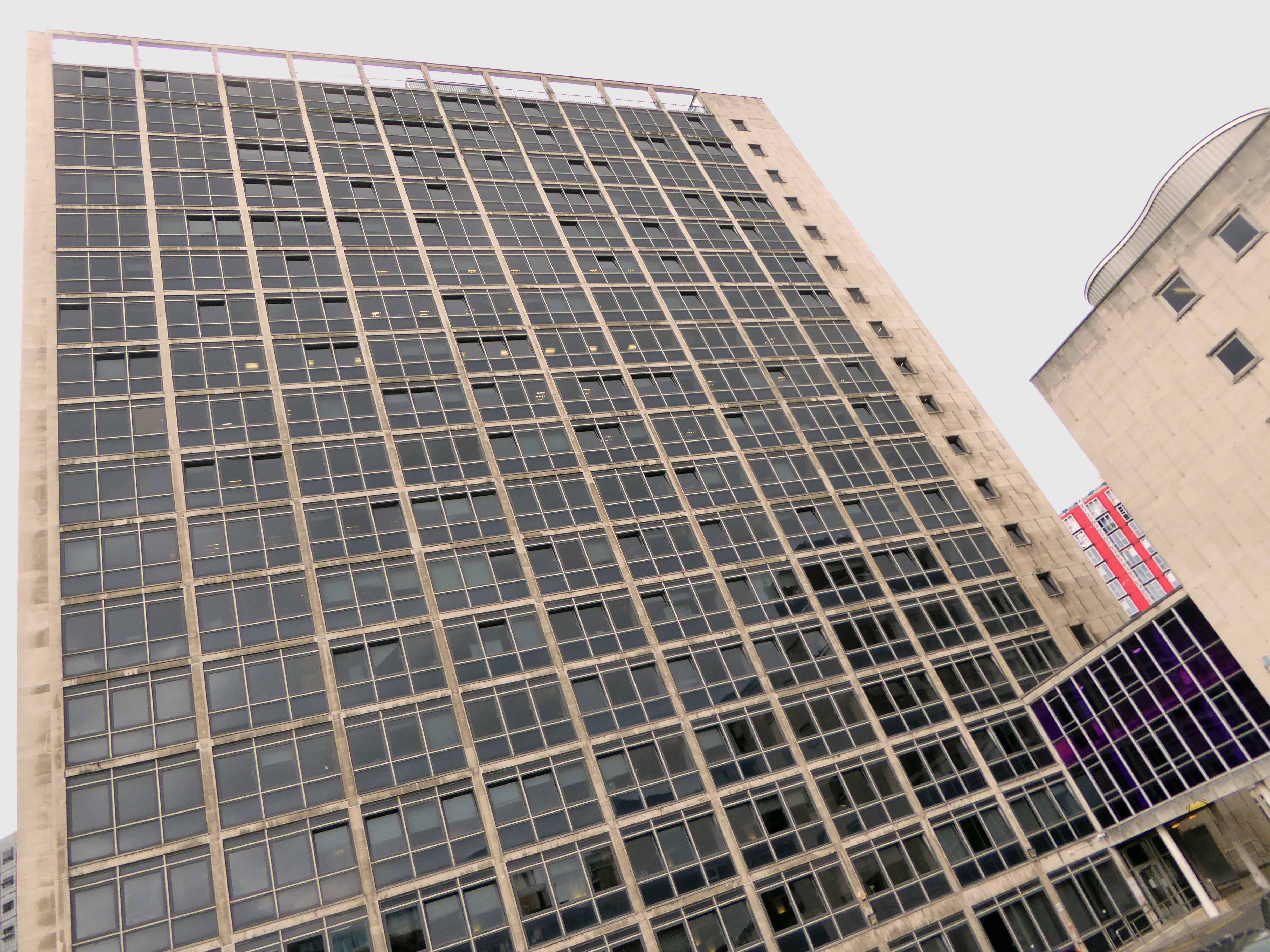 Several storeys of variegated concrete panels cladding and glass – a voluminous yet relatively low rise development of the 1960s.