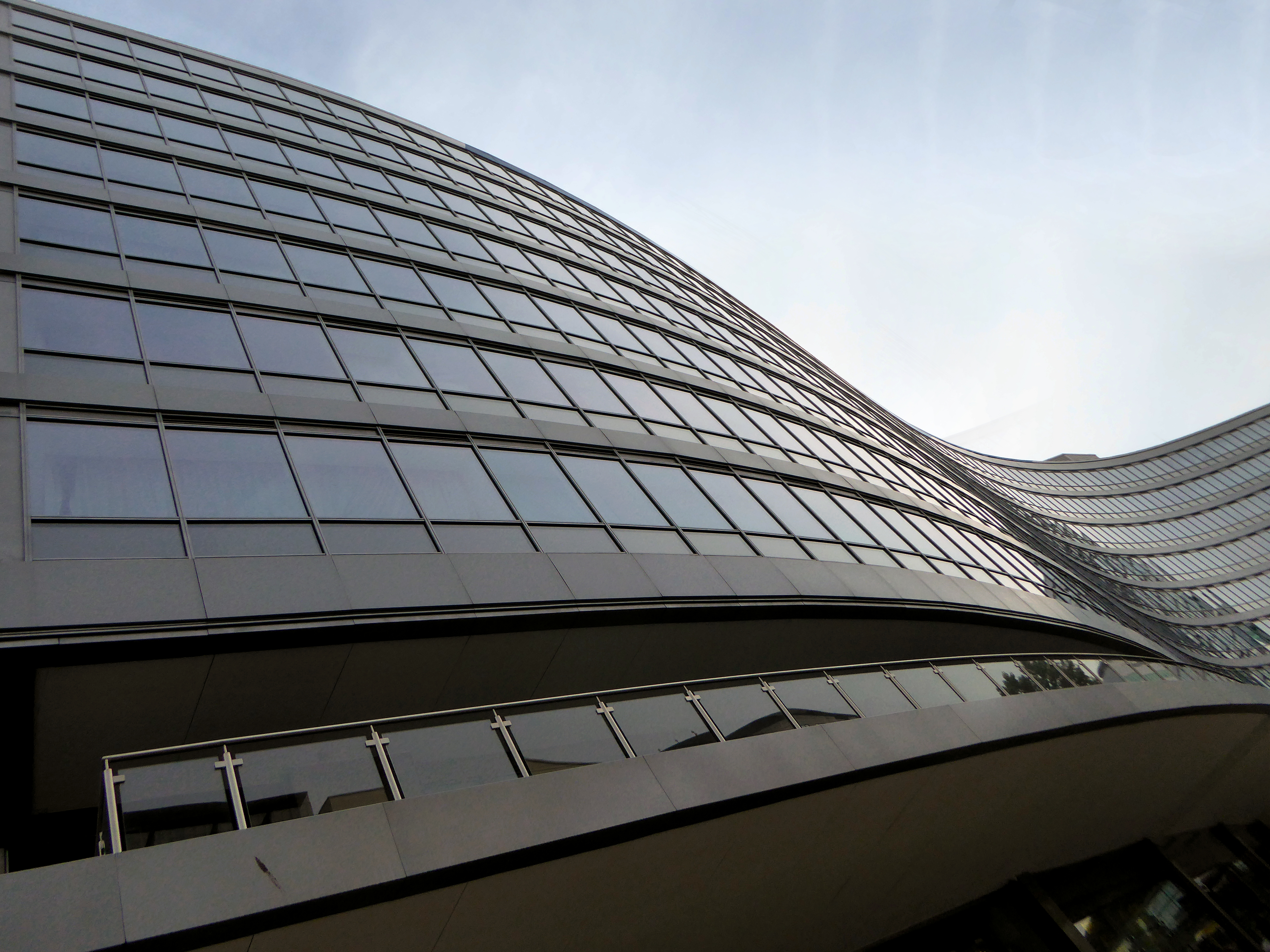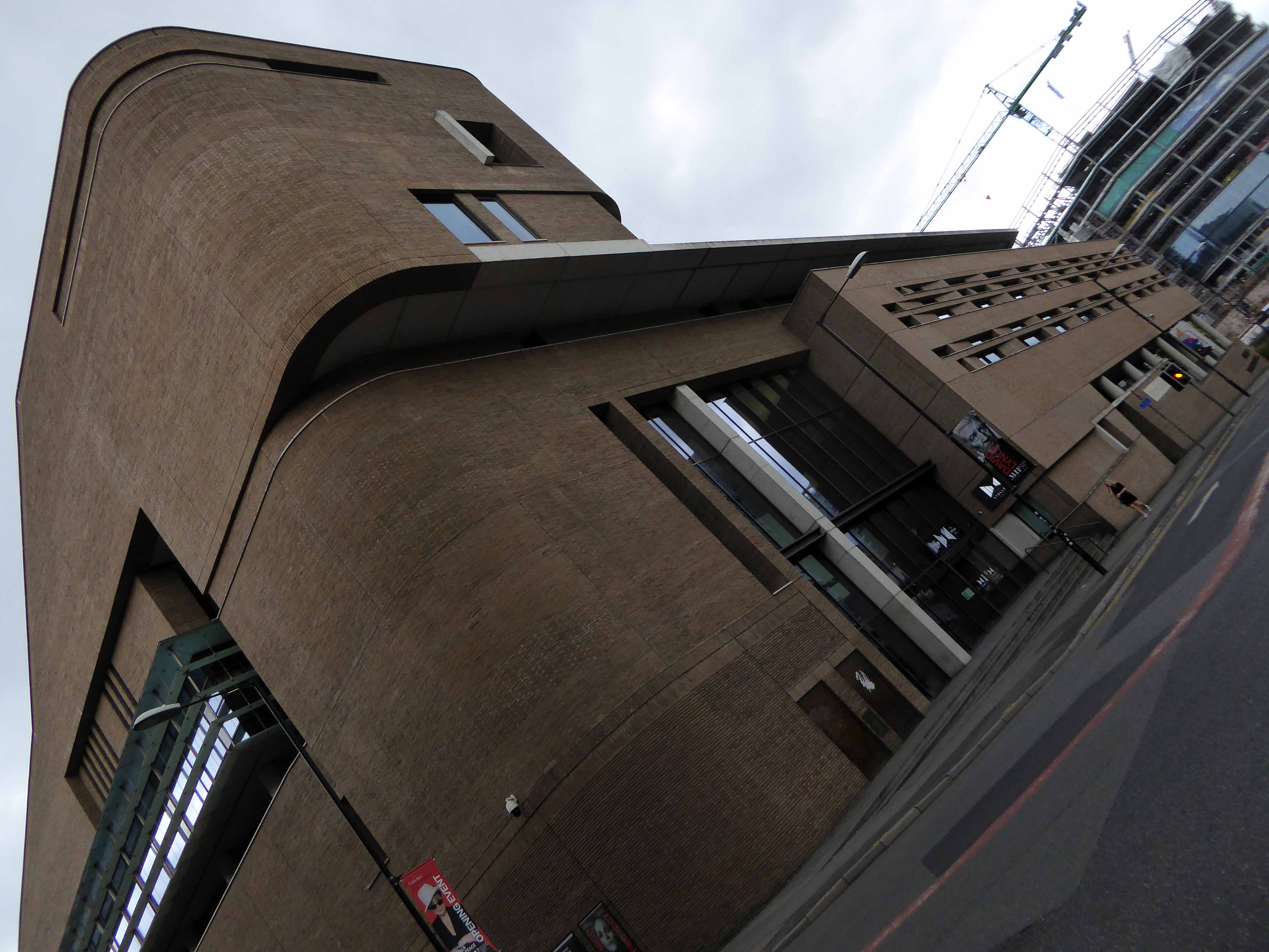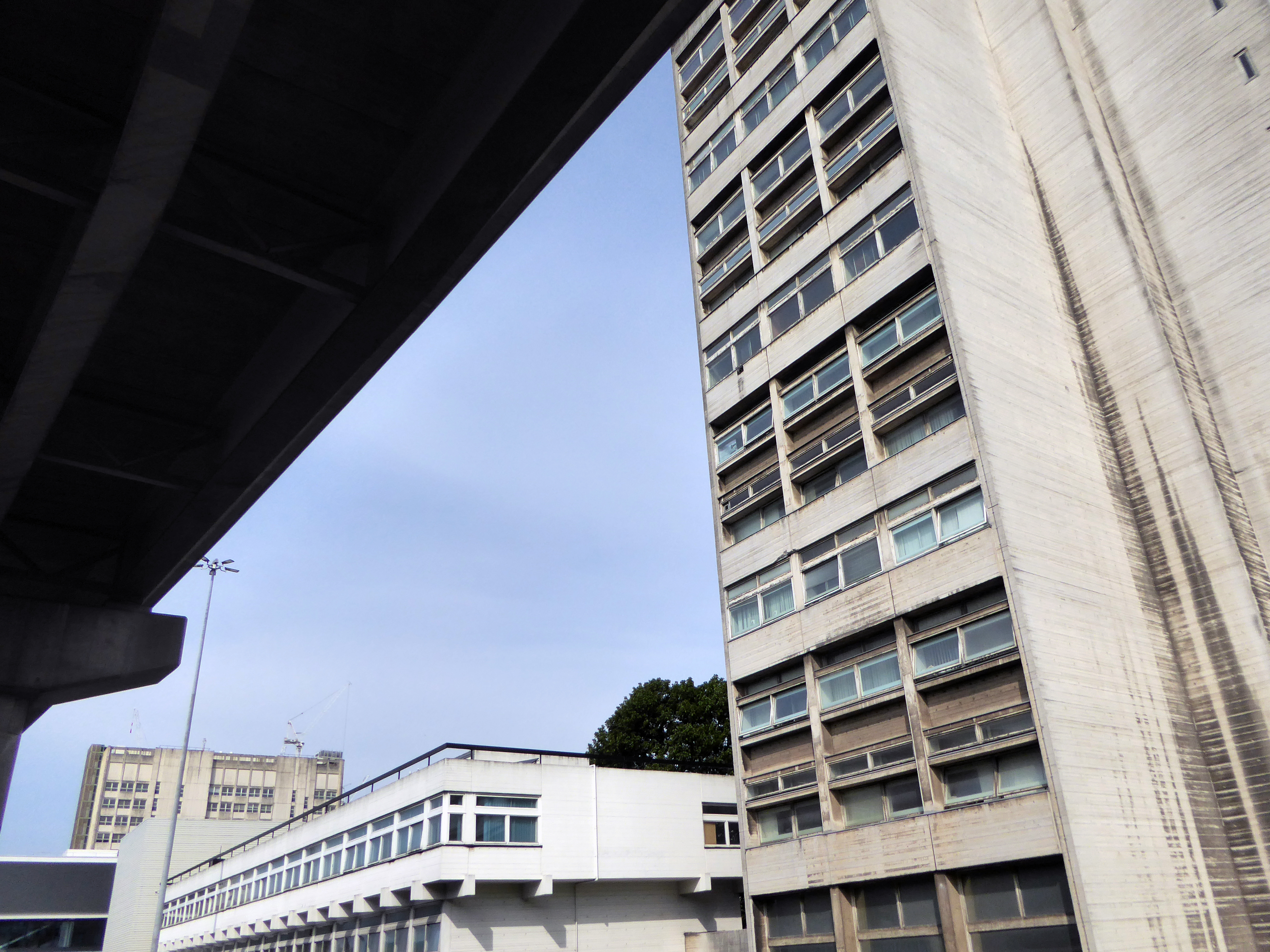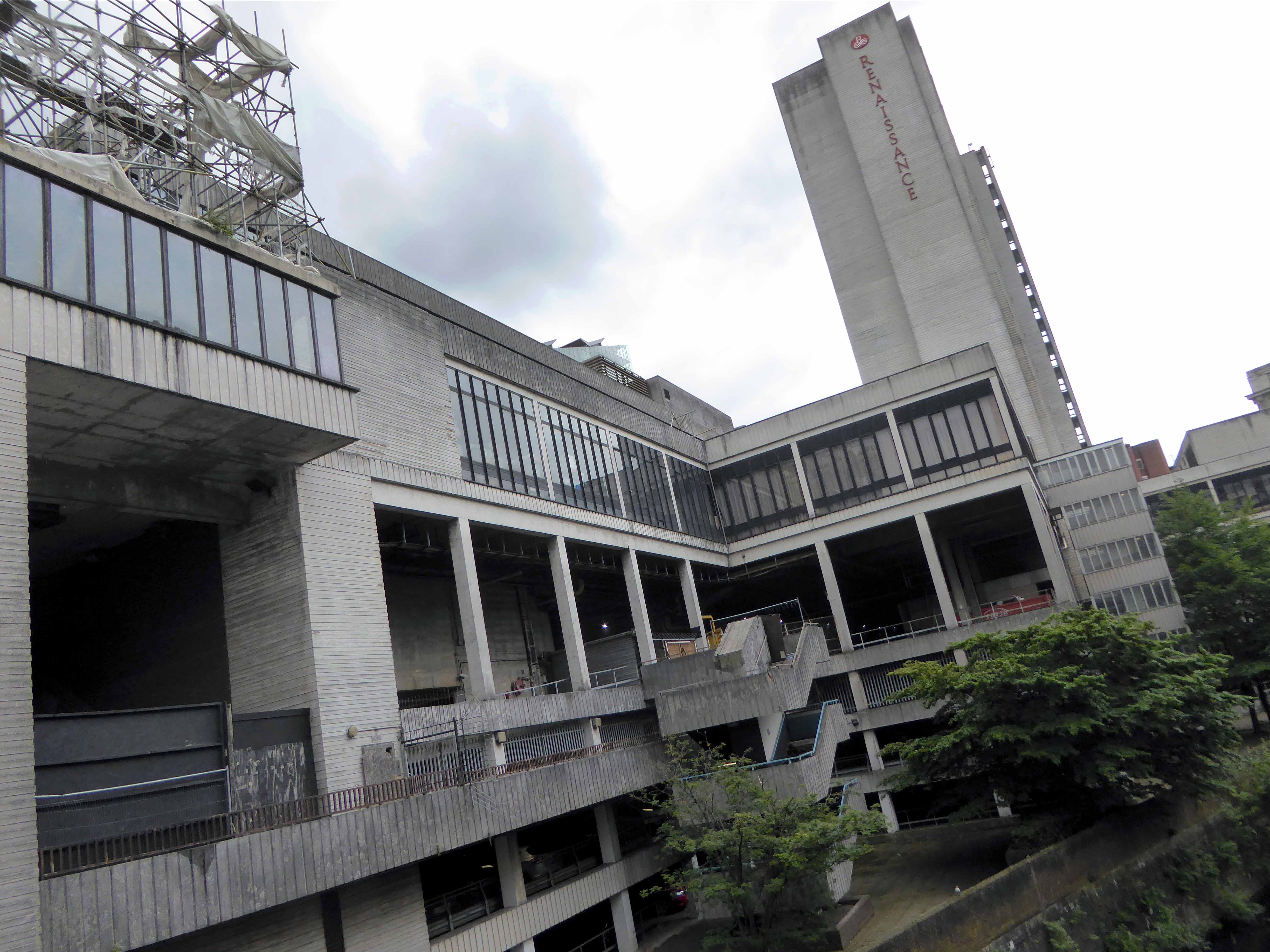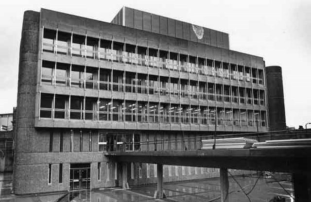 Several storeys of variegated concrete panels cladding and glass – a voluminous yet relatively low rise development of the 1960s.