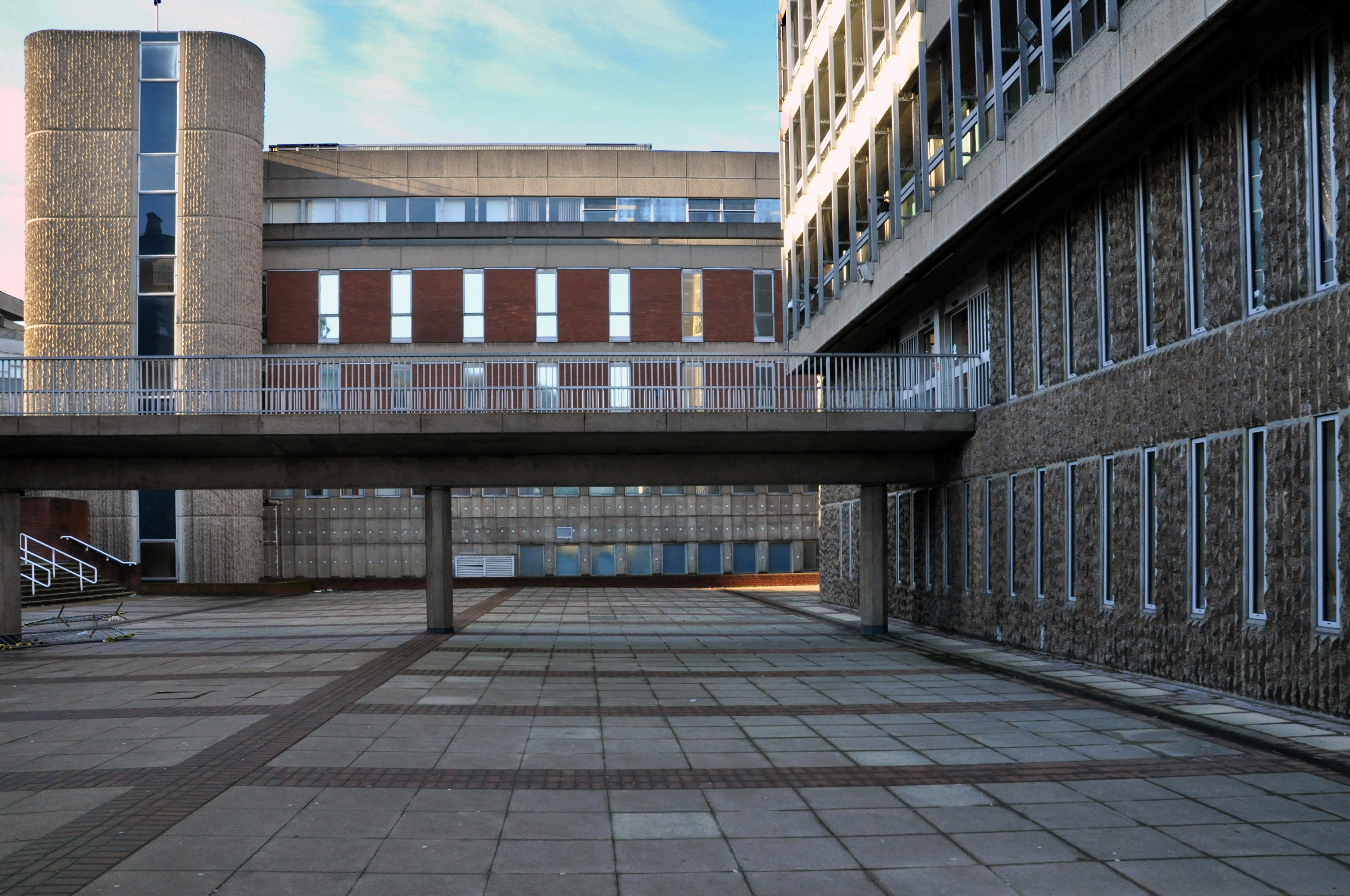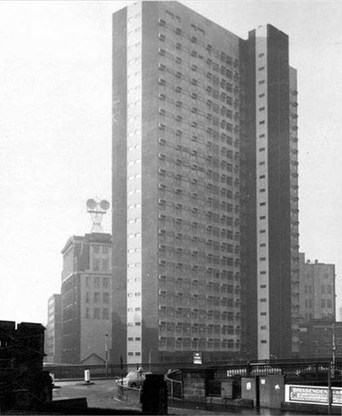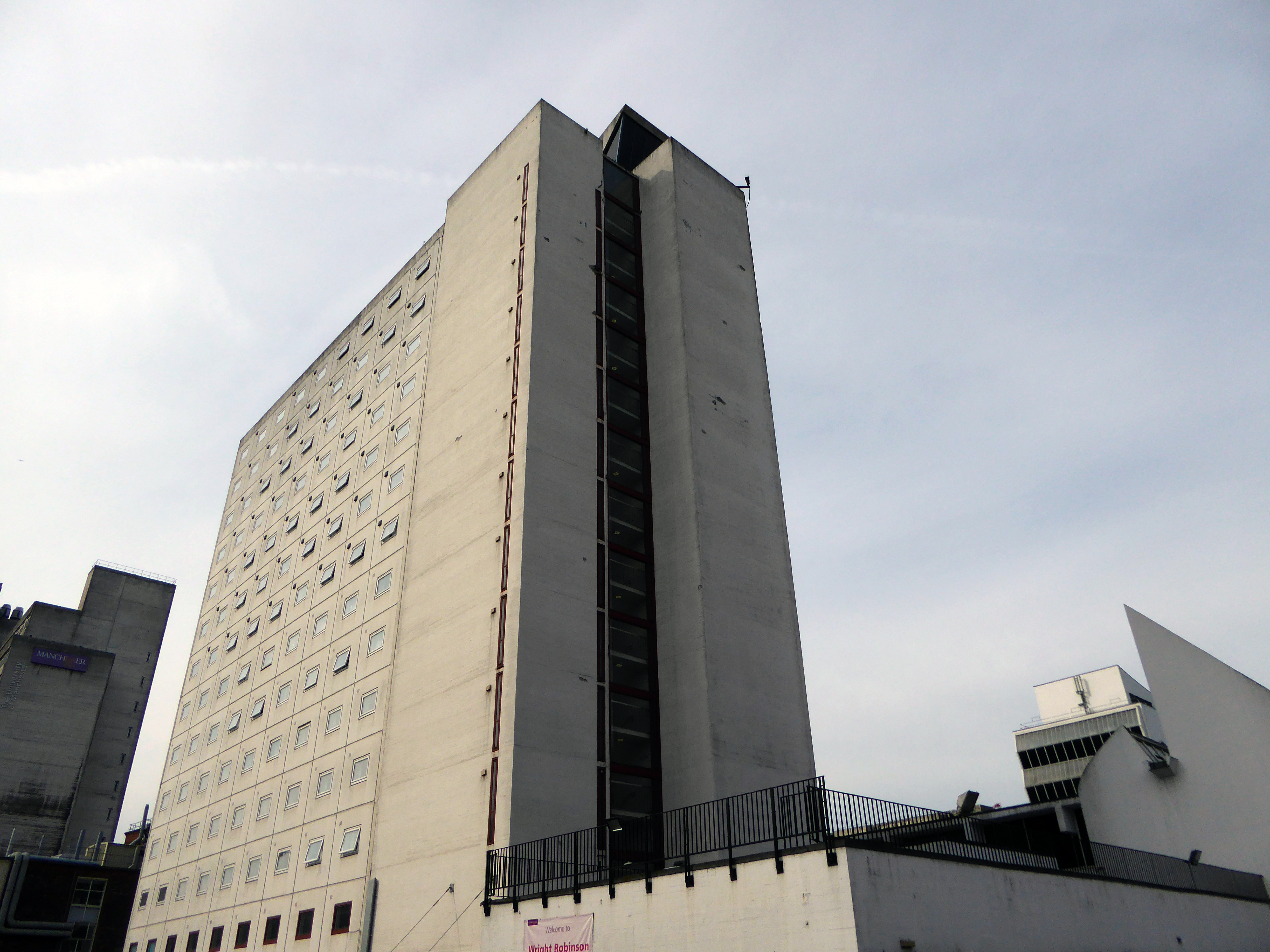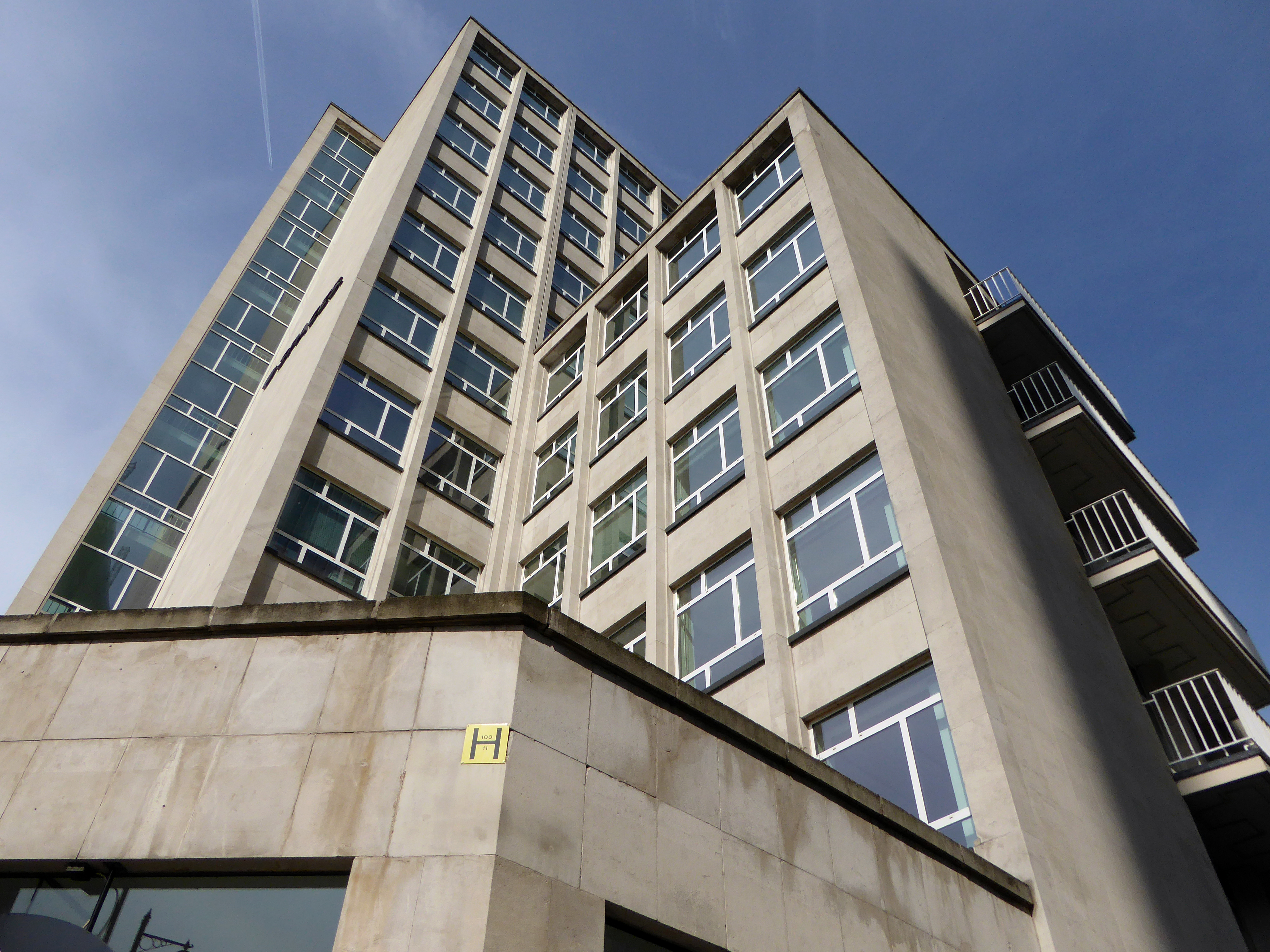 Faraday Tower was designed by H. M. Fairhurst and built in 1967. A bridge connected it to the Faraday Building. Originally a library occupied the bridge.
