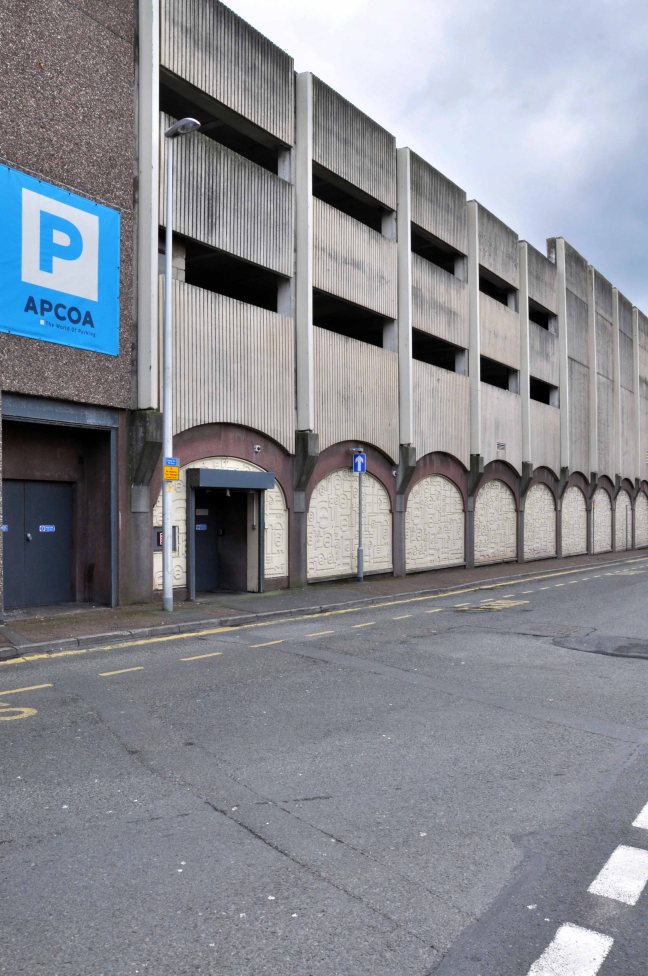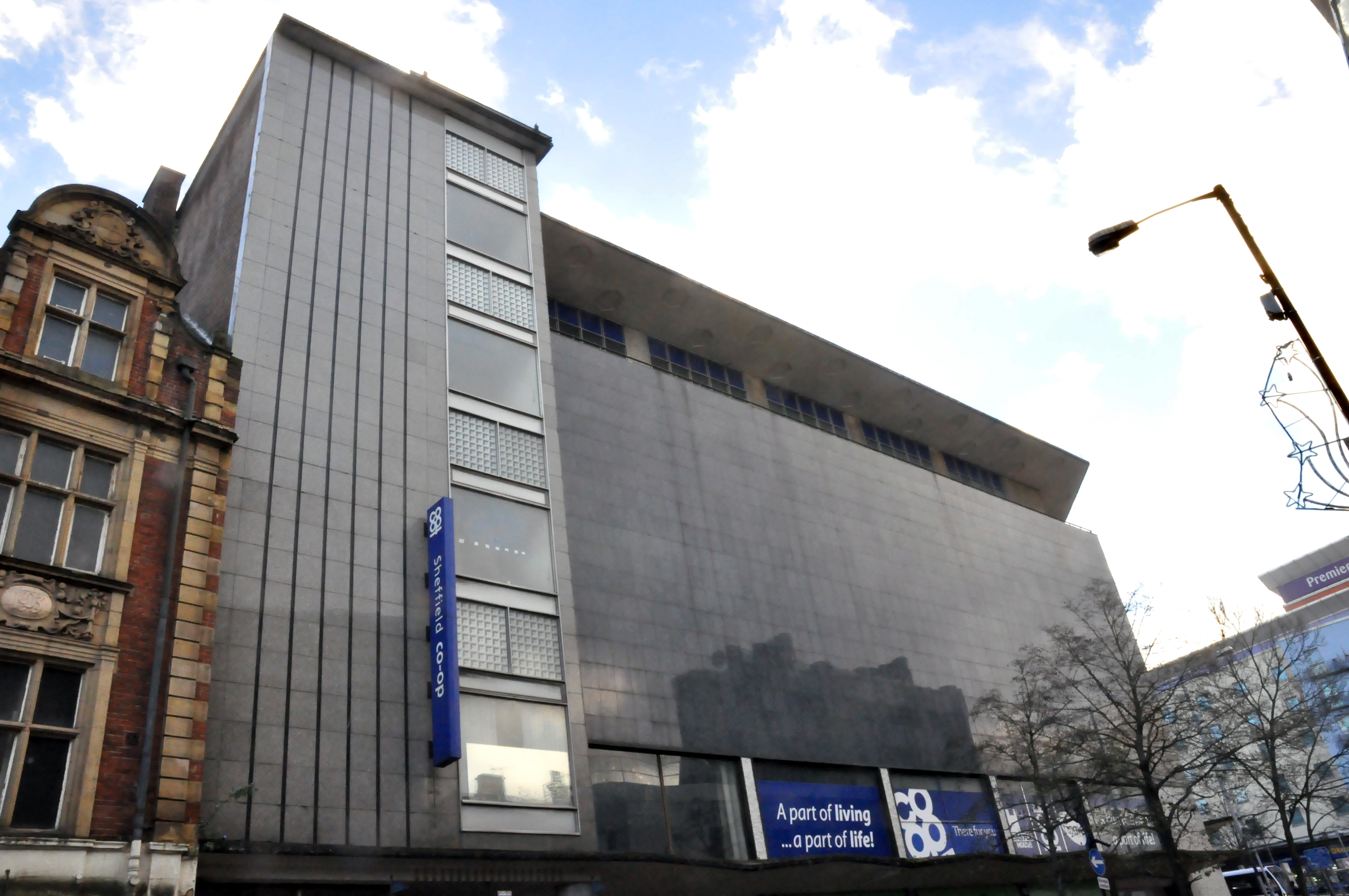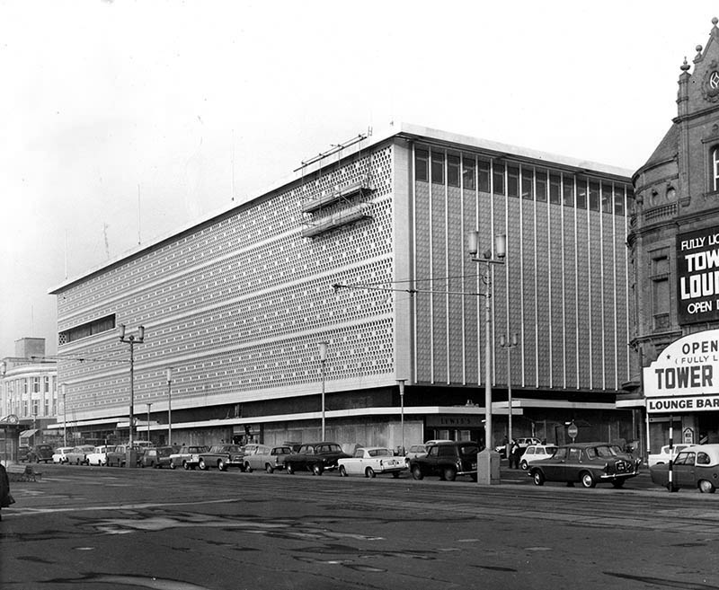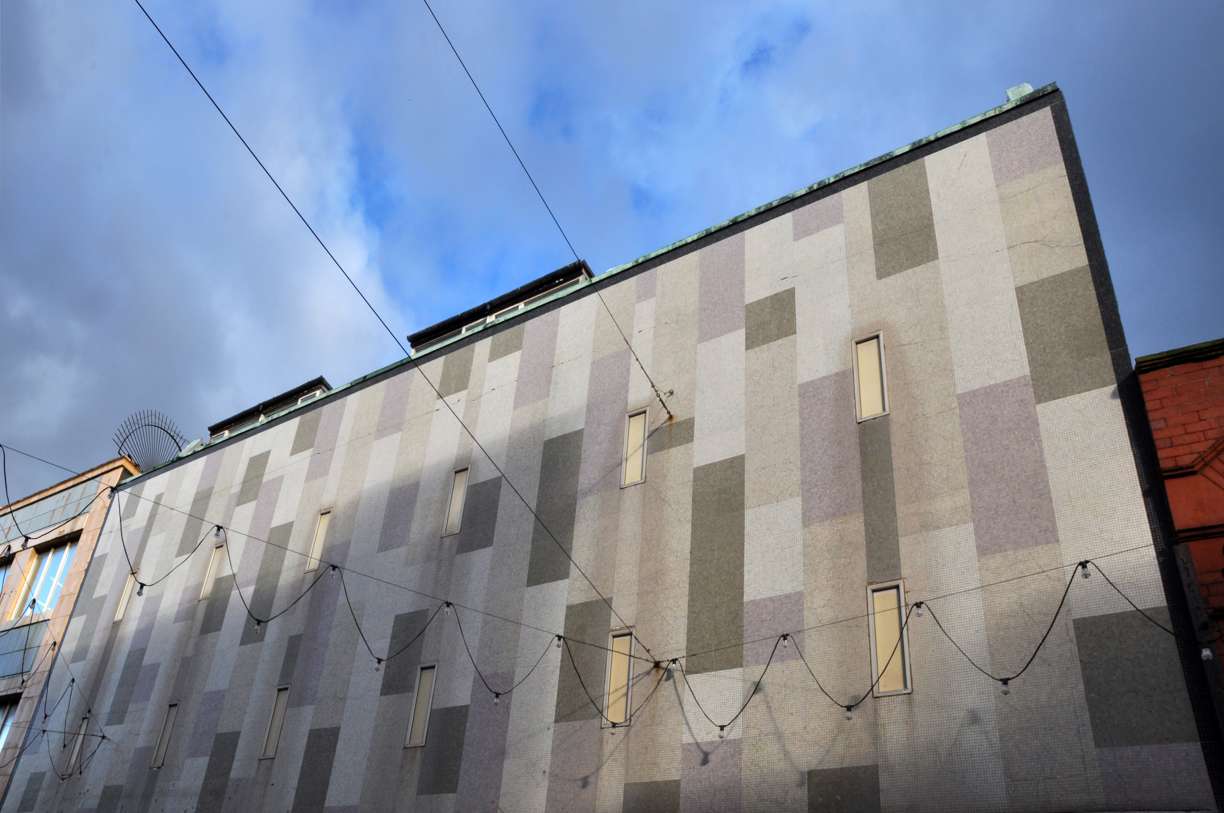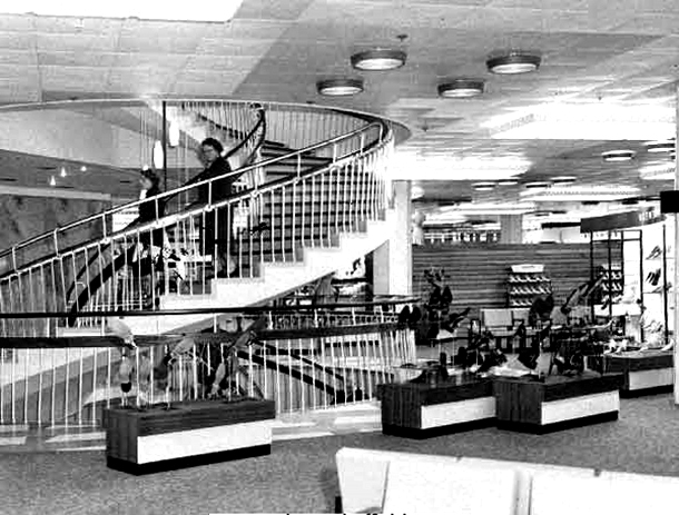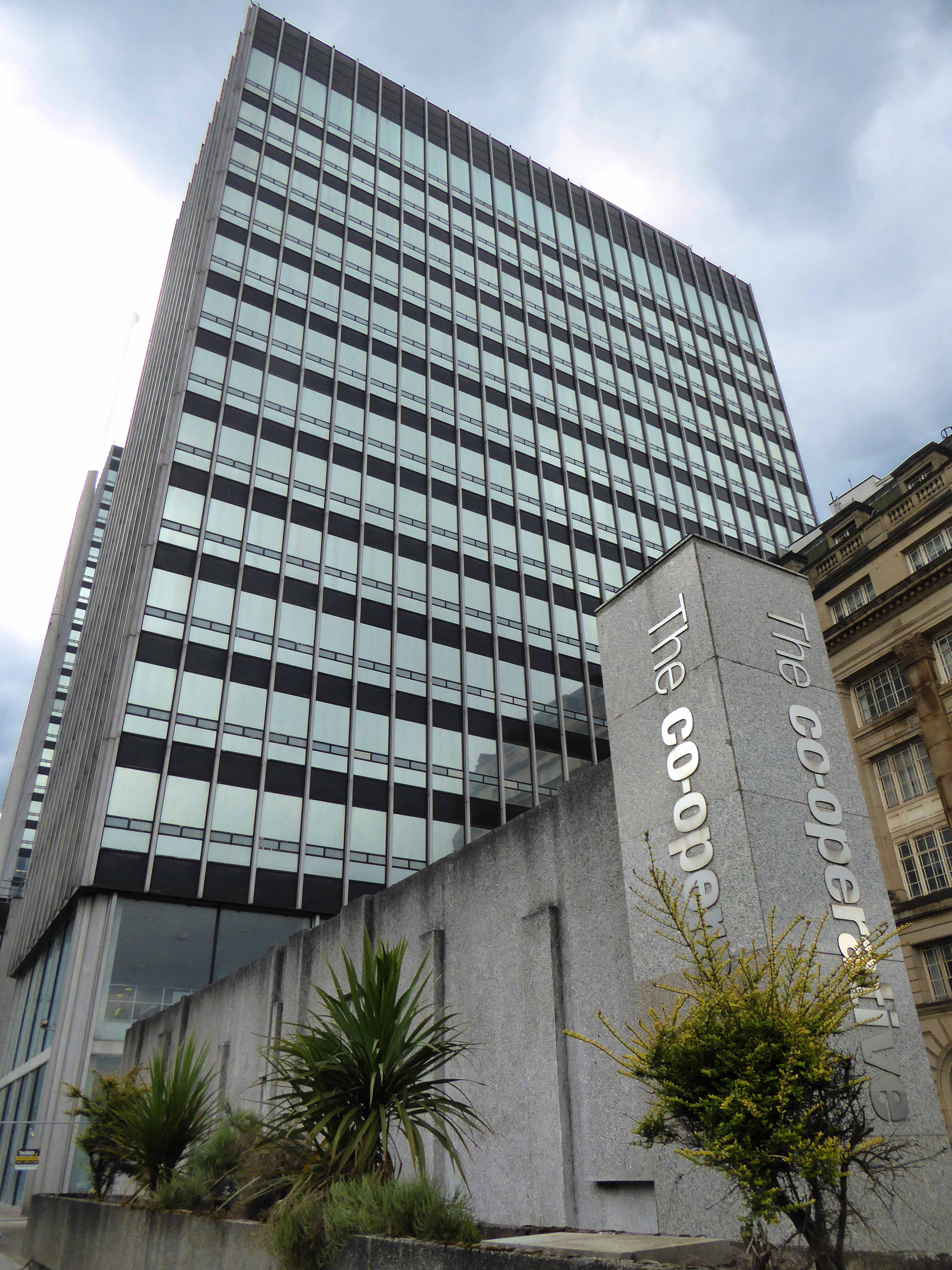 Grade II Iisted Co-operative department store described by Historic England as ‘1964 by George S Hay, Chief Architect for CWS, with interior design by Stanley Layland, interior designer for CWS. Reinforced concrete with Blue Pearl granite tiles and veneers, grey granite tiles and veneers, buff granite blocks, glass, and brick.’