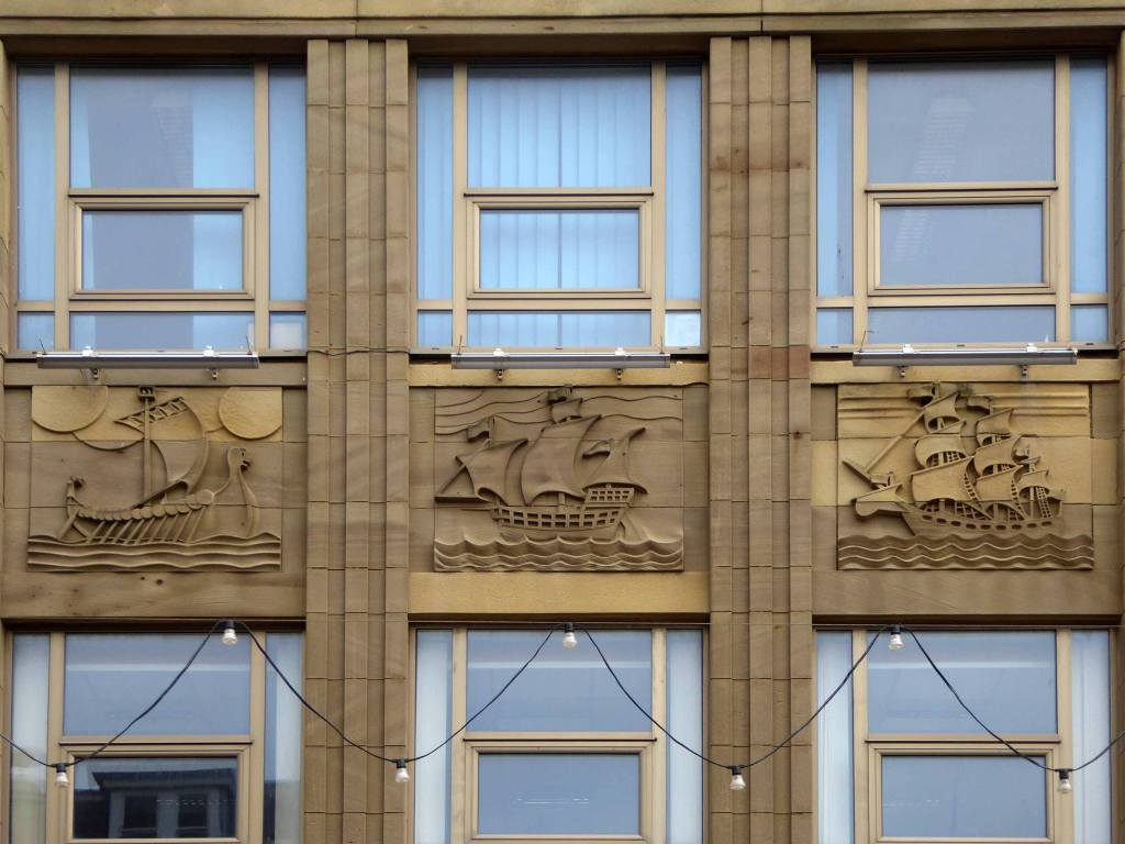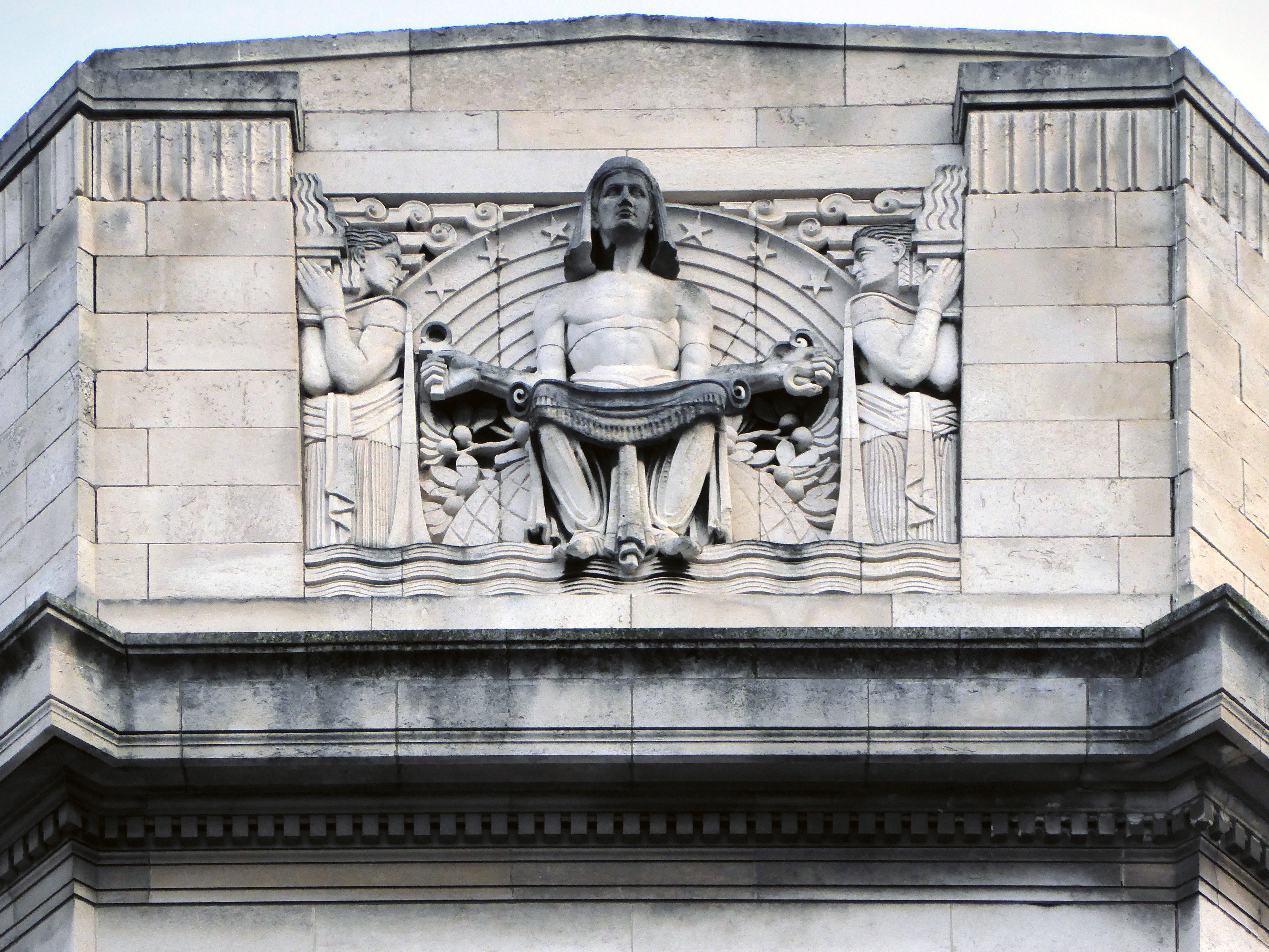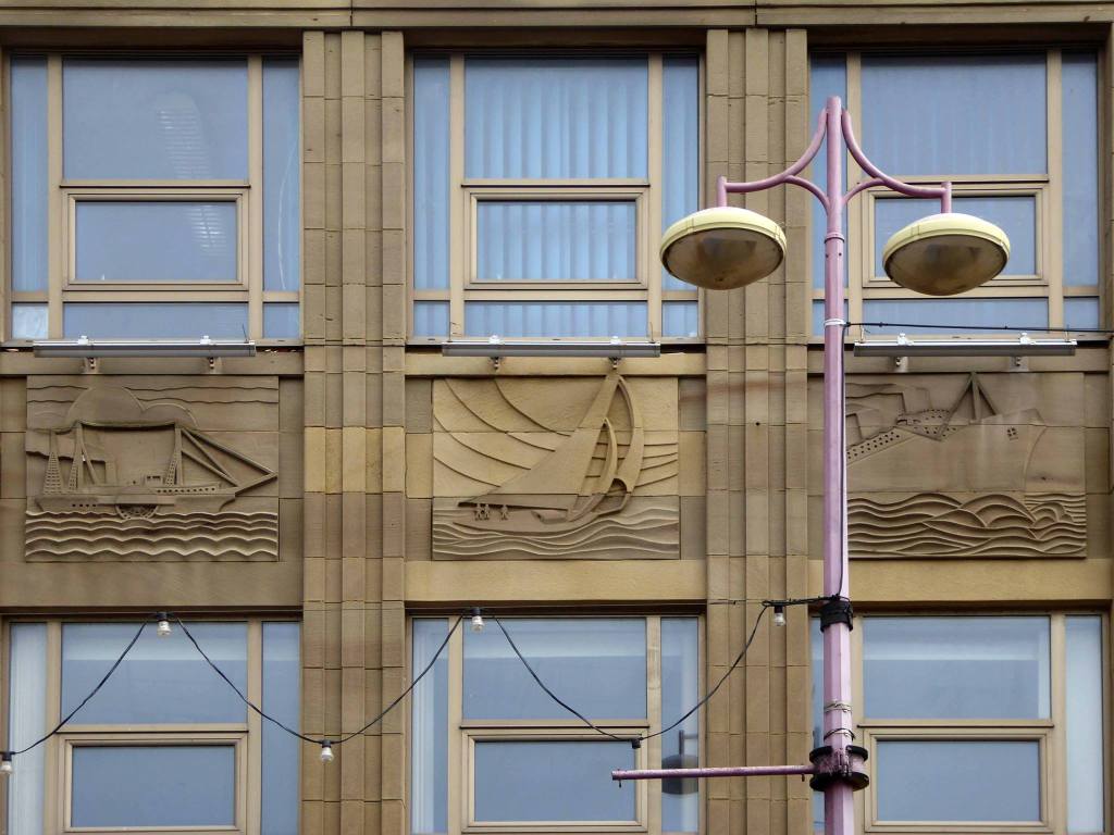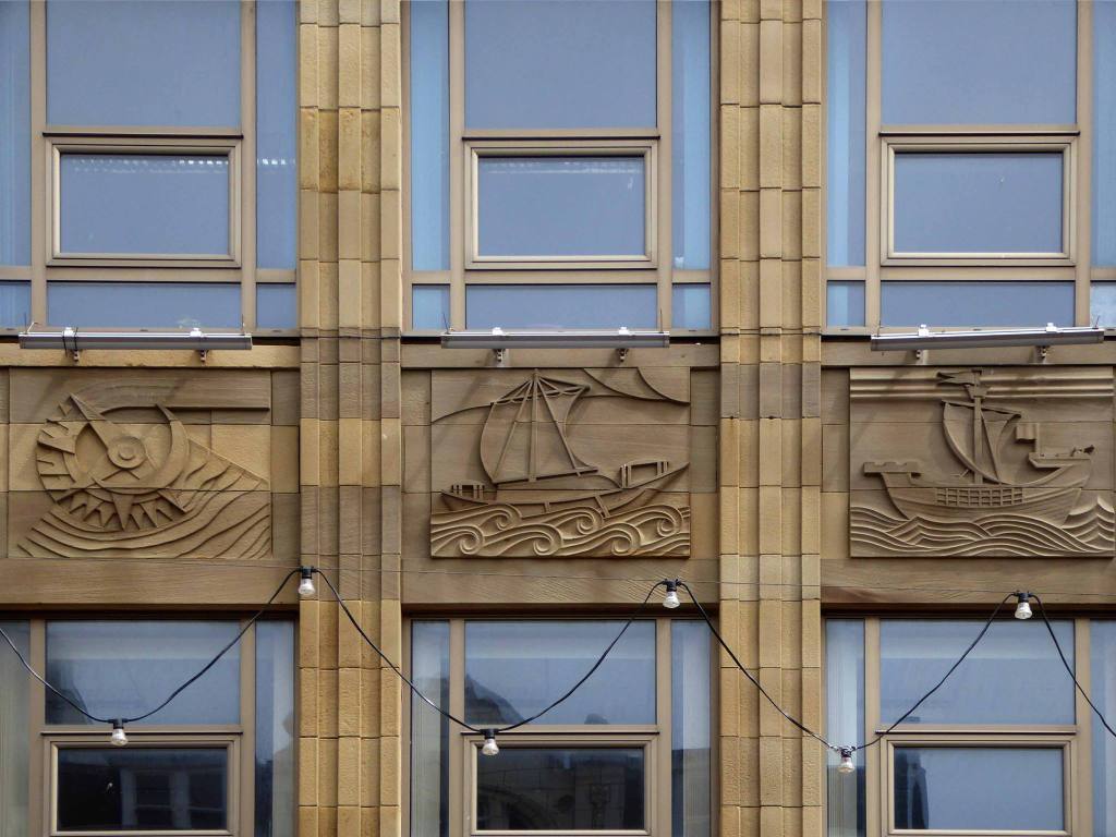 Passing the Graves by City Architect WG Davies 1929-34, with a friendly nod to inter-war Modernity. Intended to form one side of an unrealised civic square proposed by Patrick Abercrombie in 1924. The exterior carved work is by Alfred and William Tory.