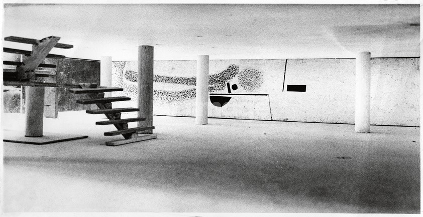 High atop the intoxicating vertiginous swirl of the central spiral stairway is the relief mural representing a cockerel and fish made of aluminium, copper and metal rod, with red French glass for the fish’s eye and cockerel’s comb.