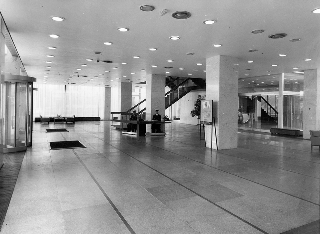 1964 by George S Hay, Chief Architect for CWS, with interior design by Stanley Layland, interior designer for CWS. Reinforced concrete with Blue Pearl granite tiles and veneers, grey granite tiles and veneers, buff granite blocks, glass, and brick.