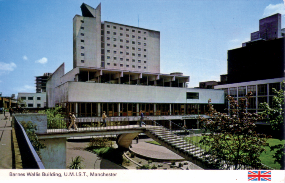 Renold Buildingdesigned by W. Arthur Gibbon of Cruickshank and Seward. It was one of a suite of white concrete structures on the UMIST campus in Manchester. It was the first of its type in the UK – an entire building to house lecture theatres and seminar rooms.