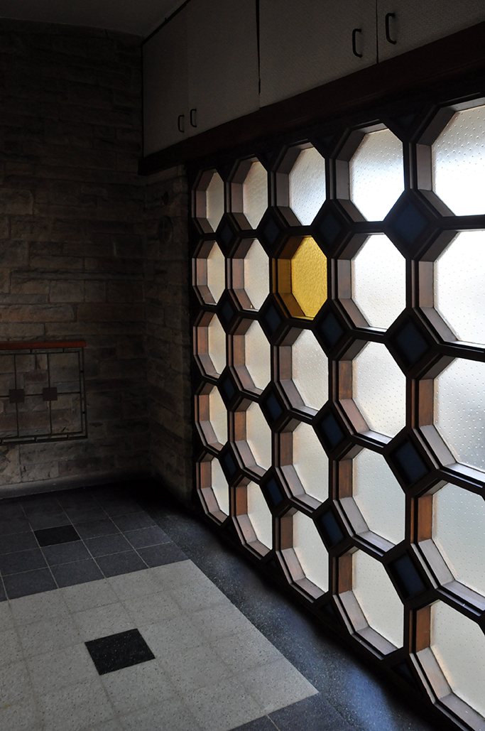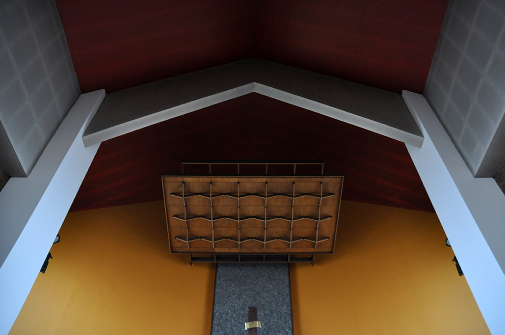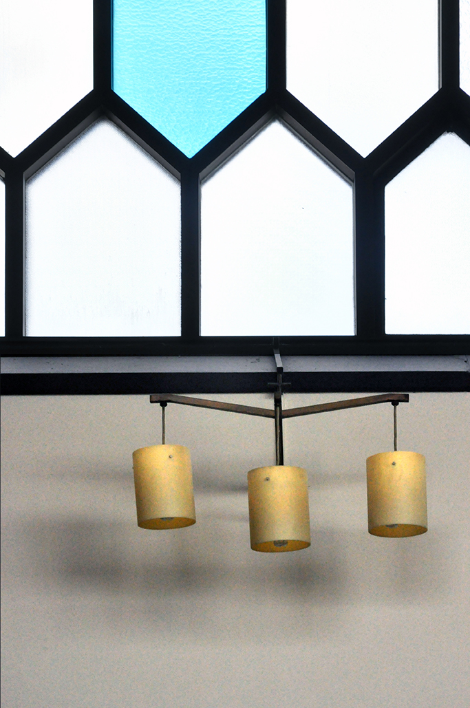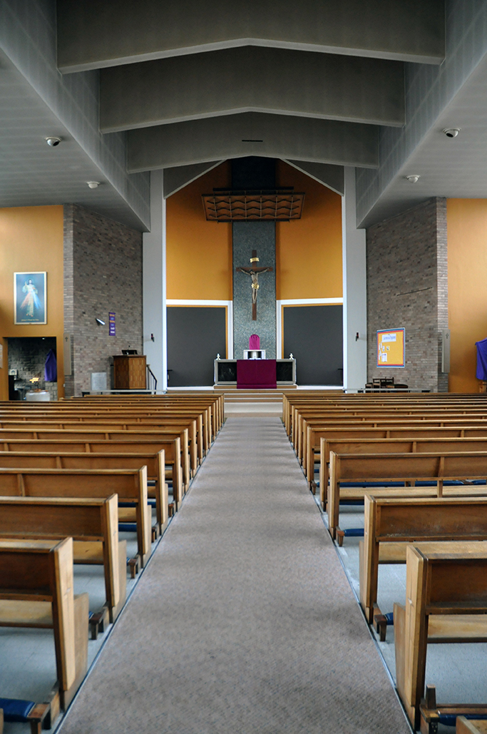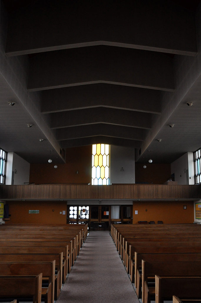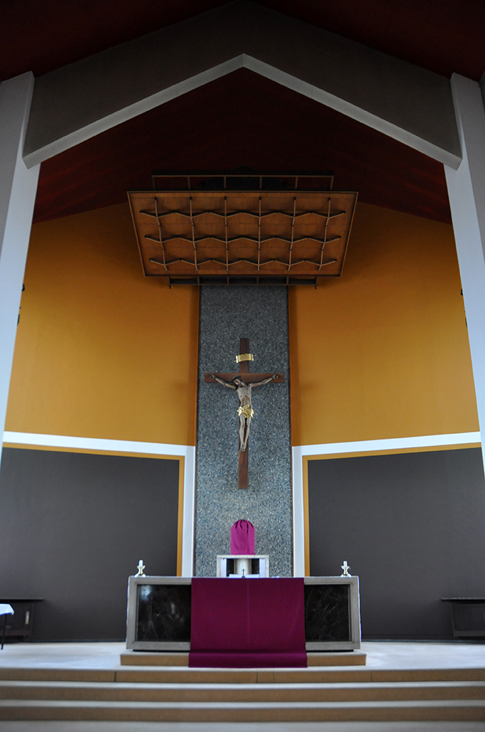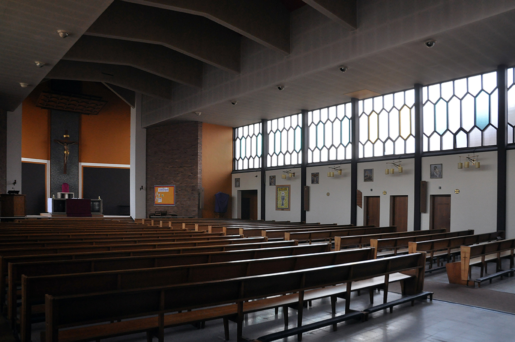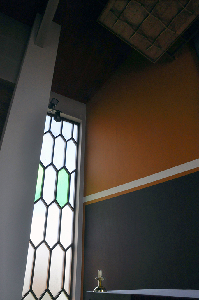 Thanks to Father Tierney for his time and permission to snap the interior. It was a calm space, the large open volume side lit by high octagonal honeycomb modular windows. The elegant plain pitched concrete gambrel roof beams a simple engineered solution.
