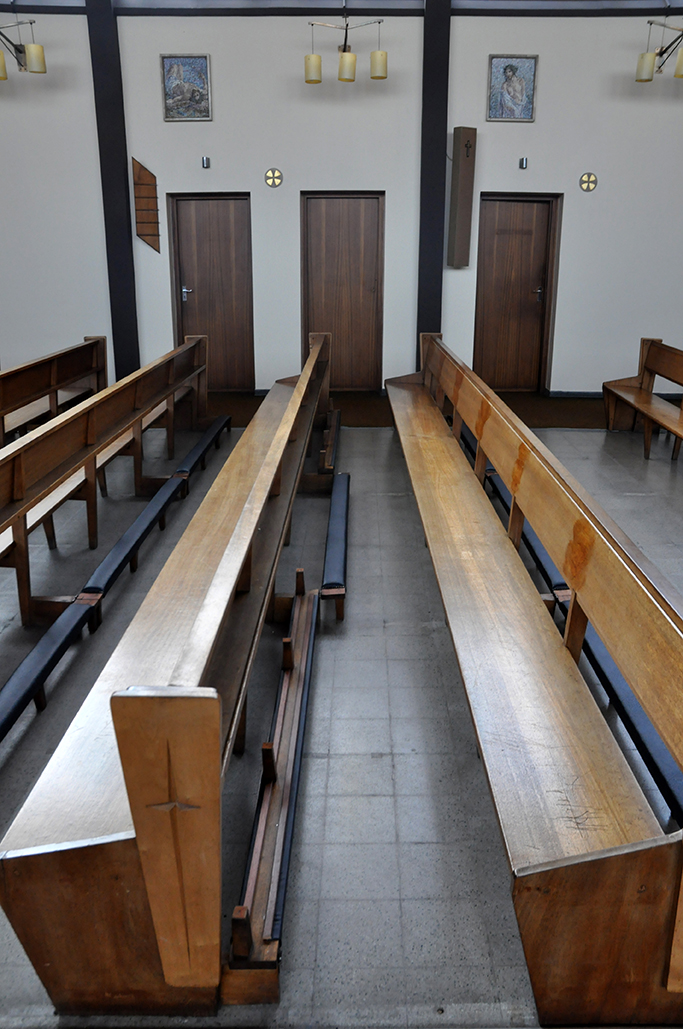 The altar and apse beautifully restrained in colour form and choice of materials. The design and detailing on the pews so warm and understated.