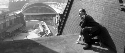 Martineau makes his way across the rooftops in pursuit of Starling. Looking down on Oxford Road station at the end of Station Approach off Whitworth Street.