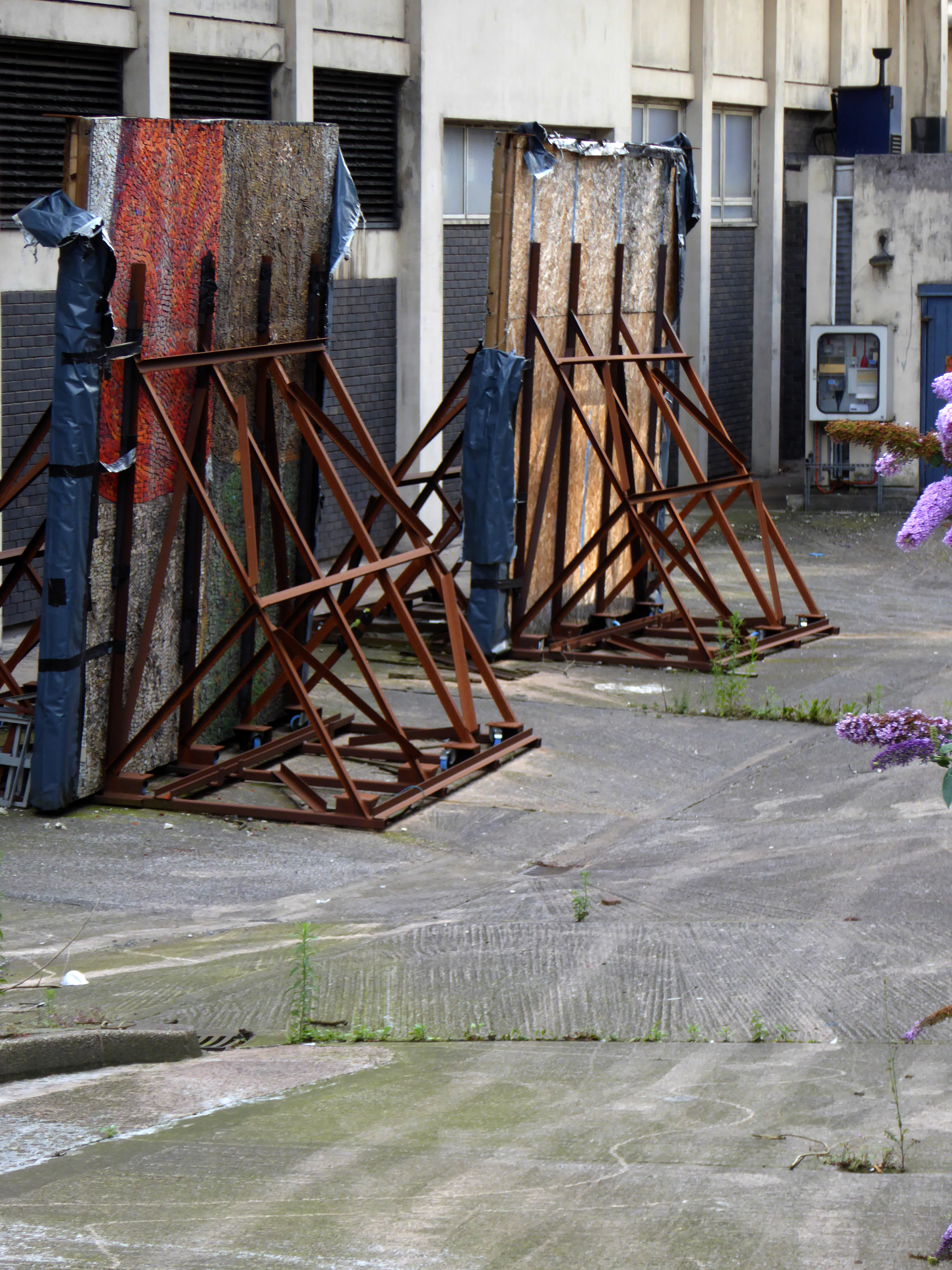 The mosaic, `The Alchemist’s Elements’, in the entrance colonnade, has now been safely removed from the building and are being stored securely on campus until the building works are complete.