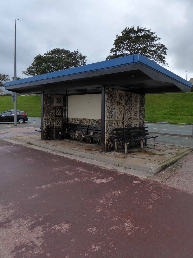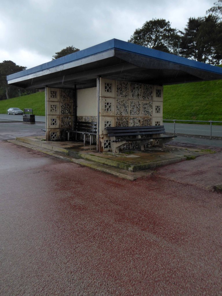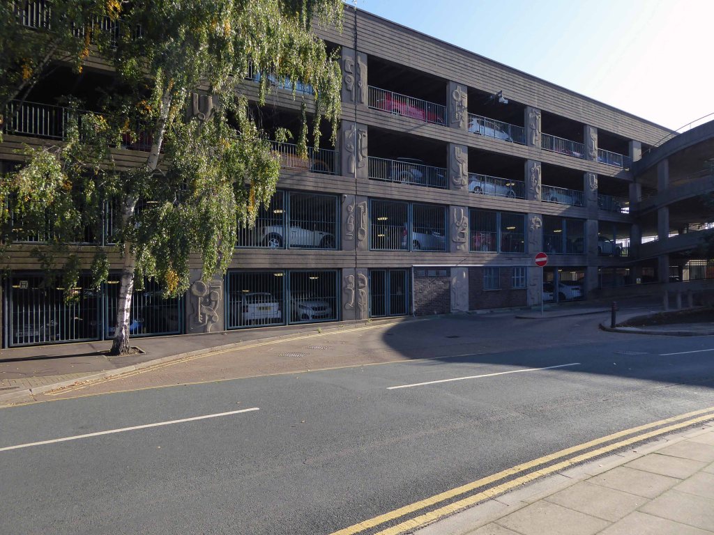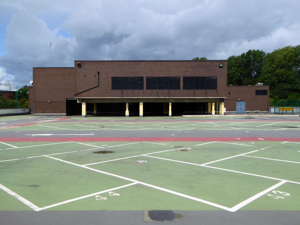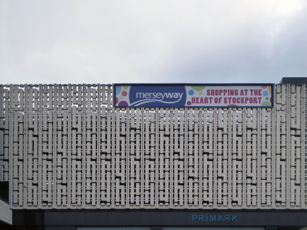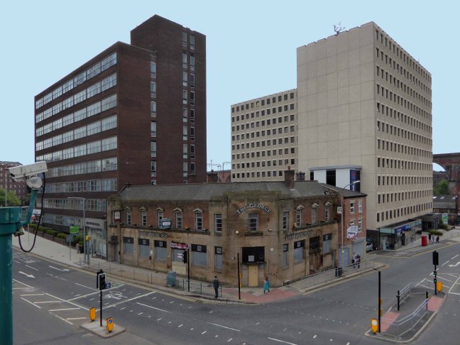 Over the road and up onto the elevated car parking space above Merseyway where we can catch sight of The George an inter-war pub now permanently tinned up.