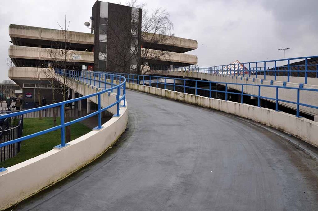 The car park extends across the whole upper level of the precinct. – an accessible Ballardian Concrete Island.