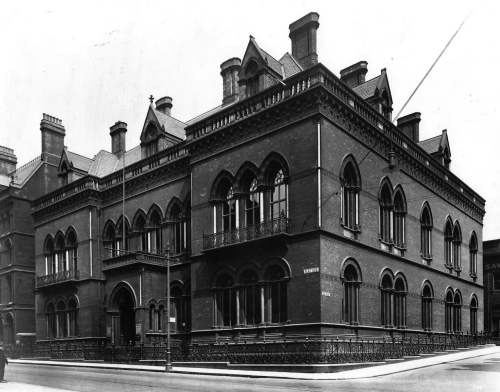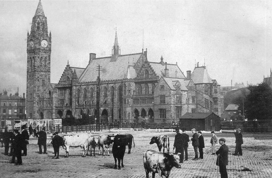 Widely recognised as being one of the finest municipal buildings in the country – built in the Gothic Revival style at a cost of £160,000 in 1871. The architect, William Henry Crossland, was the winner of a competition held in 1864 to design a new Town Hall. It had a 240 foot clock tower topped by a wooden spire with a gilded statue of Saint George and the Dragon, both of which were destroyed by fire on 10 April 1883, leaving the building without a spire for four years. A new 190 foot stone clock tower and spire in the style of Manchester Town Hall was designed by Alfred Waterhouse, and erected in 1887.