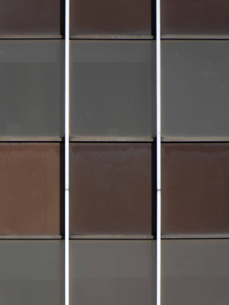 Seen from afar your are hit by its impressive rear elevation, with a distinctive grid defined by the slender window frames and a restrained yet earthy palette.