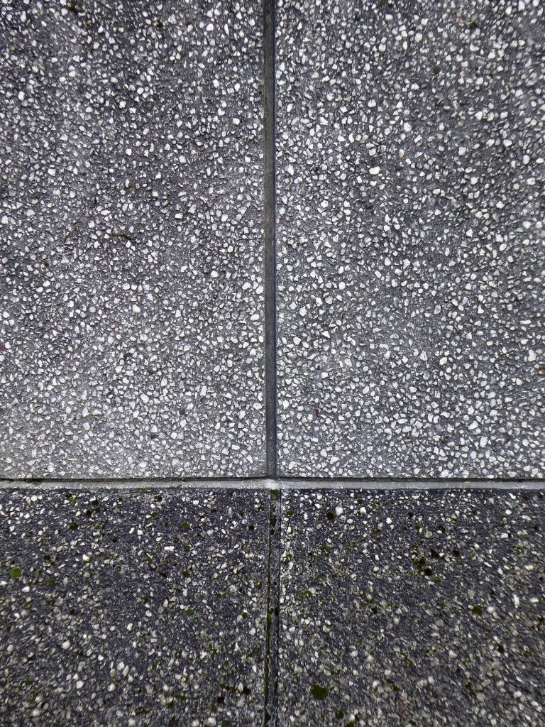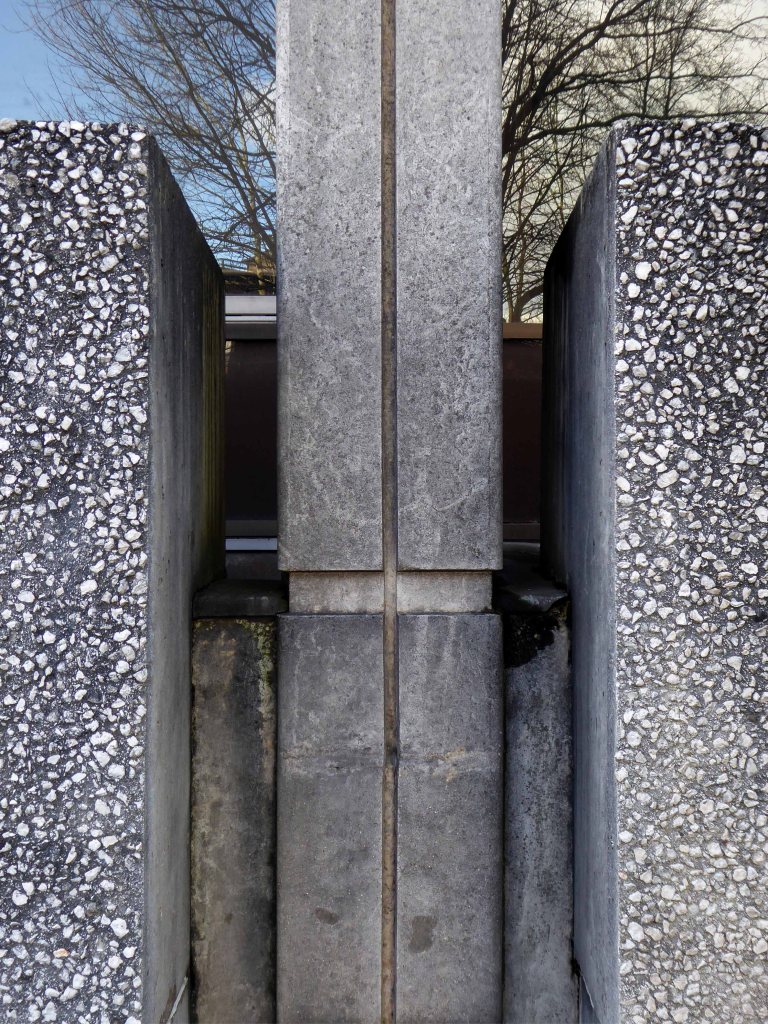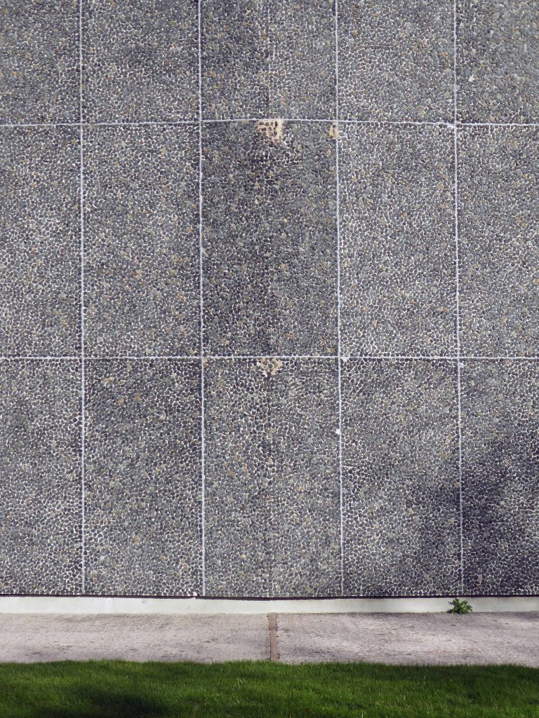The front elevation is of concrete, constructed with panels of a rough grey aggregate.