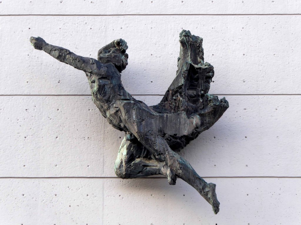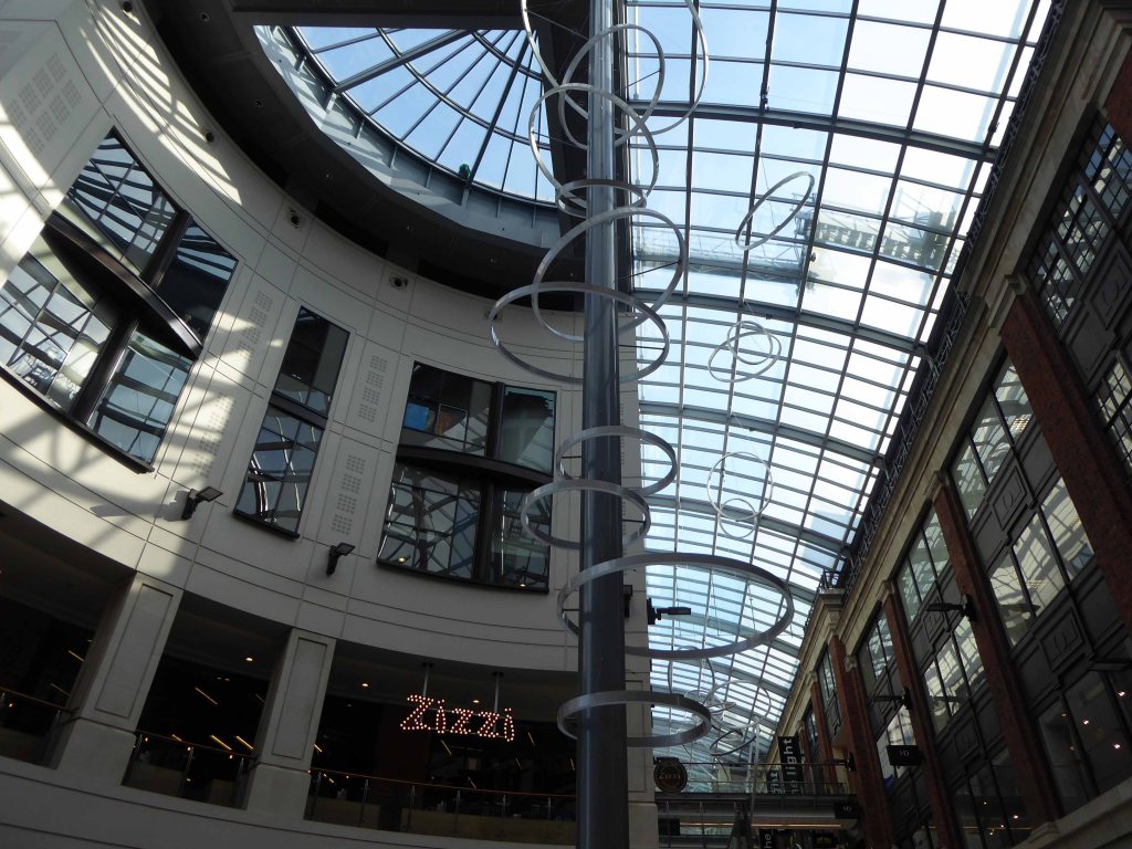 Originally on the wall of the Midland Bank building in London before the building was was sold in the early eighties. It was saved from potentially being sold for scrap and the four and a half ton sculpture has been flying high on campus since 1983.