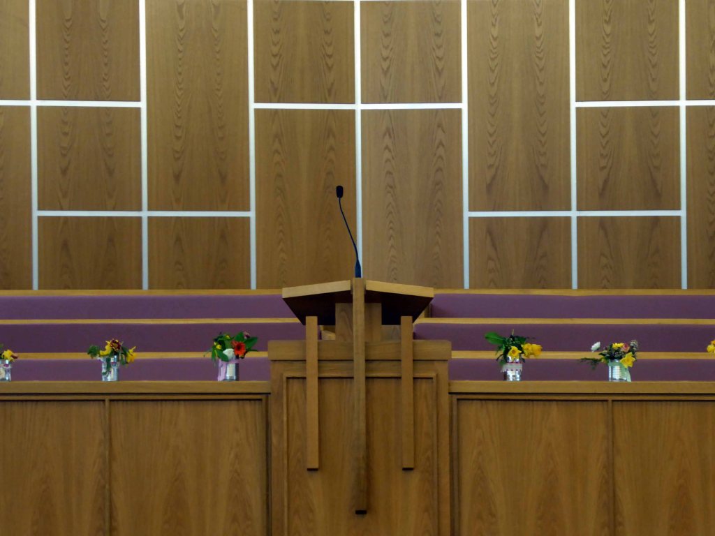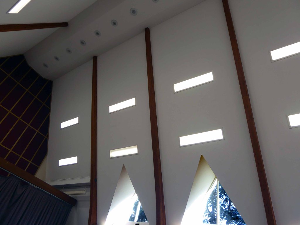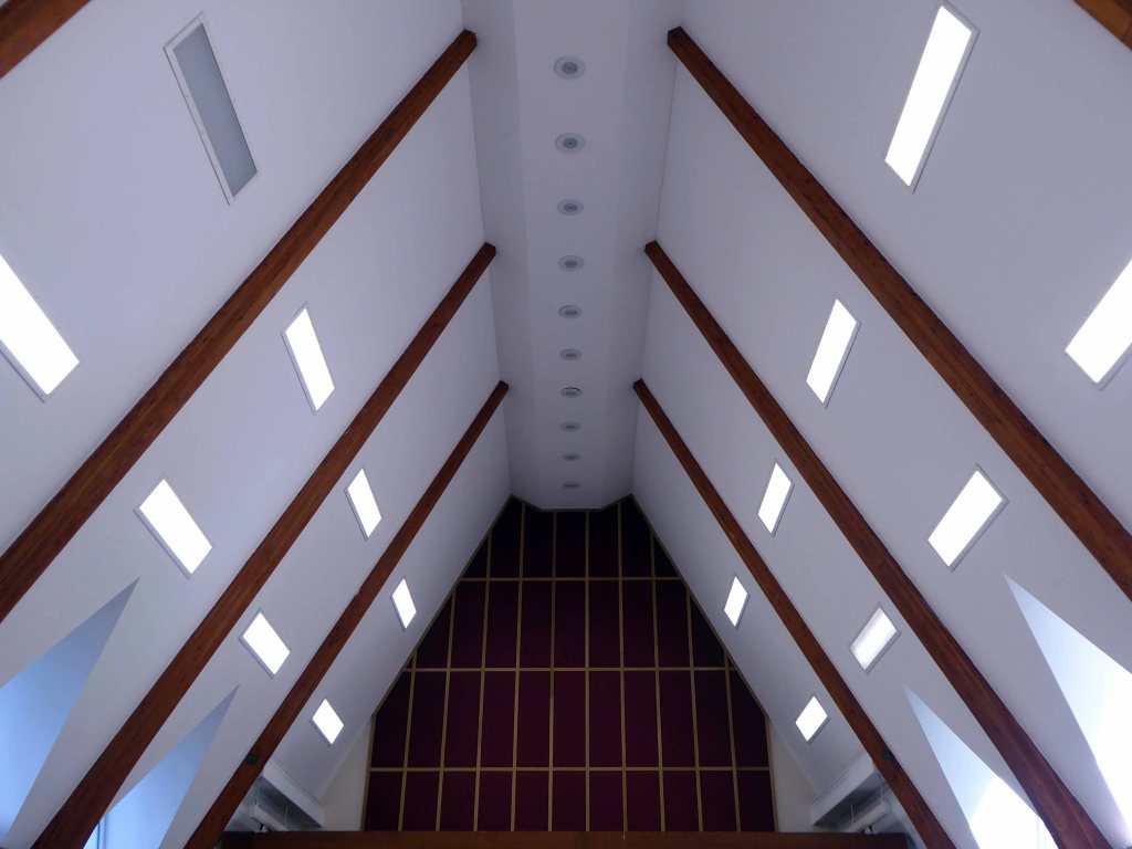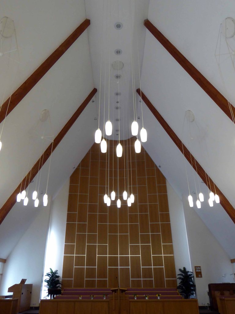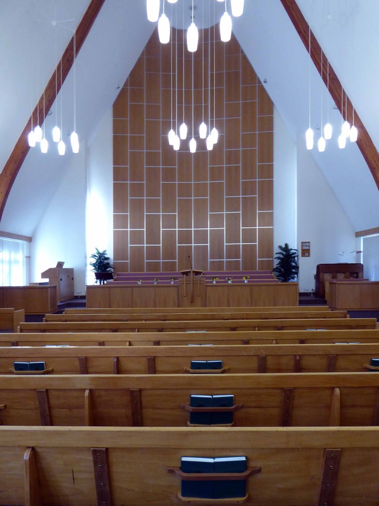 The front portion of the main body is given over to worship, furnished with light wood pews, altar and panelling.