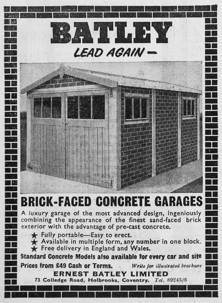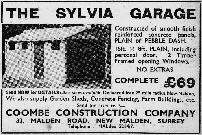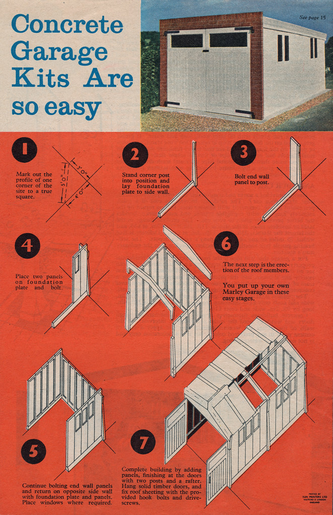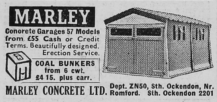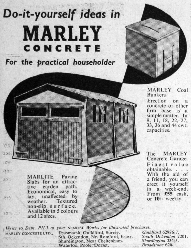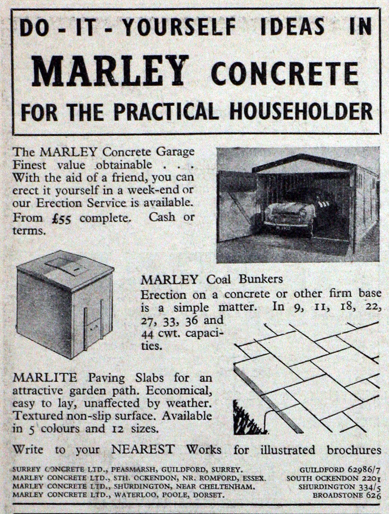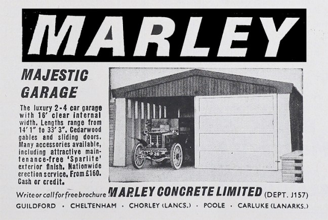 The first concrete kit garages appeared in 1952, manufactured by Marley, earlier models had been constructed from wood, asbestos, corrugated iron or galvanised steel.
