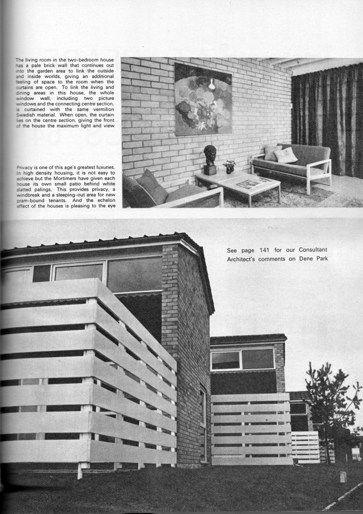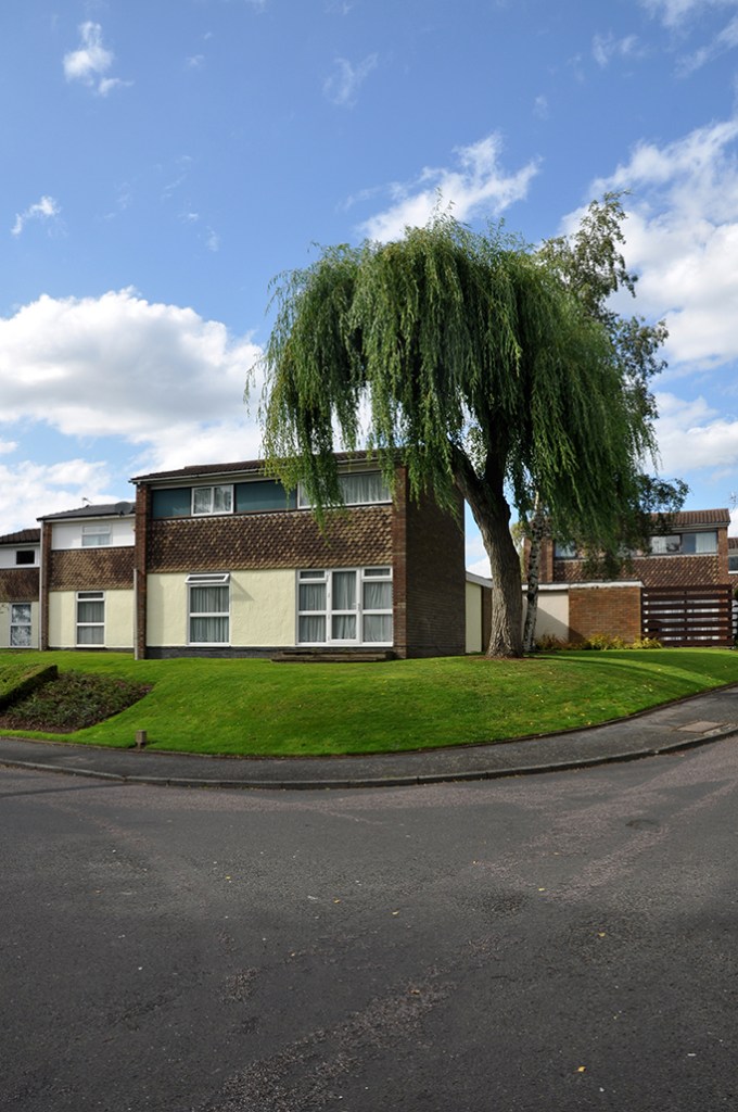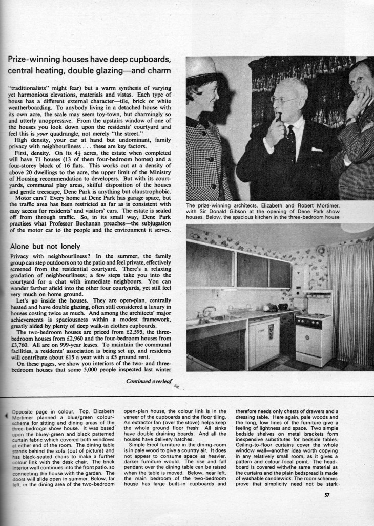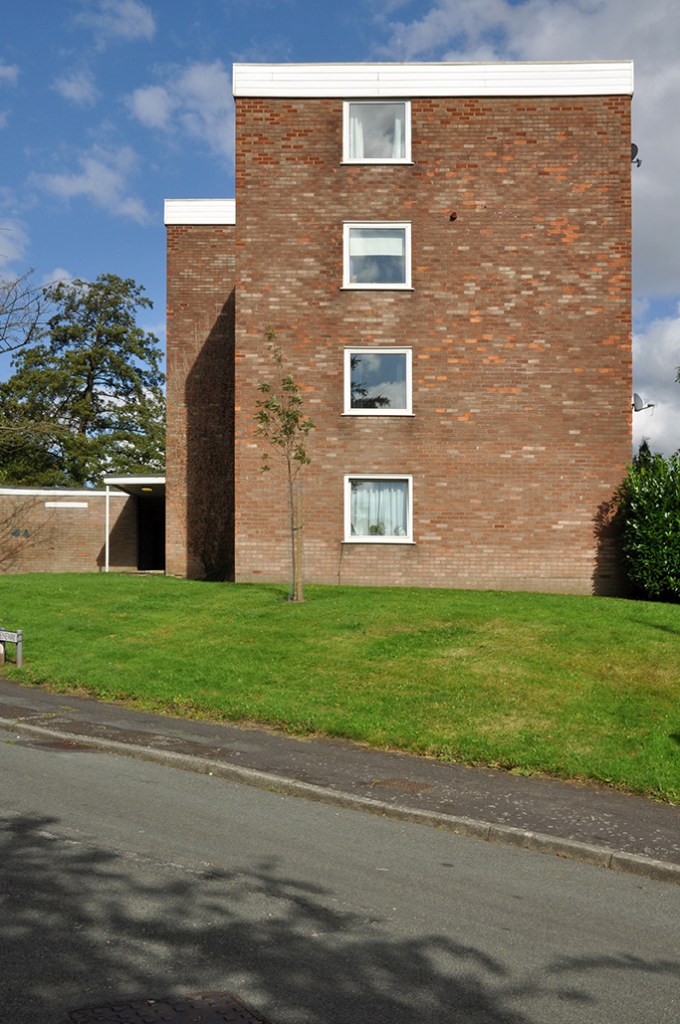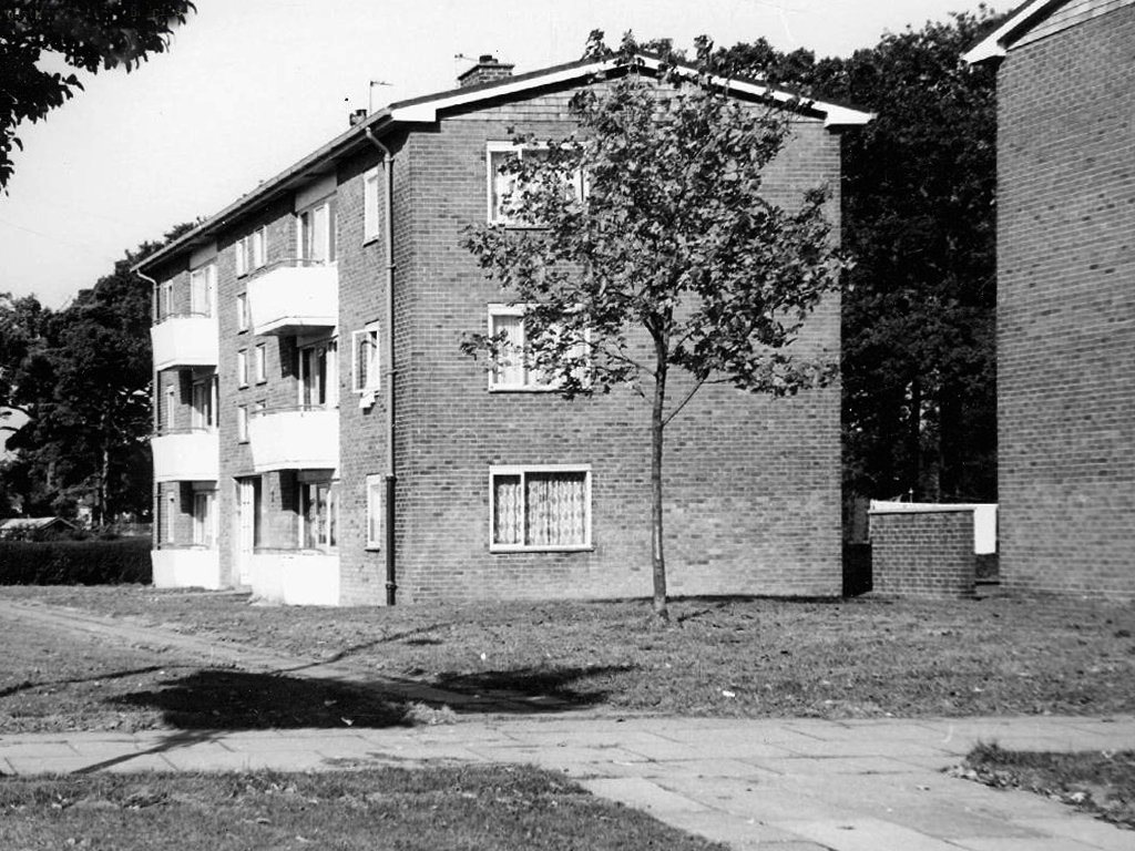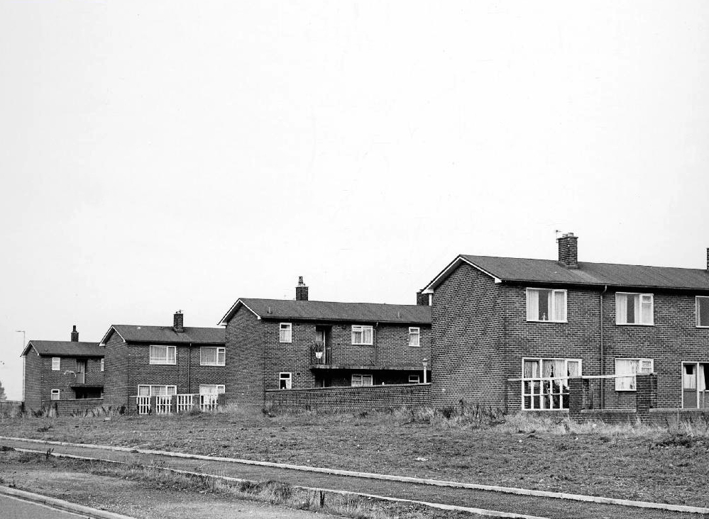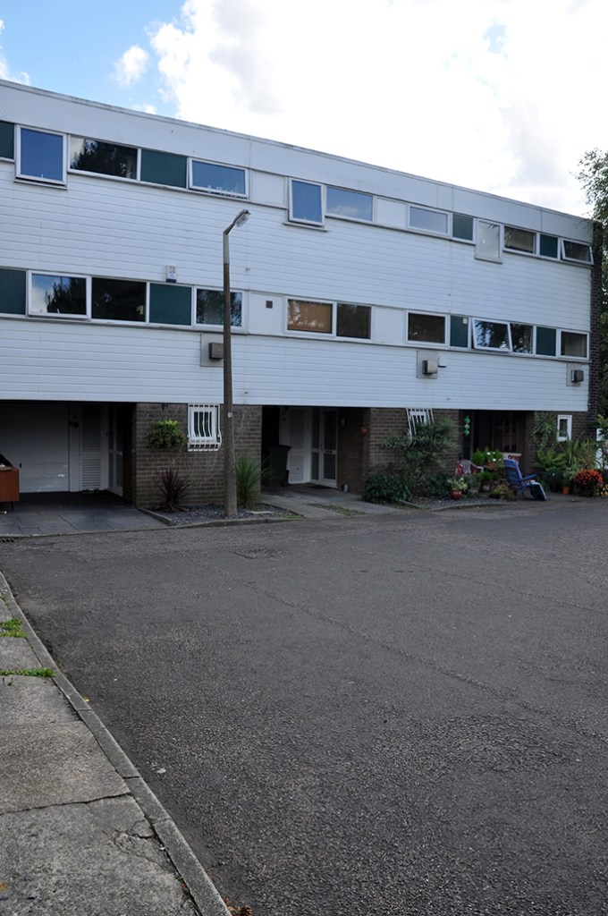 Very much in the tradition of the Span Estates, it consists of small groups of two and three storey terraced homes, with communal open, well tended front gardens. At the entrance to the estate stands a single low tower block of flats.