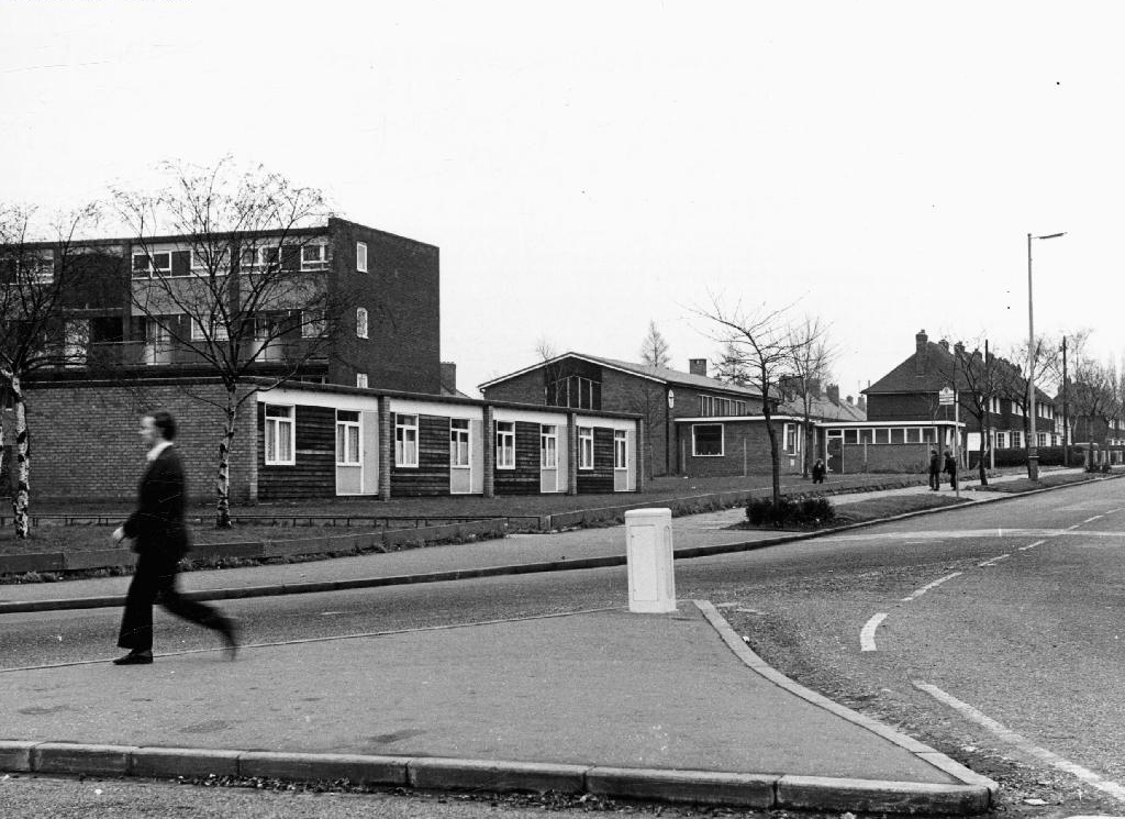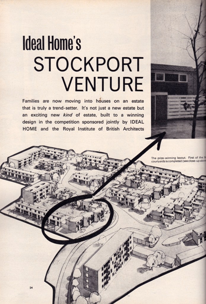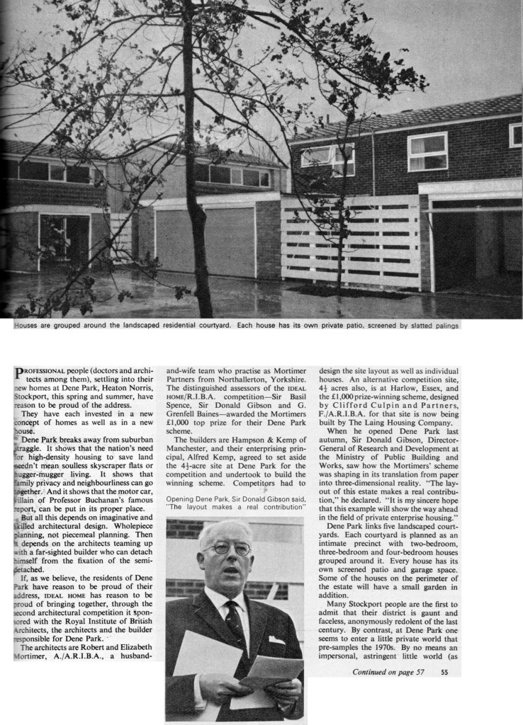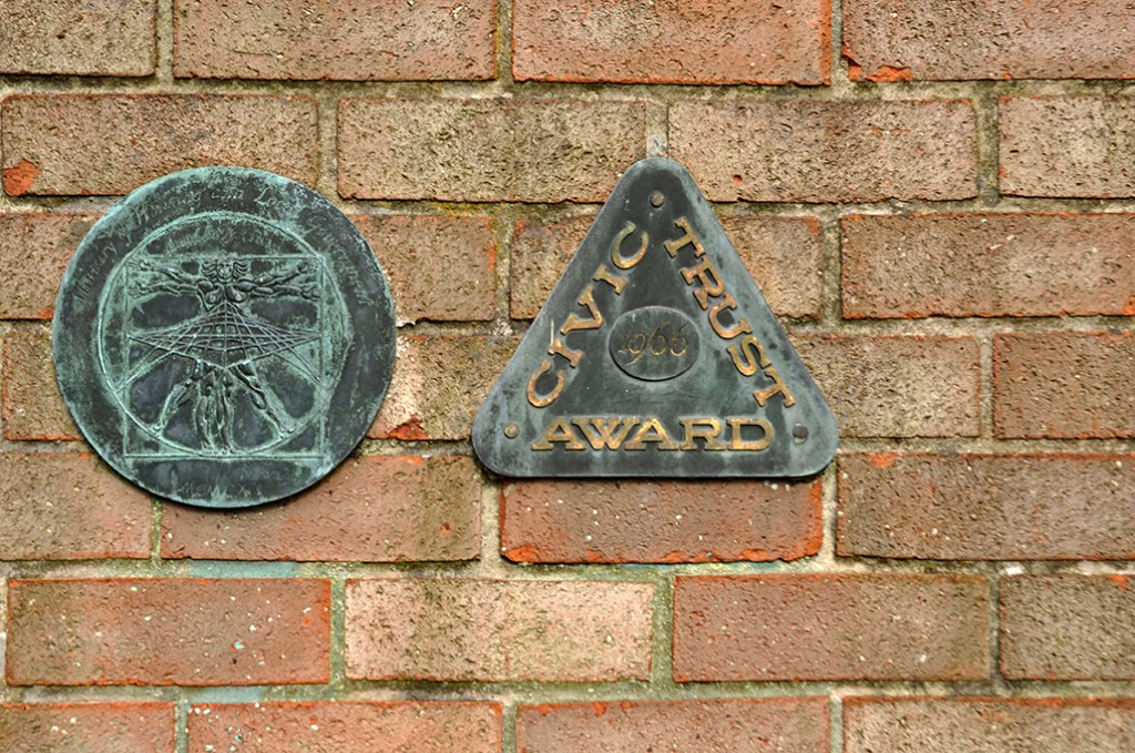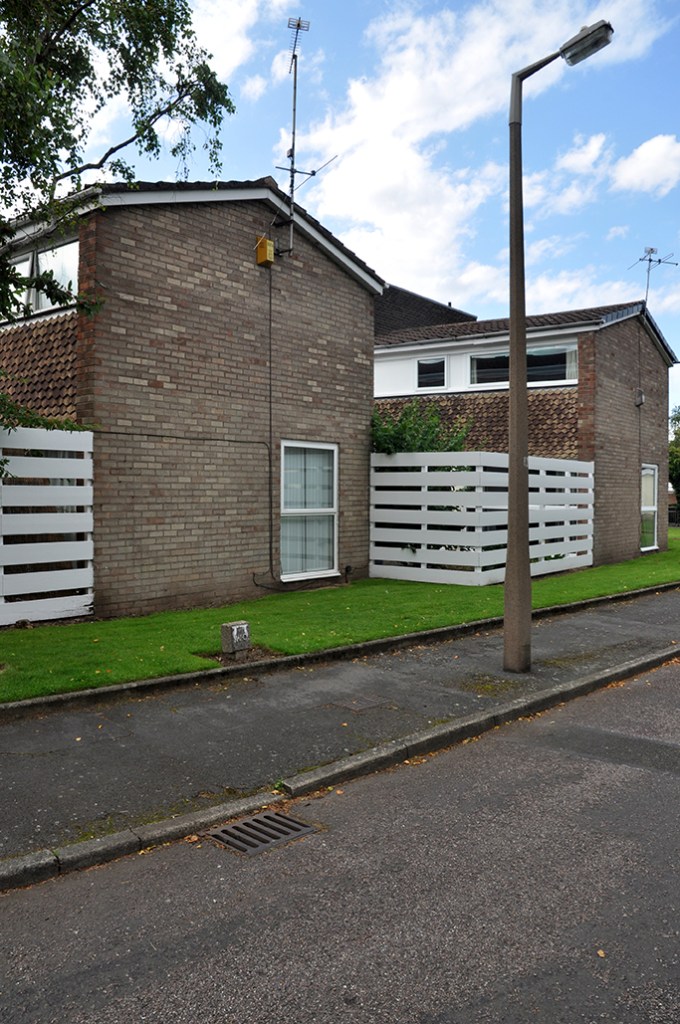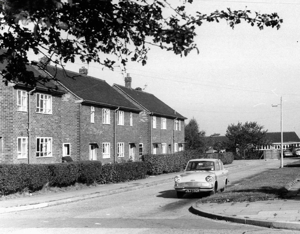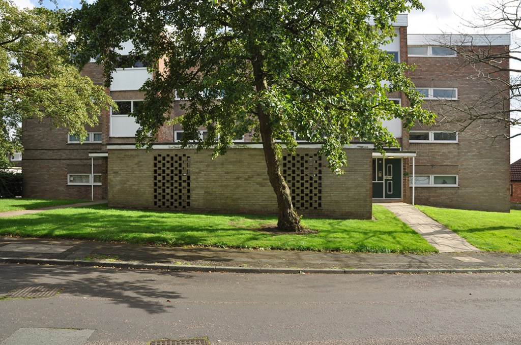 Very much in the tradition of the Span Estates, it consists of small groups of two and three storey terraced homes, with communal open, well tended front gardens. At the entrance to the estate stands a single low tower block of flats.