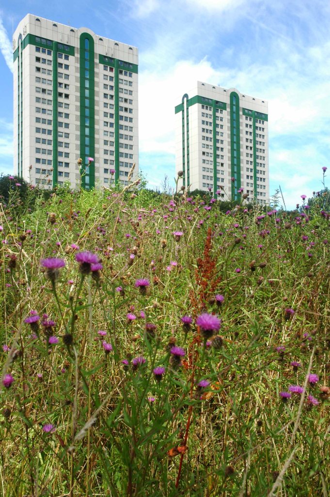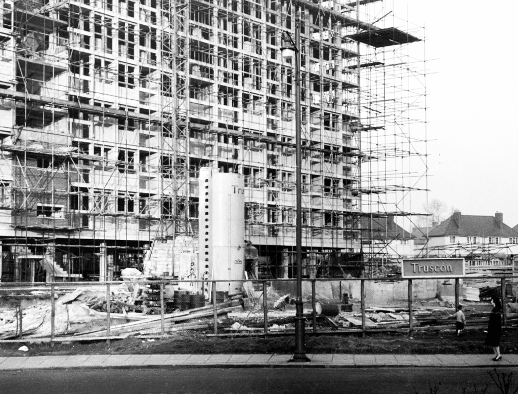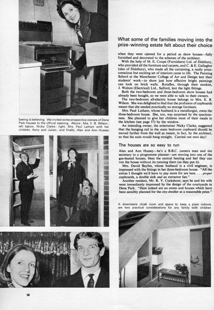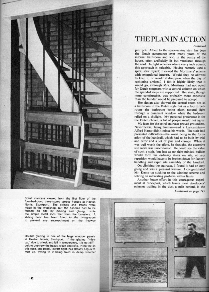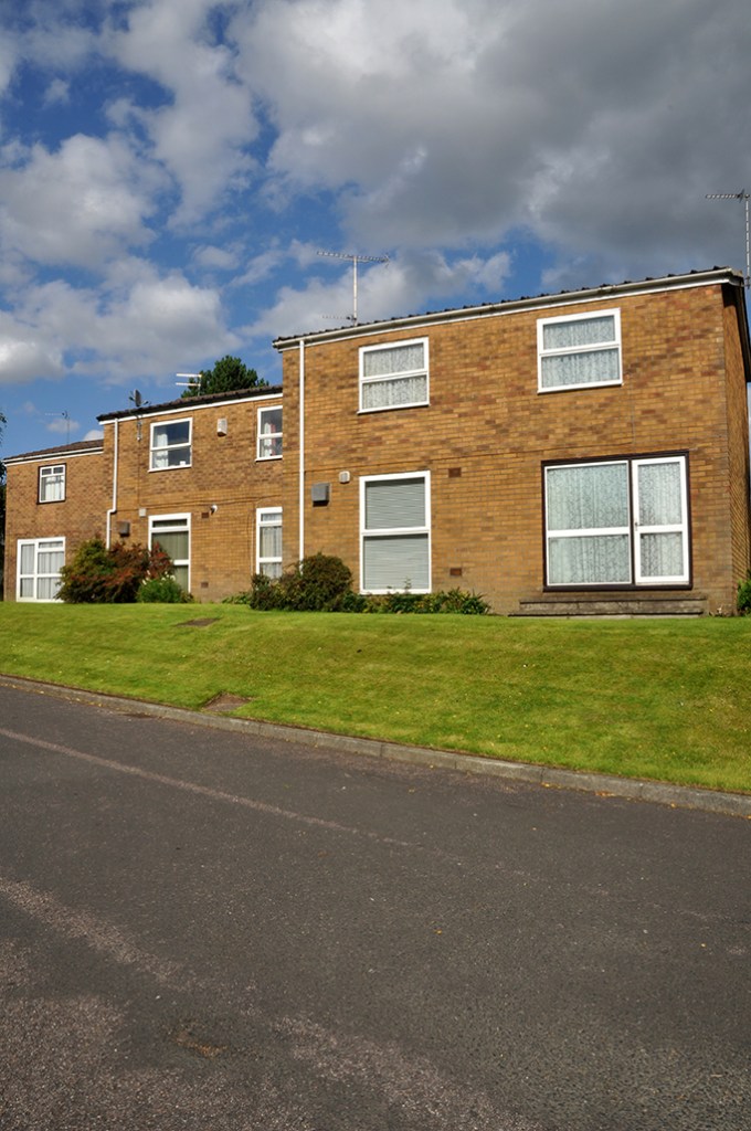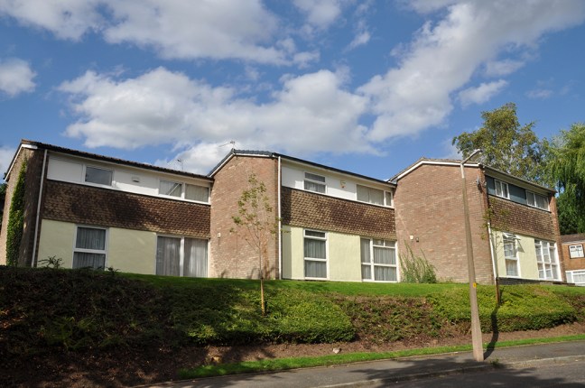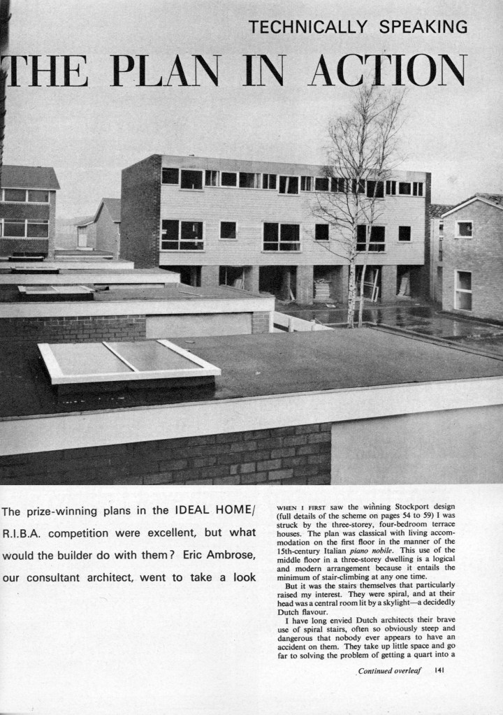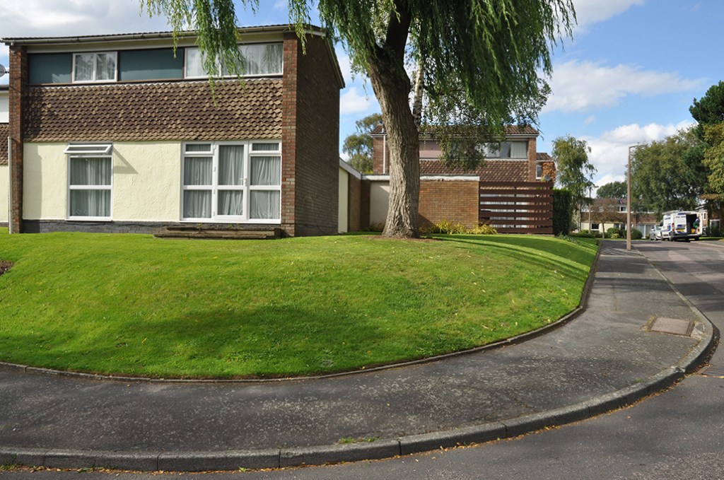 Very much in the tradition of the Span Estates, it consists of small groups of two and three storey terraced homes, with communal open, well tended front gardens. At the entrance to the estate stands a single low tower block of flats.