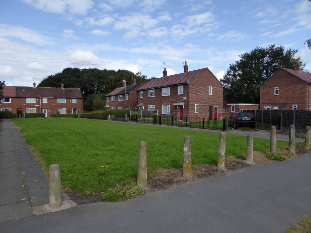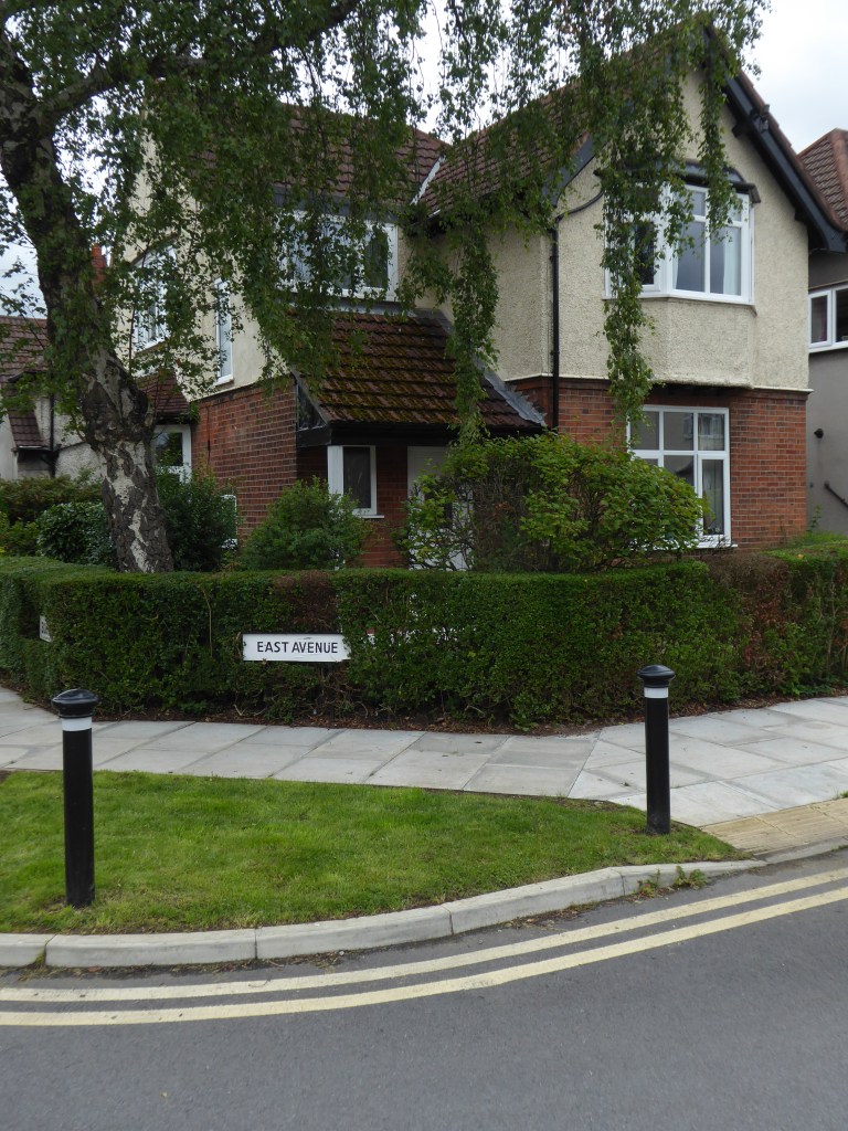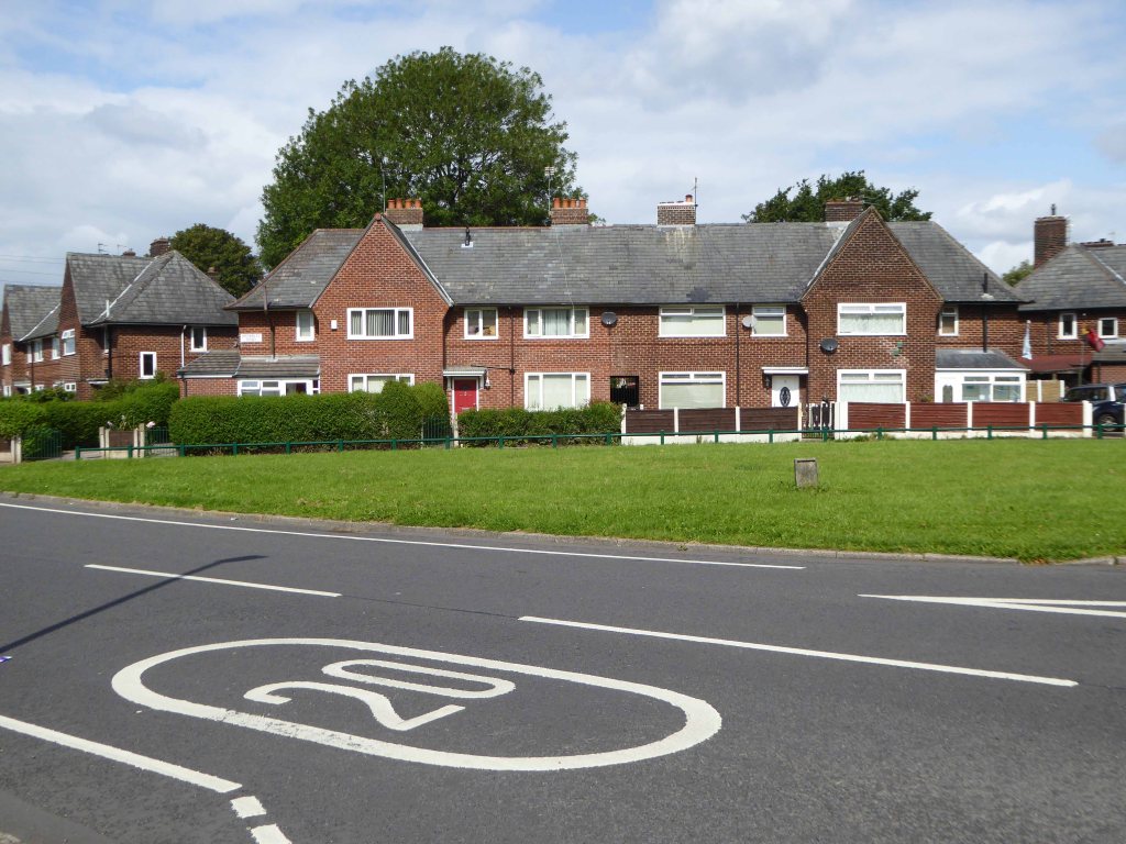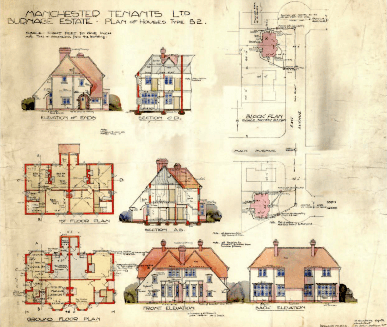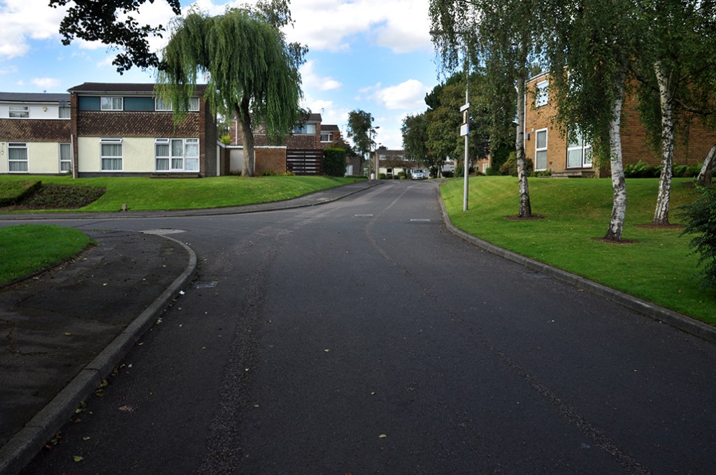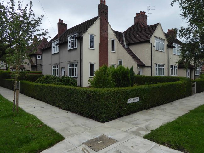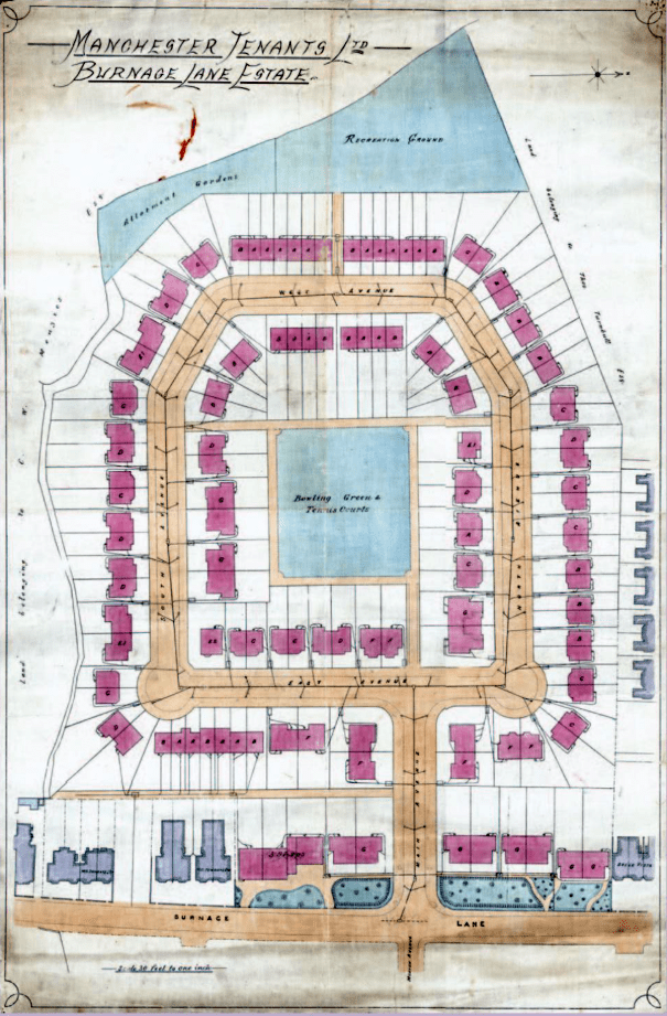 The housing estate of 136 houses known as Burnage Garden Village, a residential development covering an area of 19,113sqm off the western side of Burnage Lane in the Burnage ward. The site is situated approximately six kilometres south of the city centre and is arranged on a broadly hexagonal layout with two storey semi-detached and quasi detached dwelling houses situated on either side of a continuous-loop highway. The highway is named after each corresponding compass point with two spurs off at the east and west named Main Avenue and West Place respectively. Main Avenue represents the only access and egress point into the estate whilst West Place leads into a resident’s parking area.