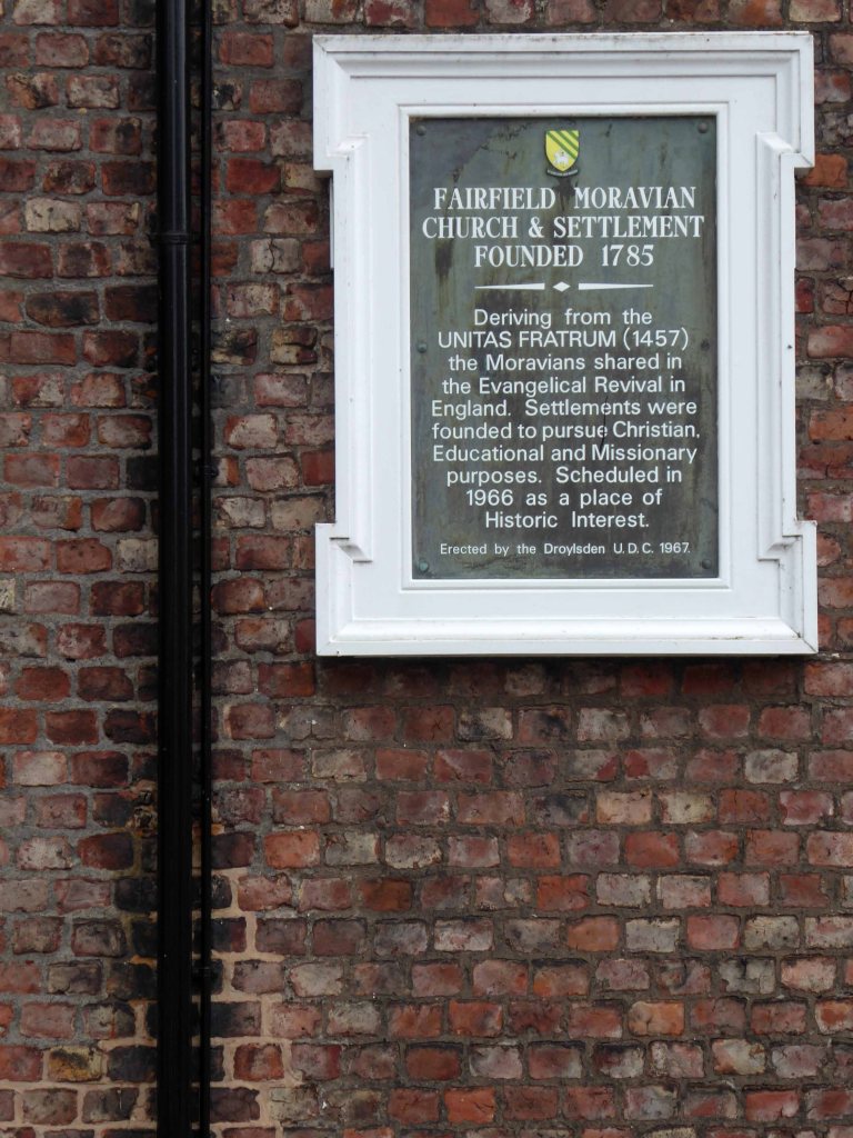 The Unitas Fratrum or Moravian Church is an international Protestant Christian group which originated from the followers of Jan Hus in Bohemia (now part of the Czech Republic) during the 15th century. As a result of persecution, the group eventually re-established itself in Saxony in the early 18th century, and it is from there that followers first came to this country in the 1730s, with the intention to go on to carry out missionary work in America and the Caribbean. A decision was taken to establish the first Moravian Settlement in England at Fulneck in Yorkshire in 1744. The first Moravian settlement to be located in Tameside was in Dukinfield during the 1740s. It was there that they laid the foundation stone for their chapel at the top of Old Road in May 1751. By 1783, 40 years after their first arrival in Tameside, the lease on their land at Dukinfield expired, and negotiations for a new one proved difficult. This resulted in the purchase and removal of the community to a 54 acres site at Broad Oak Farm in Droylsden where they established a new settlement known as Fairfield.