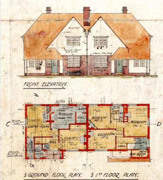 The layout was designed by J Horner Hargreaves. Houses are loosely designed to Arts and Crafts principles, chiefly on account of being low set and having catslide roofs.