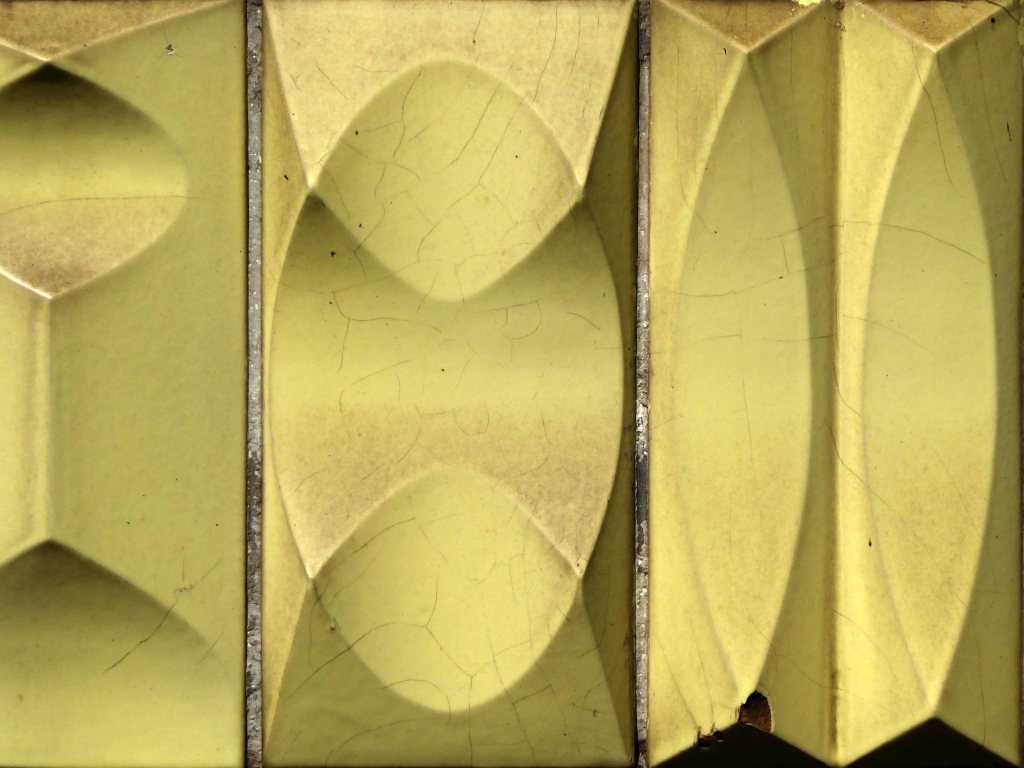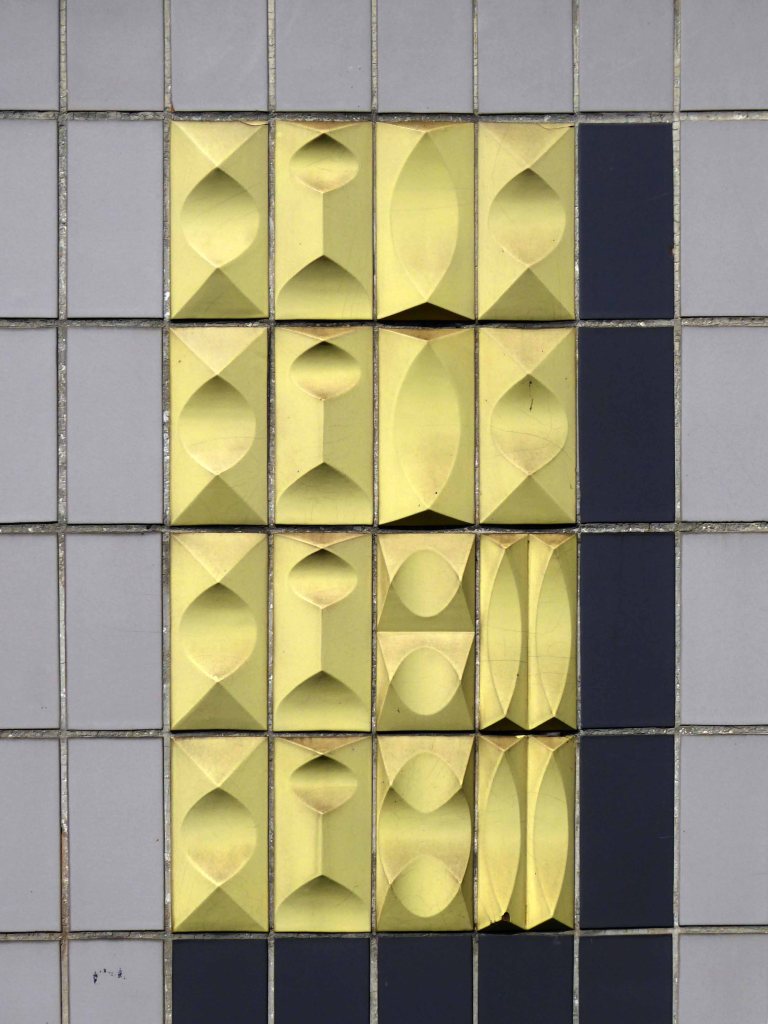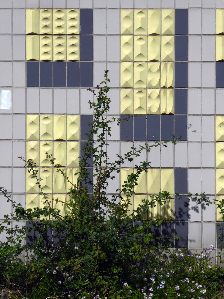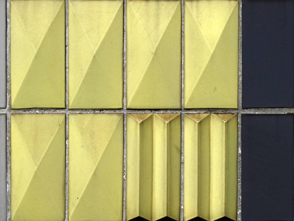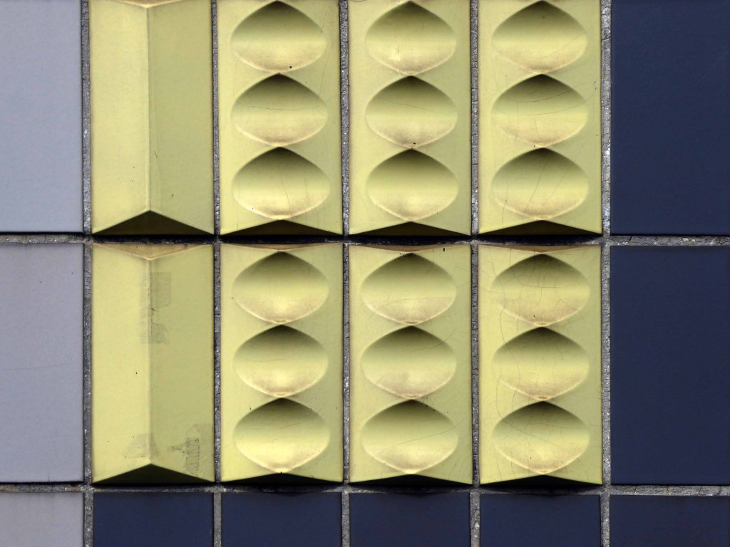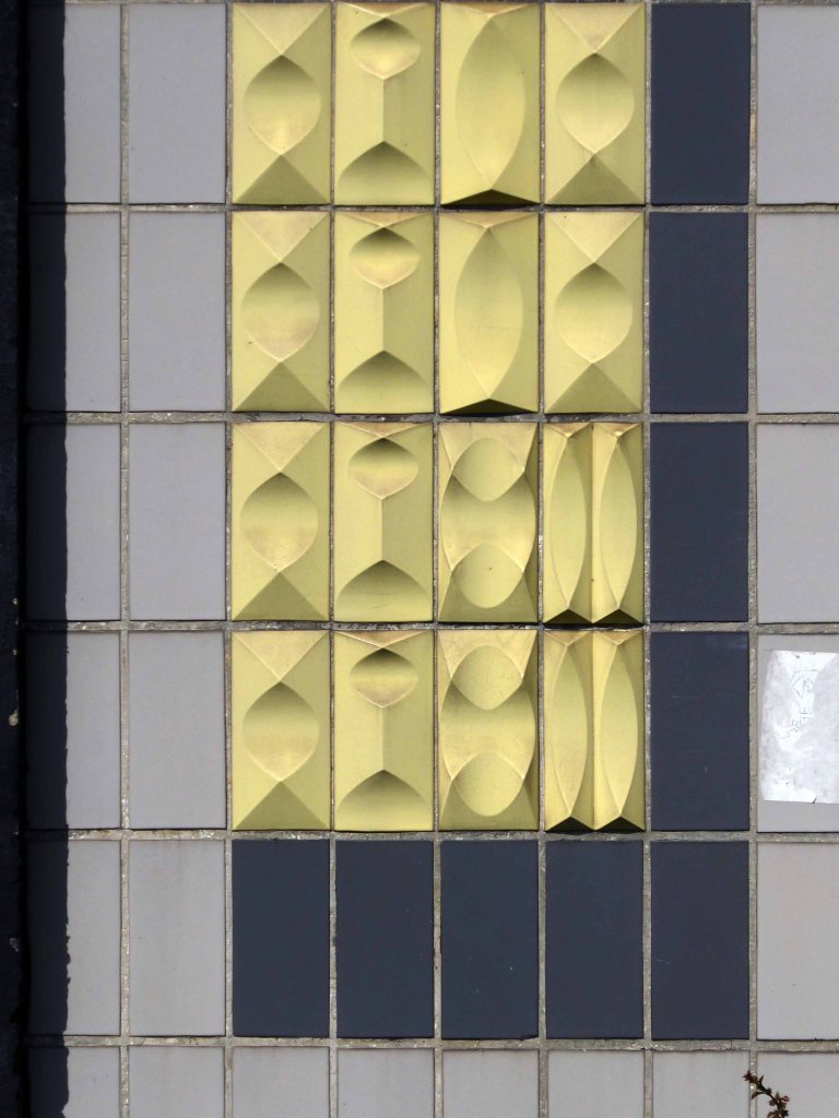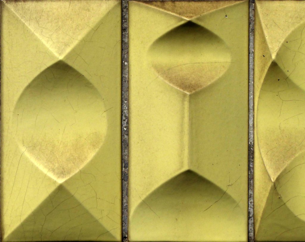What’s more there is a panel of ceramic tiles many with a pronounced profile in relief – a fugue in lemon, grey and a deep Prussian Blue.