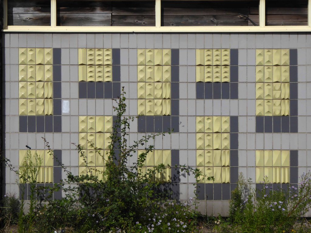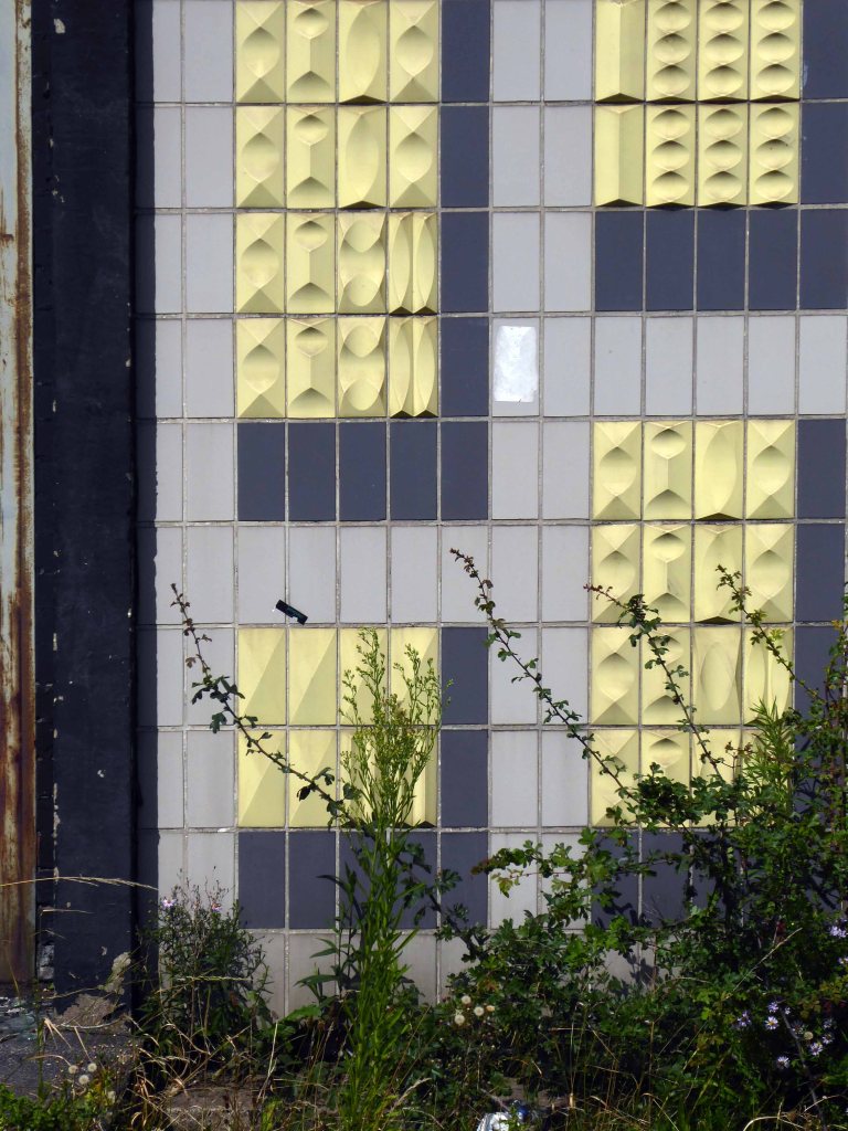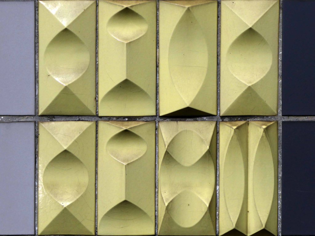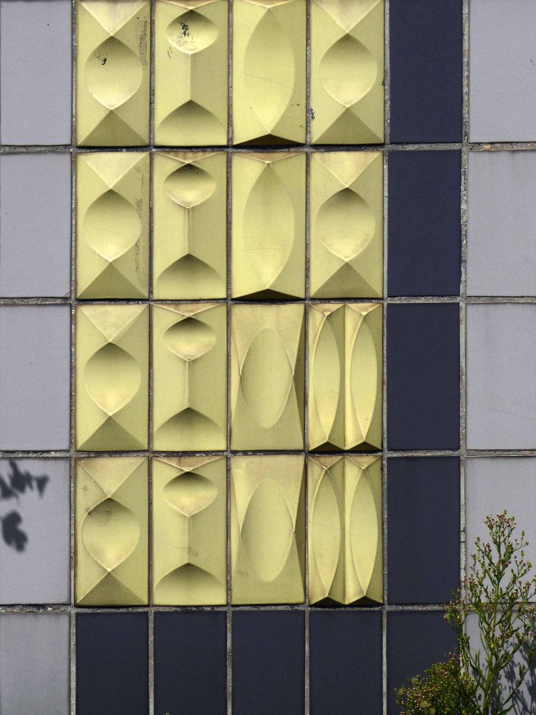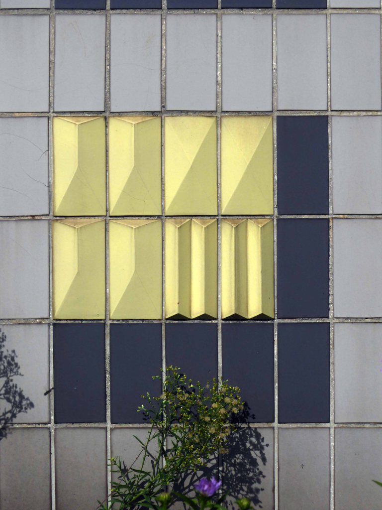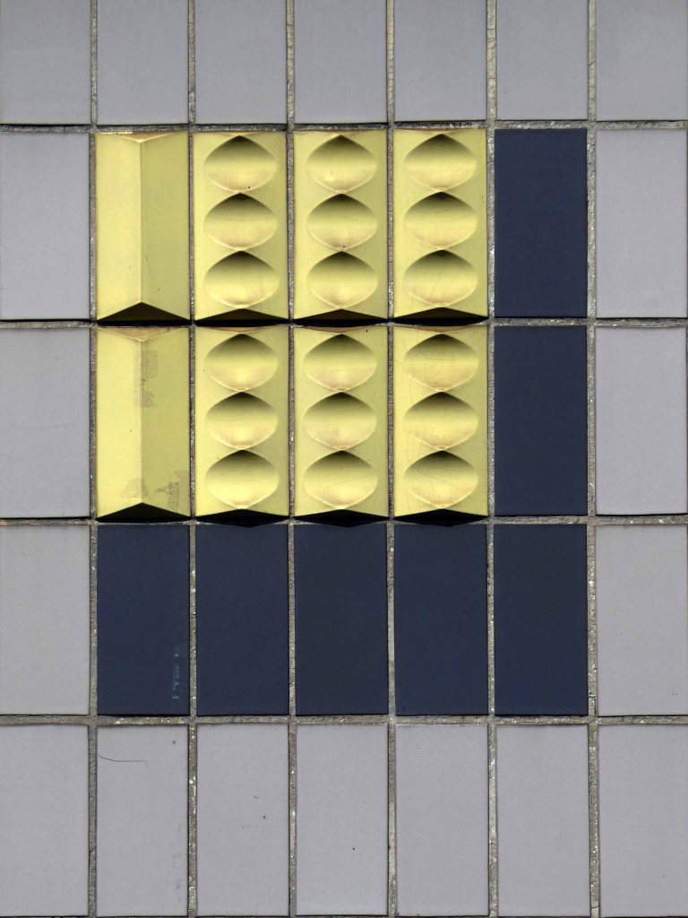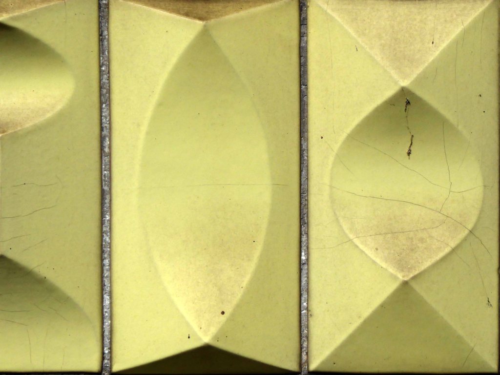What’s more there is a panel of ceramic tiles many with a pronounced profile in relief – a fugue in lemon, grey and a deep Prussian Blue.