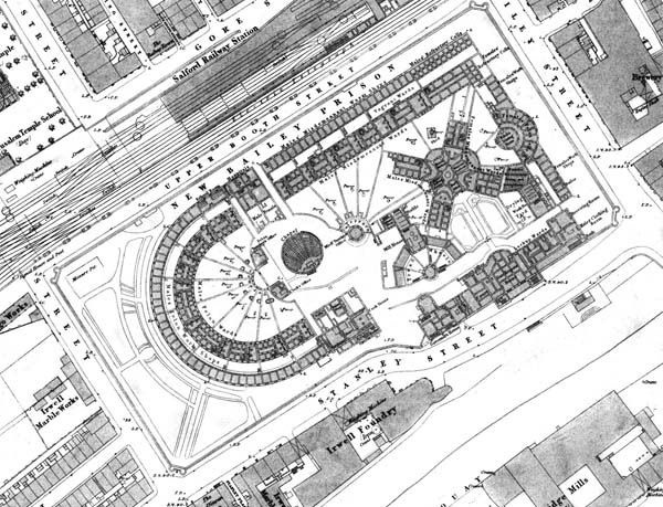 Before that the land, between New Bailey Street and Irwell Street and between the Irwell and the railway viaducts, was home to the New Bailey Prison. It was built in 1787 and operated until Strangeways Prison was built to replace it. The New Bailey Prison closed in 1868.
