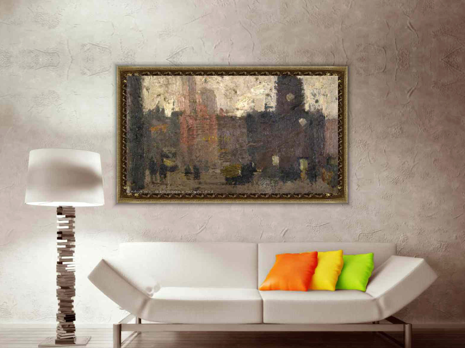 Castlegate, Salford; buildings are simplified to simple blocks of colour against the pale sky, indistinct dark figures walk the streets depicted in the bottom left corner. Sacred Trinity church can be seen to the right of the painting, with other surrounding buildings in red and light brown. The result is a depiction of a busy street in an industrial city context, to the left a dark shape extends vertically across the canvas.