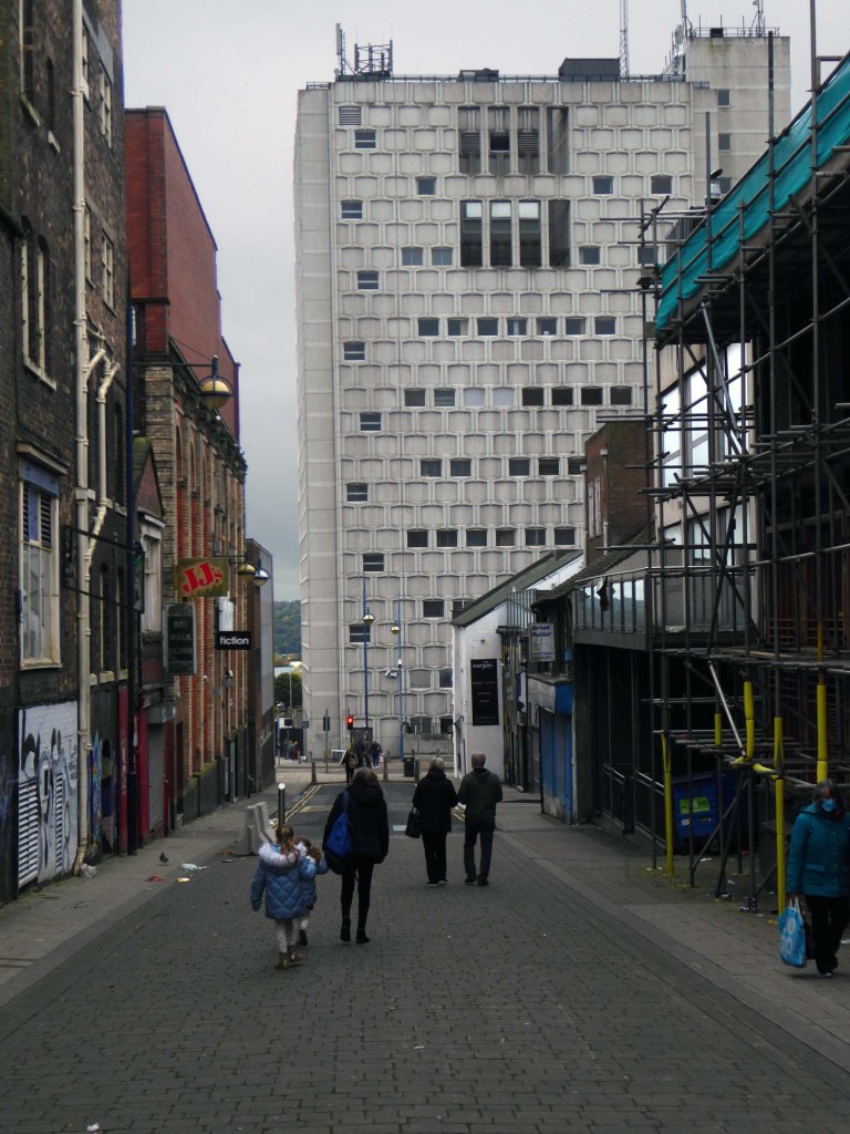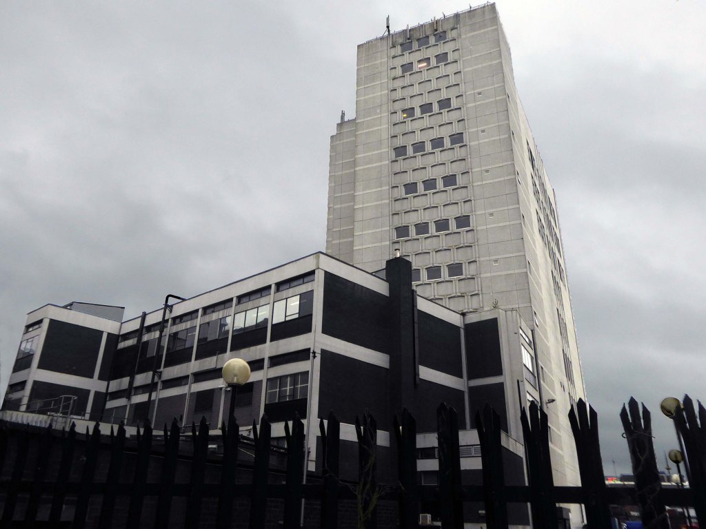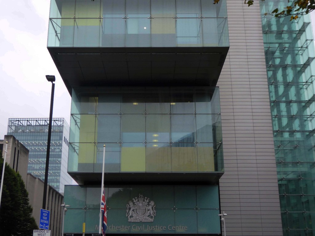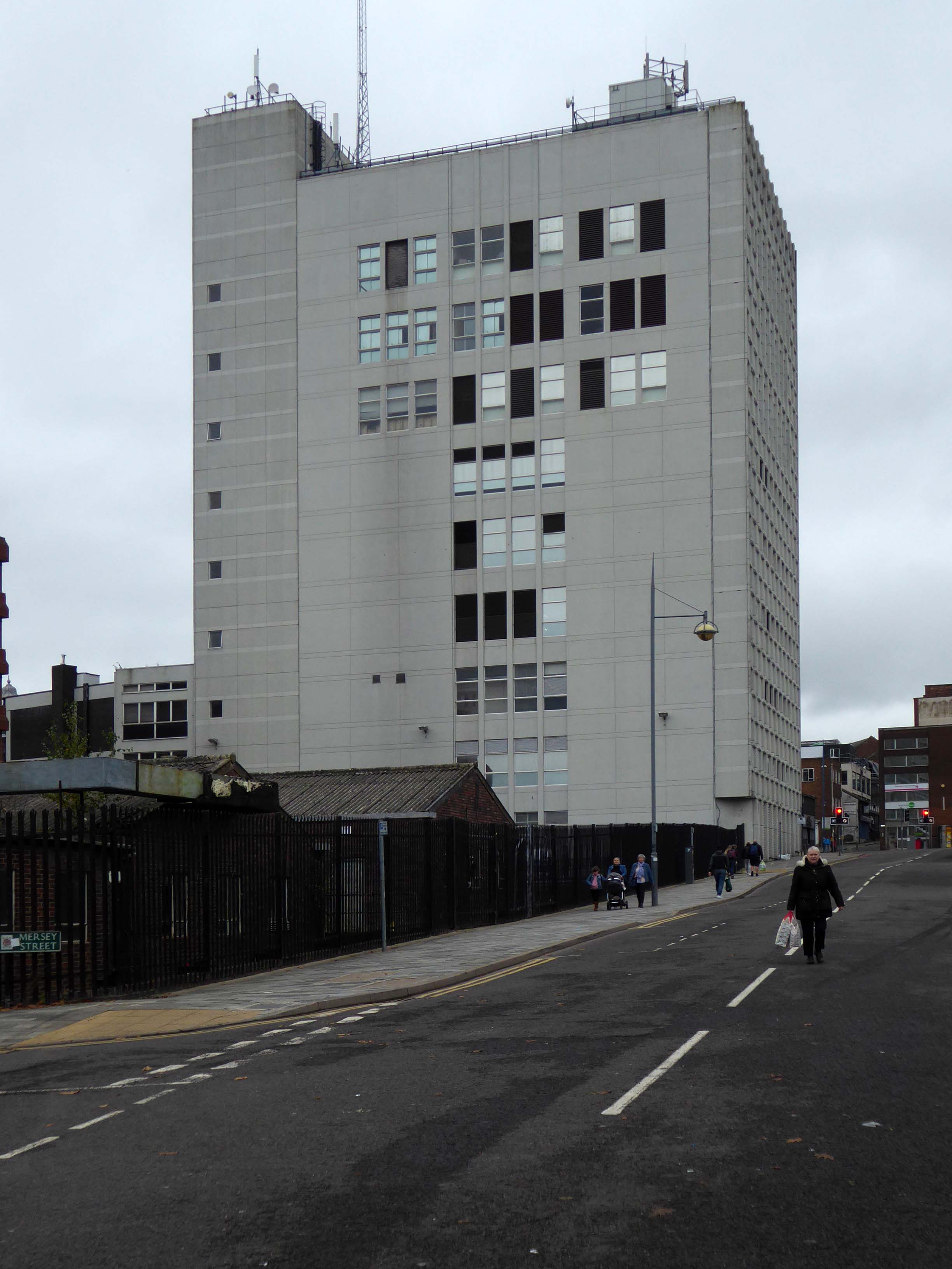 To the left the Manchester Civil Justice Centre 2007 by Denton Corker Marshall.